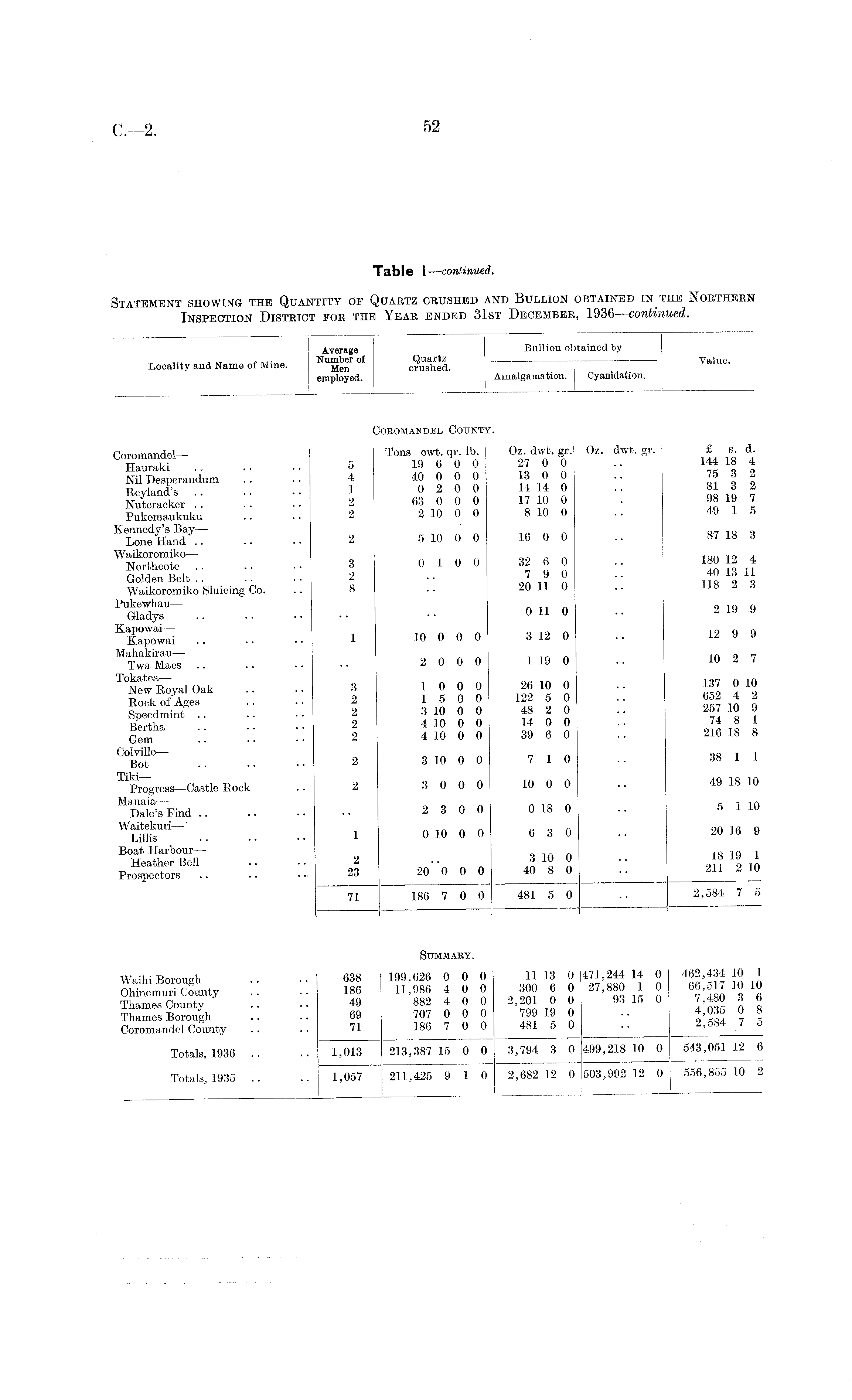 Table 1—continued. Statement showing the Quantity of Quartz crushed and Bullion obtained in the Northern Inspection District for the Year ended 31st December, 1936—continued.