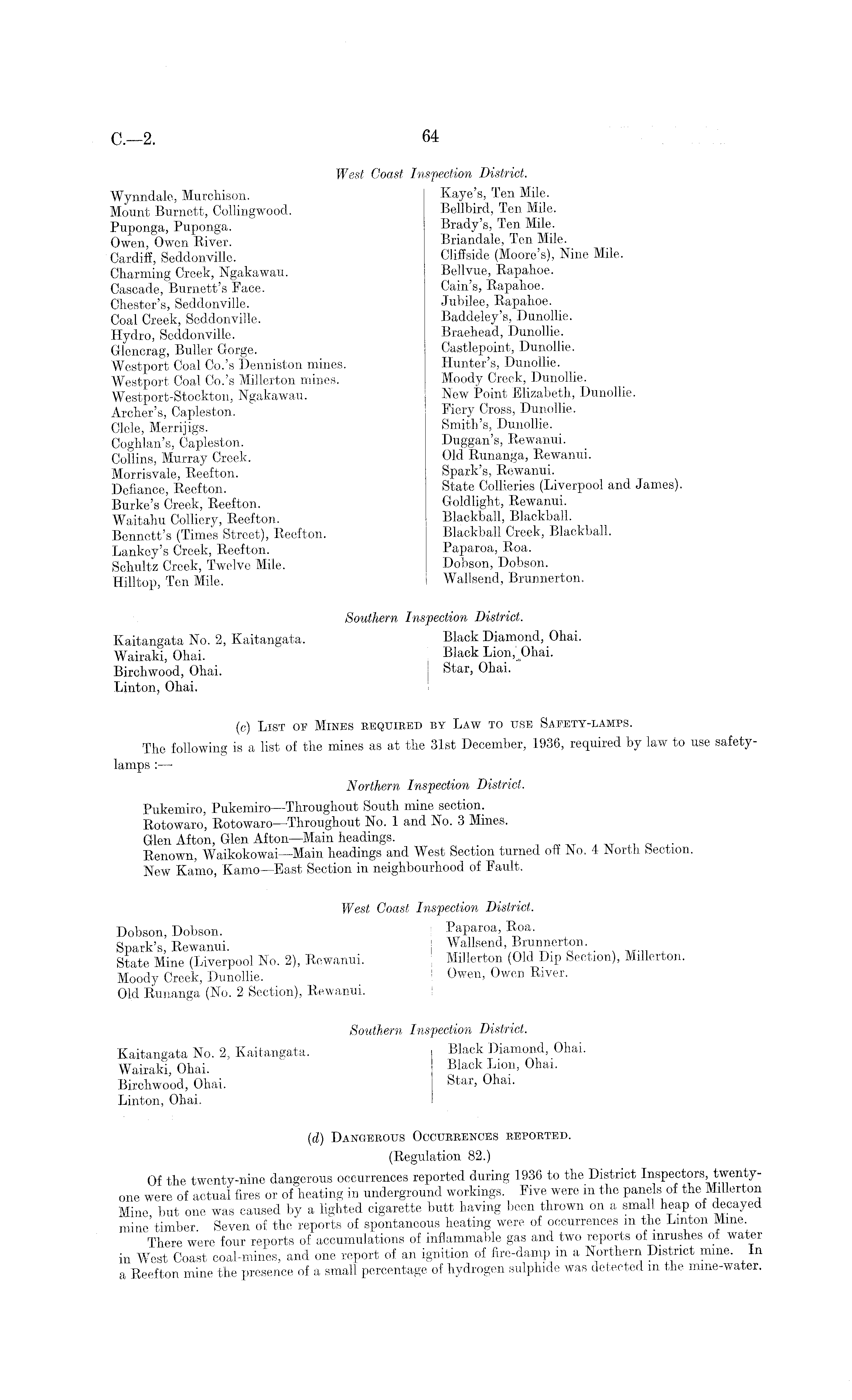 West Coast Inspection District. Wynndale, Murcliison. Kaye's, Ten Mile. Mount Burnett, Collingwood. Bellbird, Ten Mile. Puponga, Puponga. Brady's, Ten Mile. Owen, Owen River. Briandale, Ten Mile. Cardiff, Seddonville. Cliffside (Moore's), Nine Mile. Charming Creek, Ngakawau. Bellvue, Ra.pahoe. Cascade, Burnett's Face. Cain's, Rapahoe. Chester's, Seddonville. Jubilee, Rapahoe. Coal Creek, Seddonville. Baddeley's, Dunollie. Hydro, Seddonville. Braehead, Dunollie. Glencrag, Buller Gorge. Castlepoint, Dunollie. Westport Coal Co.'s Denniston mines. Hunter's, Dunollie. Westport Coal Co.'s Millerton mines. Moody Creek, Dunollie. Westport-Stockton, Ngakawau. New Point Elizabeth, Dunollie. Archer's, Capleston. Fiery Cross, Dunollie. Clele, Merrijigs. Smith's, Dunollie. Coghlan's, Capleston. Duggan's, Rewanui. Collins, Murray Creek. Old Runanga, Rewanui. Morrisvale, Reefton. Spark's, Rewanui. Defiance, Reefton. State Collieries (Liverpool and James). Burke's Creek, Reefton. Goldlight, Rewanui. Waitahu Colliery, Reefton. Blackball, Blackball. Bennett's (Times Street), Reefton. Blackball Creek, Blackball. Lankey's Creek, Reefton. Paparoa, Roa. Schultz Creek, Twelve Mile. Dobson, Dobson. Hilltop, Ten Mile. Wallsend, Brunnerton. Southern Inspection District. Kaitangata No. 2, Kaitangata. Black Diamond, Ohai. Wairaki, Ohai. Black Lion^Ohai. Birchwood, Ohai. Star, Ohai. Linton, Ohai. (c) List op Mines required by Law to use Saeety-lamps. The following is a list of the mines as at the 31st December, 1936, required by law to use safetylamps : — Northern Inspection District. Pukemiro, Pukemiro —Throughout South mine section. Rotowaro, Rotowaro —Throughout No. 1 and No. 3 Mines. Glen Afton, Glen Afton—Main headings. Renown, Waikokowai—Main headings and West Section turned off No. 4 North Section. New Kamo, Kamo—East Section in neighbourhood of Fault. West Coast Inspection District. Dobson, Dobson. ! Paparoa Roa. Spark's, Rewanui. j Wallsemd, Brunnerton. State Mine (Liverpool No. 2), Rewanui. | Millerton (Old Dip Section), Millerton. Moody Creek, Dunollie. 1 Owen, Owen River. Old Runanga (No. 2 Section), Rewanui. Southern Inspection District. Kaitangata No. 2, Kaitangata. Black Diamond, Ohai. Wairaki, Ohai. Black Lion, Ohai. Birchwood, Ohai. Star, Ohai. Linton, Ohai. (d) Dangerous Occurrences reported. (Regulation 82.) Of the twenty-nine dangerous occurrences reported during 1936 to the District Inspectors, twentyone were of actual fires or of heating in underground workings. Five were m the panels of the Millerton Mine but one was caused by a lighted cigarette butt having been thrown on a sma 1 heap of decayed mine'timber. Seven of the reports of spontaneous heating were of occurrences m the Lmton Mine. There were four reports of accumulations of inflammable gas and two reports of inrushes ot water in West Coast coal-mines, and one report of an ignition of fire-damp in a Northern District mine. In a Reefton mine the presence of a small percentage of hydrogen sulphide was detected in the mine-water.
