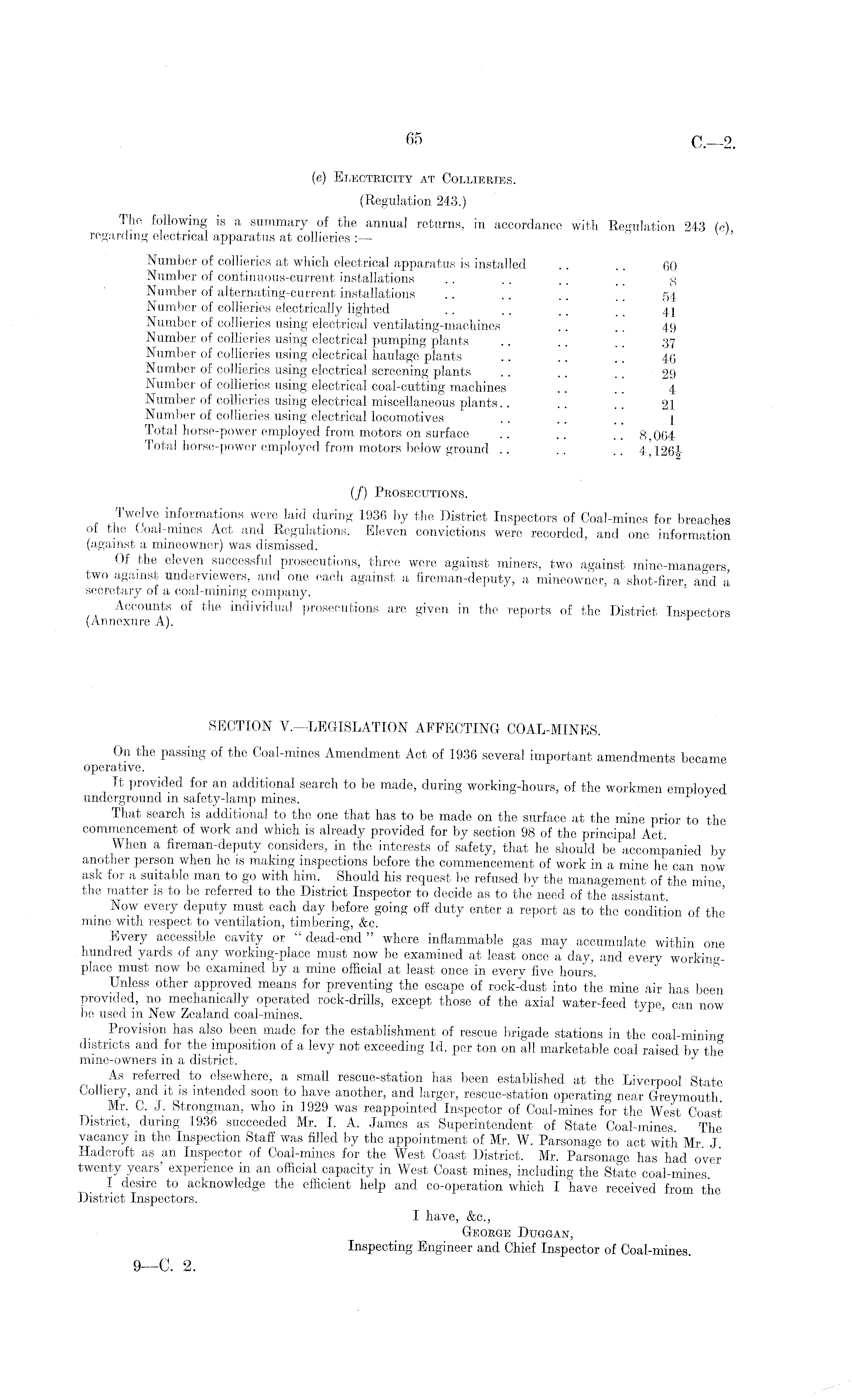 (e) Electricity at Collieries. (Regulation 243.) The following is a summary of the annual returns, in accordance with Regulation 243 (c) regarding electrical apparatus at collieries :— Number of collieries at which electrical apparatus is installed .. .. 60 Number of continuous-current installations .. .. .. .. g Number of alternating-current installations .. .. .. .. 54 Number of collieries electrically lighted .. .. .. .. 4 | Number of collieries using electrical ventilating-machines .. .. 49 Number of collieries using electrical pumping plants .. .. .. 37 Number of collieries using electrical haulage plants .. .. .. 46 Number of collieries using electrical screening plants .. .. .. 29 Number of collieries using electrical coal-cutting machines .. .. 4 Number of collieries using electrical miscellaneous plants.. .. .. 21 Number of collieries using electrical locomotives Total horse-power employed from motors on surface .. .. .. 8,064 Total horse-power employed from motors below ground .. .. .. 4,126^- (/) Prosecutions. Twelve informations were laid during 1936 by the District Inspectors of Coal-mines for breaches of the Coal-mines Act and Regulations. Eleven convictions were recorded, and one information (against a mineowner) was dismissed. Of the eleven successful prosecutions, three were against miners, two against mine-managers, two against underviewers, and one each against a fireman-deputy, a mineowner, a shot-firer and a secretary of a coal-mining company. Accounts of the individual prosecutions are given in the reports of the District Inspectors (Annexure A). J SECTION V.—LEGISLATION AFFECTING COAL-MINES. On the passing of the Coal-mines Amendment Act of 1936 several important amendments became operative. It provided for an additional search to be made, during working-hours, of the workmen employed underground in safety-lamp mines. That search is additional to the one that has to be made on the surface at the mine prior to the commencement of work and which is already provided for by section 98 of the principal Act When a fireman-deputy considers, in the interests of safety, that he should be accompanied by another person when he is making inspections before the commencement of work in a mine he can now ask for a suitable man to go with him. Should his request be refused by the management of the mine the matter is to be referred to the District Inspector to decide as to the need of the assistant. Now every deputy must each day before going off duty enter a report as to the condition of the mine with respect to ventilation, timbering, &c. Every accessible cavity or " dead-end" where inflammable gas may accumulate within one hundred yards of any working-place must now be examined at least once a day, and everv workingplace must now be examined by a mine official at least once in every five hours. Unless other approved means for preventing the escape of rock-dust into the mine air has been provided, no mechanically operated rock-drills, except those of the axial water-feed type can now be used in New Zealand coal-mines. Provision has also been made for the establishment of rescue brigade stations in the coal-mining districts and for the imposition of a levy not exceeding Id. per ton on all marketable coal raised by the mine-owners in a district. As referred to elsewhere, a small rescue-station has been established at the Liverpool State Colliery, and it is intended soon to have another, and larger, rescue-station operating near Greymouth. Mr. C. J. Strongman, who in 1929 was reappointed Inspector of Coal-mines for the West Coast District, during 1936 succeeded Mr. I. A. James as Superintendent of State Coal-mines. The vacancy in the Inspection Staff was filled by the appointment of Mr. W. Parsonage to act with Mr J Hadcroft as an Inspector of Coal-mines for the West Coast District. Mr. Parsonage has had over twenty years' experience in an official capacity in West Coast mines, including the State coal-mines. I desire to acknowledge the efficient help and co-operation which I have received from the District Inspectors. I have, &c., George Duggan, Inspecting Engineer and Chief Inspector of Coal-mines