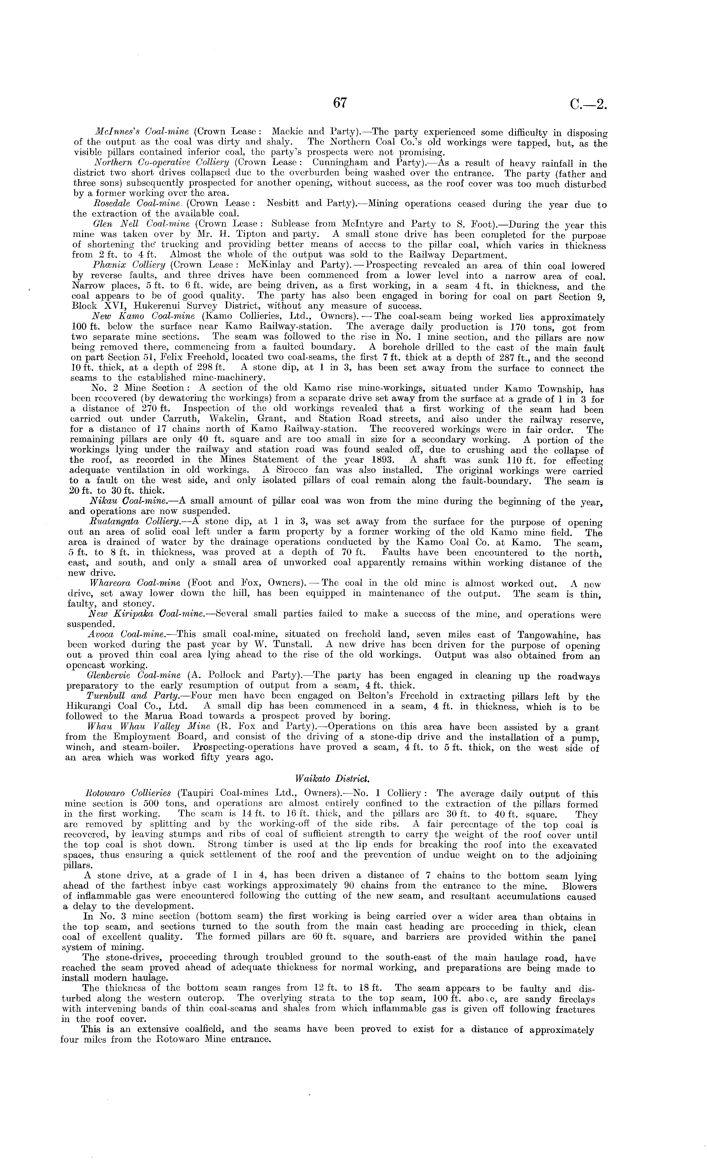 Mclnnes's Coal-mine (Crown Lease : Mackie and Party).—The party experienced some difficulty in disposing of the output as the coal was dirty and shaly. The Northern Coal Co.'s old workings were tapped, but, as the visible pillars contained inferior coal, the party's prospects were not promising. Northern Go-operative Colliery (Crown Lease : Cunningham and Party).—As a result of heavy rainfall in the district two short drives collapsed due to the overburden being washed over the entrance. The party (father and three sons) subsequently prospected for another opening, without success, as the roof cover was too much disturbed by a former working over the area. Rosedale Coal-mine (Crown Lease: Nesbitt and Party).—Mining operations ceased during the year due to the extraction of the available coal. Glen Nell Coal-mine (Crown Lease : Sublease from Mclntyre and Party to S. Foot). —During the year this mine was taken over by Mr. H. Tipton and party. A small stone drive has been completed for the purpose of shortening the' trucking and providing better means of access to the pillar coal, which varies in thickness from 2 ft. to 4 ft. Almost the whole of the output was sold to the Railway Department. Phainix Colliery (Crown Lease: McKinlay and Party). — Prospecting revealed an area of thin coal lowered by reverse faults, and three drives have been commenced from a lower level into a narrow area of coal. Narrow places, 5 ft. to 6 ft. wide, are being driven, as a first working, in a seam 4 ft. in thickness, and the coal appears to be of good quality. The party has also been engaged in boring for coal on part Section 9, Block XVI, Hukerenui Survey District, without any measure of success. New Kamo Coal-mine (Kamo Collieries, Ltd., Owners). — The coal-seam being worked lies approximately 100 ft. below the surface near Kamo Railway-station. The average daily production is 170 tons, got from two separate mine sections. The seam was followed to the rise in No. 1 mine section, and the pillars are now being removed there, commencing from a faulted boundary. A borehole drilled to the east of the main fault on part Section 51, Felix Freehold, located two coal-seams, the first 7 ft. thick at a depth of 287 ft., and the second 10 ft. thick, at a depth of 298 ft. A stone dip, at lin 3, has been set away from the surface to connect the seams to the established mine-machinery. No. 2 Mine Section : A section of the old Kamo rise mine-workings, situated under Kamo Township, has been recovered (by dewatering the workings) from a separate drive set away from the surface at a grade of 1 in 3 for a distance of 270 ft. Inspection of the old workings revealed that a first working of the seam had been carried out under Carruth, Wakelin, Grant, and Station Road streets, and also under the railway reserve, for a distance of 17 chains north of Kamo Railway-station. The recovered workings were in fair order. The remaining pillars are only 40 ft. square and are too small in size for a secondary working. A portion of the workings lying under the railway and station road was found sealed off, due to crushing and the collapse of the roof, as recorded in the Mines Statement of the year 1893. A shaft was sunk .110 ft. for effecting adequate ventilation in old workings. A Sirocco fan was also installed. The original workings were carried to a fault on the west side, and only isolated pillars of coal remain along the fault-boundary. The seam is 20 ft. to 30 ft. thick. Nikau Coal-mine. —A small amount of pillar coal was won from the mine during the beginning of the year, and operations are now suspended. Ruatangata Colliery.—A stone dip, at 1 in 3, was set away from the surface for the purpose of opening out an area of solid coal left under a farm property by a former working of the old Kamo mine field. The area is drained of water by the drainage operations conducted by the Kamo Coal Co. at Kamo. The seam, 5 ft. to 8 ft. in thickness, was proved at a depth of 70 ft. Faults have been encountered to the north, east, and south, and only a small area of unworked coal apparently remains within working distance of the new drive. Whareora Coal-mine (Foot and Fox, Owners). — The coal in the old mine is almost worked out. A new drive, set away lower down the hill, has been equipped in maintenance of the output. The seam is thin, faulty, and stoney. New Kiripaka Coal-mine. —Several small parties failed to make a success of the mine, and operations were suspended. Avoca Coal-mine. —This small coal-mine, situated on freehold land, seven miles east of Tangowahine, has been worked during the past year by W. Tunstall. A new drive has been driven for the purpose of opening out a proved thin coal area lying ahead to the rise of the old workings. Output was also obtained from an opencast working. Glenbervie Coal-mine (A. Pollock and Party).—The party has been engaged in cleaning up the roadways preparatory to the early resumption of output from a seam, 4 ft. thick. Tumbull and Party.—Four men have been engaged on Belton's Freehold in extracting pillars left by the Hikurangi Coal Co., Ltd. A small dip has been commenced in a seam, 4 ft. in thickness, which is to be followed to the Marua Road towards a prospect proved by boring. Whau Whau Valley Mine (R. Fox and Party).—Operations on this area have been assisted by a grant from the Employment Board, and consist of the driving of a stone-dip drive and the installation of a pump, winch, and steam-boiler. Prospecting-operations have proved a seam, 4 ft. to 5 ft. thick, on the west side of an area which was worked fifty years ago. Waikato District. Rotowaro Collieries (Taupiri Coal-mines Ltd., Owners). —No. 1 Colliery: The average daily output of this mine section is 500 tons, and operations are almost entirely confined to the extraction of the pillars formed in the first working. The seam is 14 ft. to 16 ft. thick, and the pillars are 30 ft. to 40 ft. square. They are removed by