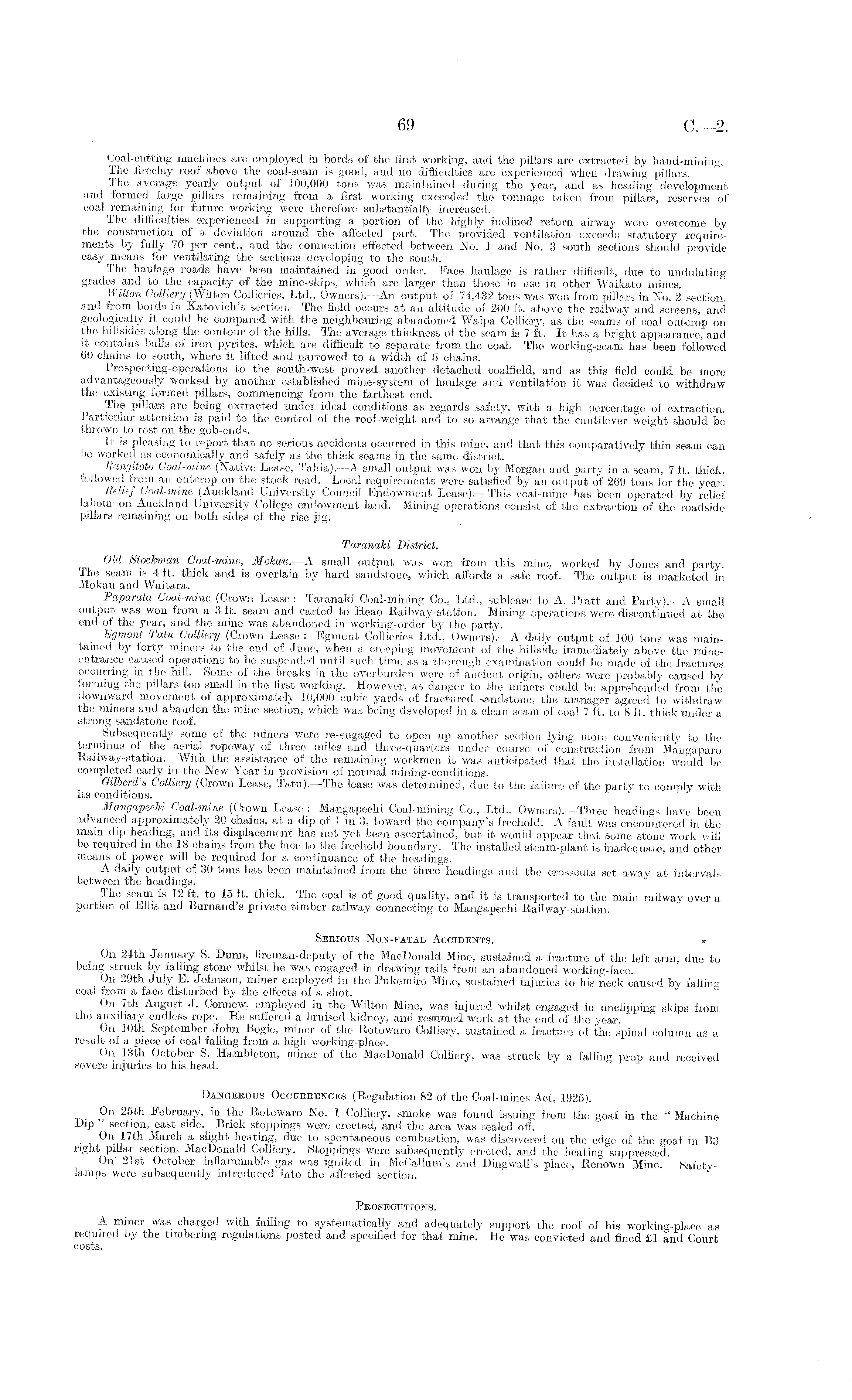 Coal-cutting machines are employed in bords of the first working, and the pillars are extracted by hand-mining. The fireclay roof above the coal-seam is good, and no difficulties are experienced when drawing pillars. The average yearly output of 100,000 tons was maintained during the year, and as heading development and formed large pillars remaining from a first working exceeded the tonnage taken from pillars, reserves of coal remaining for future working were therefore substantially increased. The difficulties experienced in supporting a portion of the highly inclined return airway were overcome by the construction of a deviation around the affected part. The provided ventilation exceeds statutory requirements by fully 70 per cent., and the connection effected between No. 1 and No. 3 south sections should provide easy means for ventilating the sections developing to the south. The haulage roads have been maintained in good order. Pace haulage is rather difficult, due to undulating grades and to the capacity of the mine-skips, which are larger than those in use in other Waikato mines. II ilton Colliery (Wilton Collieries, Ltd., Owners). —An output of 74,432 tons was won from pillars in No. 2 section, and from bords in Katovich's section. The field occurs at an altitude of 200 ft. above the railway and screens, and geologically it could be compared with the neighbouring abandoned Waipa Colliery, as the seams of coal outcrop on the hillsides along the contour of the hills. The average thickness of the seam is 7 ft. It has a bright appearance, and it contains balls of iron pyrites, which are difficult to separate from the coal. The working-seam has been followed 60 chains to south, where it lifted and narrowed to a width of 5 chains. Prospeeting-operations to the south-west proved another detached coalfield, and as this field could be more advantageously worked by another established mine-system of haulage and ventilation it was decided to withdraw the existing formed pillars, commencing from the farthest end. The pillars are being extracted under ideal conditions as regards safety, with a high percentage of extraction. Particular attention is paid to the control of the roof-weight and to so arrange that the cantilever weight should be thrown to rest on the gob-ends. It is pleasing to report that no serious accidents occurred in this mine, and that this comparatively thin seam can be worked as economically and safely as the thick seams in the same district. Bangitoto Goal-mine (Native Lease, Tahia). —A small output was won by Morgan and party in a seam, 7 ft. thick, followed from an outcrop on the stock road. Local requirements were satisfied by an output of 269 tons for the year. Relief Goal-mine (Auckland University Council Endowment Lease). —This coal-mine has been operated by relief labour on Auckland University College endowment land. Mining operations consist of the extraction of the roadside pillars remaining on both sides of the rise jig. Taranalci District. Old Stockman Goal-mine, Mohau.—A small output was won from this mine, worked bv Jones and party. The seam is 4 ft. thick and is overlain by hard sandstone, which affords a safe roof. The output is marketed in Mokau and Waitara. Paparata Coal-mine (Crown Lease : Taranaki Coal-mining Co., Ltd., sublease to A. Pratt and Party).—A small output was won from a 3 ft. seam and carted to Heao Railway-station. Mining operations were discontinued at the end of the year, and the mine was abandoned in working-order by the party. hgmont Tatu Colliery (Crown Lease : Egmont Collieries Ltd., Owners). —A daily output of 100 tons was maintained by forty miners to the end of June, when a creeping movement of the hillside immediately above the mineentrance caused operations to be suspended until such time as a thorough examination could be made of the fractures occurring in the hill. Some of the breaks in the overburden were of ancient origin, others were probably caused by forming the pillars too small in the first working. However, as danger to the miners could be apprehended from the downward movement of approximately 10,000 cubic yards of fractured sandstone, the manager agreed to withdraw the miners and abandon the mine section, which was being developed in a clean seam of coal 7 ft. to 8 ft. thick under a strong sandstone roof. Subsequently some of the miners were re-engaged to open up another section lying more conveniently to the terminus of the aerial ropeway of three miles and three-quarters under course of construction from Mangaparo Railway-station. _ With the assistance of the remaining workmen it was anticipated that the installation would be completed early in the New Year in provision of normal mining-conditions. Gilherd's Colliery (Crown Lease, Tatu). —The lease was determined, due to the failure of the party to comply with its conditions. Mangapeehi Coal-mine (Crown Lease : Mangapeehi Coal-mining Co., Ltd., Owners). —Three headings have been advanced approximately 20 chains, at a dip of 1 in 3, toward the company's freehold. A fault was encountered in the main dip heading, and its displacement has not yet been ascertained, but it would appear that some stone work will be required in the 18 chains from the face to the freehold boundary. The installed steam-plant is inadequate, and other means of power will be required for a continuance of the headings. A daily output of 30 tons has been maintained from the three headings and the crosscuts set away at intervals between the headings. The seam is 12 ft. to 15 ft. thick. The coal is of good quality, and it is transported to the main railway over a portion of Ellis and Burnand's private timber railway connecting to Mangapeehi Railway-station. Sebiotjs Non-fatal Accidents. » On 24th January S. Dunn, fireman-deputy of the Mac Donald Mine, sustained a fracture of the left arm, due to being struck by falling stone whilst he was engaged in drawing rails from an abandoned wor