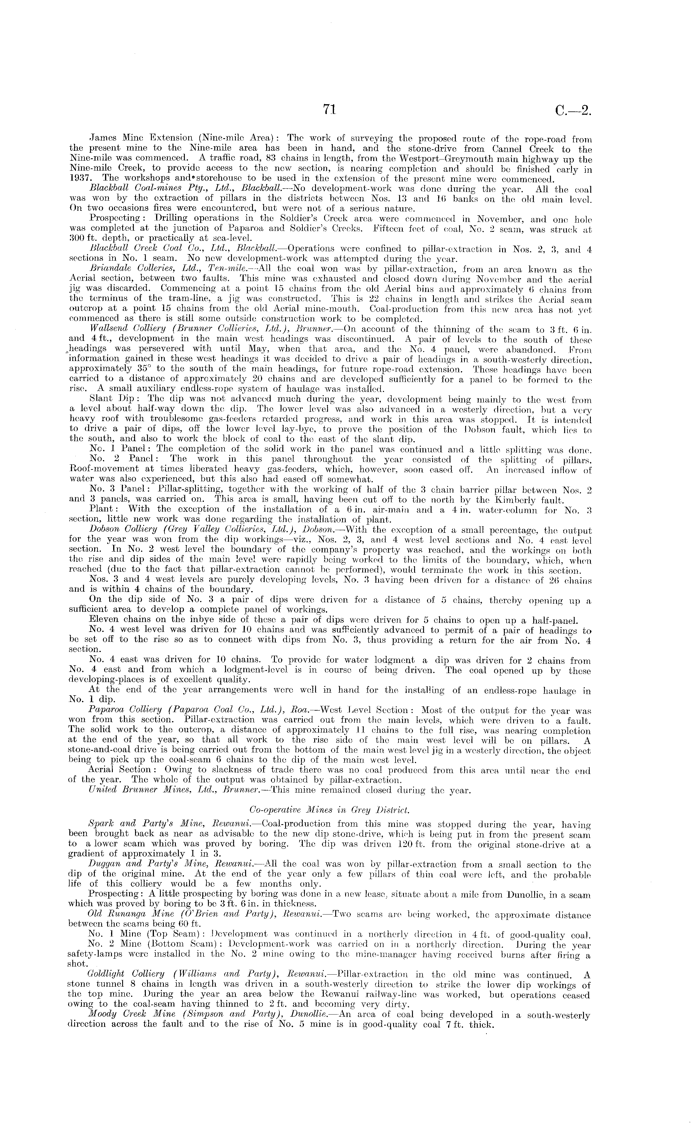 James Mine Extension (Nine-mile Area): The work of surveying the proposed route of the rope-road from the present mine to the Nine-mile area has been in hand, and the stone-drive from Cannel Creek to the Nine-mile was commenced. A traffic road, 83 chains in length, from the Westport-Grey mouth main highway up the Nine-mile Creek, to provide access to the new section, is nearing completion and should be finished early in 1937. The workshops and'storehouse to be used in the extension of the present mine were commenced. Blackball Goal-mines Pty., Ltd., Blackball. —No development-work was done during the year. All the coal was won by the extraction of pillars in the districts between Nos. 13 and 16 banks on the old main level. On two occasions fires were encountered, but were not of a serious nature. Prospecting: Drilling operations in the Soldier's Creek area were commenced in November, and one hole was completed at the junction of Paparoa and Soldier's Creeks. Fifteen feet of coal, No. 2 seam, was struck at 300 ft. depth, or practically at sea-level. Blackball Greek Goal Co., .Ltd., Blackball. —Operations were confined to pillar-extraction in Nos. 2, 3, and 4 sections in No. 1 seam. No new development-work was attempted during the year. Briandale Colleries, Ltd., Ten-mile.—All the coal won was by pillar-extraction, from an area known as the Aerial section, between two faults. This mine was exhausted and closed down during November and the aerial jig was discarded. Commencing at a point 15 chains from the old Aerial bins and approximately 6 chains from the terminus of the tram-line, a jig was constructed. This is 22 chains in length and strikes the Aerial seam outcrop at a point 15 chains from the old Aerial mine-mouth. Coal-production from this new area has not yet commenced as there is still some outside construction work to be completed. Wallsend Colliery (Brunner Collieries, Ltd.), Brunner. —On account of the thinning of the seam to 3 ft. 6 in. and 4 ft., development in the main west headings was discontinued. A pair of levels to the south of these .headings was persevered with until May, when that area, and the No. 4 panel, were abandoned. From information gained in these west headings it was decided to drive a pair of headings in a south-westerly direction, approximately 35° to the south of the main headings, for future rope-road extension. These headings have been carried to a distance of approximately 20 chains and are developed sufficiently for a panel to be formed to the rise. A small auxiliary endless-rope system of haulage was installed. Slant Dip : The dip was not advanced much during the year, development being mainly to the west from a level about half-way down the dip. The lower level was also advanced in a westerly direction, but a very heavy roof with troublesome gas-feeders retarded progress, and work in this area was stopped. It is intended to drive a pair of dips, off the lower level lay-bye, to prove the position of the Dobson fault, which lies to the south, and also to work the block of coal to the east of the slant dip. No. 1 Panel: The completion of the solid work in the panel was continued and a little splitting was done. No. 2 Panel: The work in this panel throughout the year consisted of the splitting of pillars. Roof-movement at times liberated heavy gas-feeders, which, however, soon eased off. An increased inflow of water was also experienced, but this also had eased off somewhat. No. 3 Panel: Pillar-splitting, together with the working of half of the 3 chain barrier pillar between Nos. 2 and 3 panels, was carried on. This area is small, having been cut off to the north by the Kimberly fault. Plant: With the exception of the installation of a 6 in. air-main and a 4 in. water-column for No. 3 section, little new work was done regarding the installation of plant. Dobson Colliery (Grey Valley Collieries, Ltd.), Dobson. —With the exception of a small percentage, the output for the year was won from the dip workings—viz., Nos. 2, 3, and 4 west level sections and No. 4 east level section. In No. 2 west level the boundary of the company's property was reached, and the workings on both the rise and dip sides of the main level were rapidly being worked to the limits of the boundary, which, when reached (due to the fact that pillar-extraction cannot be performed), would terminate the work in this section. Nos. 3 and 4 west levels are purely developing levels, No. 3 having been driven for a distance of 26 chains and is within 4 chains of the boundary. On the dip side of No. 3 a pair of dips were driven for a distance of 5 chains, thereby opening up a sufficient area to develop a complete panel of workings. Eleven chains on the inbye side of these a pair of dips were driven for 5 chains to open up a half-panel. No. 4 west level was driven for 10 chains and was sufficiently advanced to permit of a pair of headings to be set off to the rise so as to connect with dips from No. 3, thus providing a return for the air from No. 4 section. No. 4 east was driven for 10 chains. To provide for water lodgment a dip was driven for 2 chains from No. 4 east and from which a lodgment-level is in course of being driven. The coal opened up by these developmg-places is of excellent quality. At the end of the year arrangements were well in hand for the installing of an endless-rope haulage in No. 1 dip. Paparoa Colliery (Paparoa Goal Co., Ltd.), Roa. —West Level Section: Most of the output for the year was won from this section. Pillar-extraction was carried out from the main levels, which were driven to a fault. The solid work to the outcrop, a distance of approximately 11 chains to the full rise, was nearing completion at the end of the year, so that all work to the rise side of the main west level will be on pillars. A stone-and-coal drive is being carried out from the bottom of the main west level jig in a westerly direction, the object being to pick up the coal-seam 6 chai