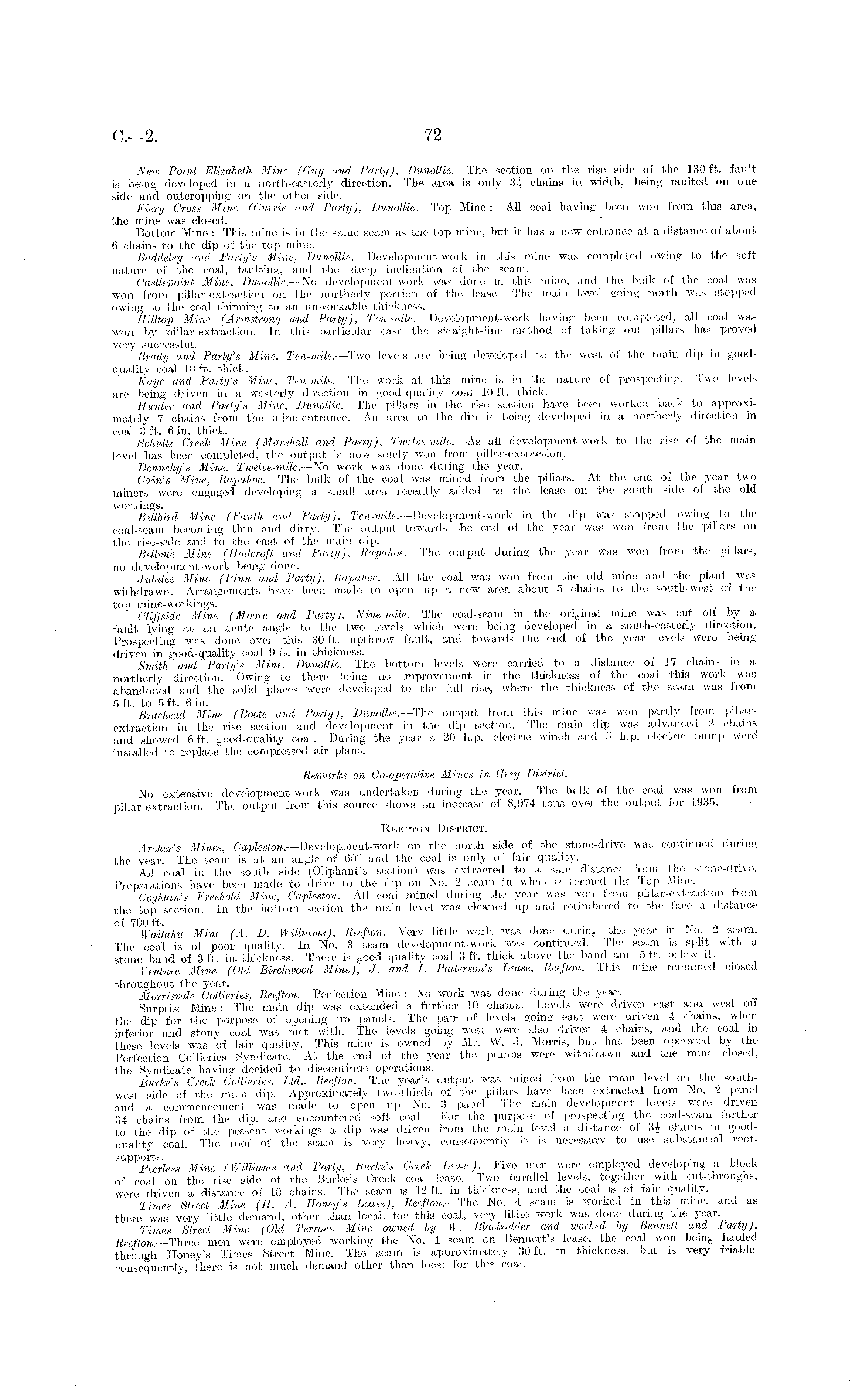New Point, Elizabeth Mine (Guy and Party), Dunollie.—The section on the rise side of the 130 ft. fault is being developed in. a north-easterly direction. The area is only 3J chains in width, being faulted on one side and outcropping on the other side. Fiery Gross Mine (Gurrie and Party), Dunollie. —Top Mine: All coal having been won from this area, the mine was closed. " Bottom Mine : This mine is in the same seam as the top mine, but it has a new entrance at a distance of about 6 chains to the dip of the top mine. Baddeley and Party's Mine, Dunollie.—Development-work in this mine was completed owing to the soft nature of the coal, faulting, and the steep inclination of the seam. Gastlepoint Mine, Dunollie. —No development-work was done in this mine, and the bulk of the coal was won from pillar-extraction on the northerly portion of the lease. The main level going north was stopped owing to the coal thinning to an unworkable thickness. Hilltop Mine (Armstrong and Party), Ten-mile. —Development-work having been completed, all coal was won by pillar-extraction. In this particular case the straight-line method of taking out pillars has proved very successful. Brady and Party's Mine, Ten-mile. —Two levels are being developed to the west of the main dip in goodquality coal 10ft. thick. Kaye and Party's Mine, Ten-mile. —The work at this mine is in the nature of prospecting. Two levels are being driven in a westerly direction in good-quality coal 10 ft. thick. Hunter and Party's Mine, Dunollie.—The pillars in the rise section have been worked back to approximately 7 chains from the mine-entrance. An area to the dip is being developed in a northerly direction in coal 3 ft. 6 in. thick. Schultz Greek Mine (Marshall and Party), Twelve-mile. —As all development-work to the rise of the mam level has been completed, the output is now solely won from pillar-extraction. Dennehy's Mine, Twelve-mile. —No work was done during the year. Gain's Mine, Bapahoe.—The bulk of the coal was mined from the pillars. At the end of the year two miners were engaged developing a small area recently added to the lease on the south side of the old workings. . Bdlbird Mine (Fauth and Party), Ten-mile. —Development-work in the dip was stopped owing to the coal-seam becoming thin and dirty. The output towards the end of the year was won from the pillars on the rise-side and to the east of the main dip. Bellvue Mine (Hadcroft and Party), Bapahoe.—The output during the year was won from the pillars, no development-work being done. Jubilee Mine (Finn and- Party), Bapahoe.—All the coal was won from the old mine and the plant was withdrawn. Arrangements have been made to open up a new area about 5 chains to the south-west of the top mine-workings. Gliffside Mine (Moore and Party), Nine-mile. —The coal-seam in the ongmal mine was cut oft by a fault lying at an acute angle to the two levels which were being developed in a south-easterly direction. Prospecting was done over this 30 ft. upthrow fault, and towards the end of the year levels were being driven in good-quality coal 9 ft. in thickness. Smith and Party's Mine, Dunollie. —The bottom levels were carried to a distance of 17 chains in a northerly direction. Owing to there being no improvement in the thickness of the coal this work was abandoned and the solid places were developed to the full rise, where the thickness of the seam was from 5 ft. to 5 ft. 6 in. Braehead Mine (Boote and Party), Dunollie.—The output from this mine wa,s won partly from pillarextraction in the rise section and development in the dip section. The main dip was advanced 2 chains and showed 6 ft. good-quality coal. During the year a 20 h.p. electric winch and 5 h.p. electric pump were' installed to replace the compressed air plant. Bemarks on Go-operative Mines in Grey District. No extensive development-work was undertaken during the year. The bulk of the coal was won from pillar-extraction. The output from this source shows an increase of 8,974 tons over the output for 1935. Reeiton District. Archer's Mines, Gapleston. —Development-work on the north side of the stone-drive was continued during the year. The seam is at an angle of 60° and the coal is only of fair quality. All coal in the south side (Oliphant's section) was extracted to a safe distance from the stone-drive. Preparations have been made to drive to the dip on No. 2 seam in what is termed the Top Mine. Goghlan's Freehold Mine, Gapleston.—All coal mined during the year was won from pillar-extraction from the top section. In the bottom section the main level was cleaned up and retimbered to the face a distance of 700 ft. . . , T 0 Waitahu Mine (A. D. Williams), Beefton.—Very little work was done during the year m JSIo. I seam. The coal is of poor quality. In No. 3 seam development-work was continued. The seam is split with a stone band of 3 ft. in, thickness. There is good quality coal 3 ft. thick above the band and 5 ft. below it. Venture Mine (Old Birchwood Mine), J. and I. Patterson's Lease, Beefton.—This mine remained closed throughout the year. . Morrisvale Collieries, Beefton—Perfection Mine : No work was done during the year. Surprise Mine: The main dip was extended a further 10 chains. Levels were driven east and west off the dip for the purpose of opening up panels. The pair of levels going east were driven 4 chains, when inferior and stony coal was met with. The levels going west were also driven 4 chains, and the coal m these levels was of fair quality. This mine is owned by Mr. W. J. Morris, but has been operated by the Perfection Collieries Syndicate. At the end of the year the pumps were withdrawn and the mine closed, the Syndicate having decided to discontinue operations. Burke's Creek Collieries, Ltd., Beefton.—The year's output was mined from the mam level on the southwest side of the main dip. Approximately two-thirds of the pillars have been extracted from No. 2 panel and a comm