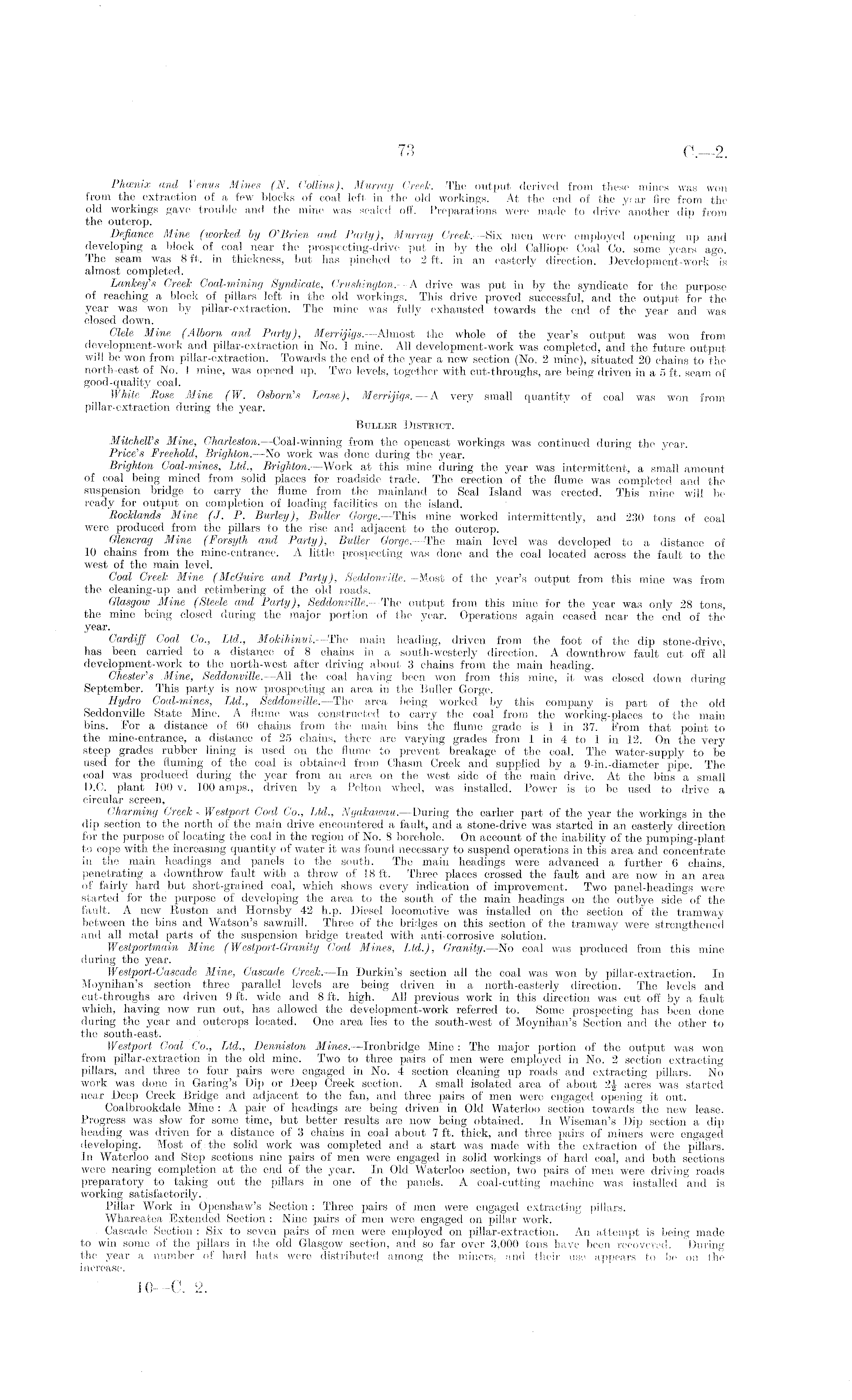 Phoenix and Venus Mines (A T . Collins), Murray Creek. —The output derived from these mines was won from the extraction of a few blocks of coal left in the old workings. At the end of the yrar fire from the old workings gave trouble and the mine was sealed off. Preparations were made to drive'another dip from the outcrop. Defiance Mine (worked by O'Brien and Party), Murray Creek. —Six men were employed opening up and developing a block of coal near the prospeeting-drive put in by the old Calliope Coal Co. some years ago. The seam was 8 ft, in thickness, but has pinched to 2 ft. in an easterly direction. Development-work is almost completed. Lanlcey's Creek Goal-mining Syndicate, Crushington. —A drive was put in by the syndicate for the purpose of reaching a block of pillars left in the old workings. This drive proved successful, and the output for the year was won by pillar-extraction. The mine was fully exhausted towards the end of the year and was closed down. Clele Mine (Alborn and Party), Merrijigs. —Almost the whole of the year's output was won from development-work and pillar-extraction in No. 1 mine. All development-work was completed, and the future output will be won from pillar-extraction. Towards the end of the year a new section (No. 2 mine), situated 20 chains to the north-east of No. 1 mine, was opened up. Two levels, together with ent-throughs, are being driven in a 5 ft. seam of good-quality coal. White Rose, Mine (W. Osborn's Lease), Merrijigs. — A very small quantity of coal was won from pillar-extraction during the year. Bijller District. Mitchell's Mine, Charleston. —Coal-winning from the opencast workings was continued during the year. Price's Freehold, Brighton. —No work was done during the year. Brighton Coal-mines, Ltd., Brighton. —Work at this mine during the year was intermittent, a small amount of coal being mined from solid places for roadside trade. The erection of the flume was completed and the suspension bridge to carry the flume from the mainland to Seal Island was erected. This mine will be ready for output on completion of loading facilities on the island. Rochlands Mine (J. P. Burley), Buller Gorge. —This mine worked intermittently, and 230 tons of coal were produced from the pillars to the rise and adjacent to the outcrop. Olencrag Mine (Forsyth and Party), Buller Gorge. —The main level was developed to a distance of 10 chains from the mine-entrance. A little prospecting was done and the coal located across the fault to the west of the main level. Coal Creek Mine (McGuire and Party), Seddonville. —Most of the year's output from this mine was from the eleaning-up and retimbering of the old roads. Glasgow Mine (Steele and Party), Seddonville. —The output from this mine for the year was only 28 tons, the mine being closed during the major portion of the year. Operations again ceased near the end of the year. Cardiff Goal Co., Ltd., Mokihinui. —The main heading, driven from the foot of the dip stone-drive, has been carried to a distance of 8 chains in a south-westerly direction. A downthrow fault out off all development-work to the north-west after driving about 3 chains from the main heading. Chester's Mine, Seddonville. —All the coal having been won from this mine, it was closed down during September. This party is now prospecting an area in the Buller Gorge. Hydro Coal-mines, Ltd., Seddonville. —The area being worked by this company is part of the old Seddonville State Mine. A flume was constructed to carry the coal from the working-places to the main bins. "For a distance of 60 chains from the main bins the flume grade is 1 in 37. From that point to the mine-entrance, a distance of 25 chains, there are varying grades from 1 in 4 to 1 in 12. On the very steep grades rubber lining is used on the flume to prevent breakage of the coal. The water-supply to be used for the fiuming of the coal is obtained from Chasm Creek and supplied by a 9-in.-diameter pipe. The coal was produced during the year from an area on the west side of the main drive. At the bins a small D.C. plant 100 v. 100 amps., driven by a Peltoii wheel, was installed. Power is to be used to drive a circular screen, Charming Creek- Westport Coal Co., Ltd., Ngakawau. —During the earlier part of the year the workings in the dip section to the north of the main drive encountered a fault, and a stone-drive was started, in an easterly direction for the purpose of locating the coal in the region of No. 8 borehole. On account of the inability of the pumping-plant to cope with the increasing quantity of water it was found necessary to suspend operations in this area and concentrate in the main headings and panels to the south. The main headings were advanced a further 6 chains, penetrating a downthrow fault with a throw of ! 8 ft. Three places crossed the fault and are now in an area of fairly hard but short-grained coal, which shows every indication of improvement. Two panel-headings were started for the purpose of developing the area to the south of the main headings on the outbve'side of the fault. A new Ruston and Hornsby 42 h.p. Diesel locomotive was installed on the section of the tramway between the bins and Watson's sawmill. Three of the bridges on this section of the tramway were strengthened and all metal parts of the suspension bridge treated with anti corrosive solution. Westportmain Mine (Westport-Granity Coal Mines, Ltd.), Granity. —No coal was produced from this mine during the year. Westport-Cascade Mine, Cascade Creek. —ln Durkin's section all the coal was won by pillar-extraction. In Moynihan's section three parallel levels are being driven in a north-easterly direction. The levels and cut-throughs are driven 9 ft. wide and 8 ft. high. All previous work in this direction was cut off by a fault which, having now run out, has allowed the development-work referred to. Some prospecting has been done during the year and outcrops located. One area lies 