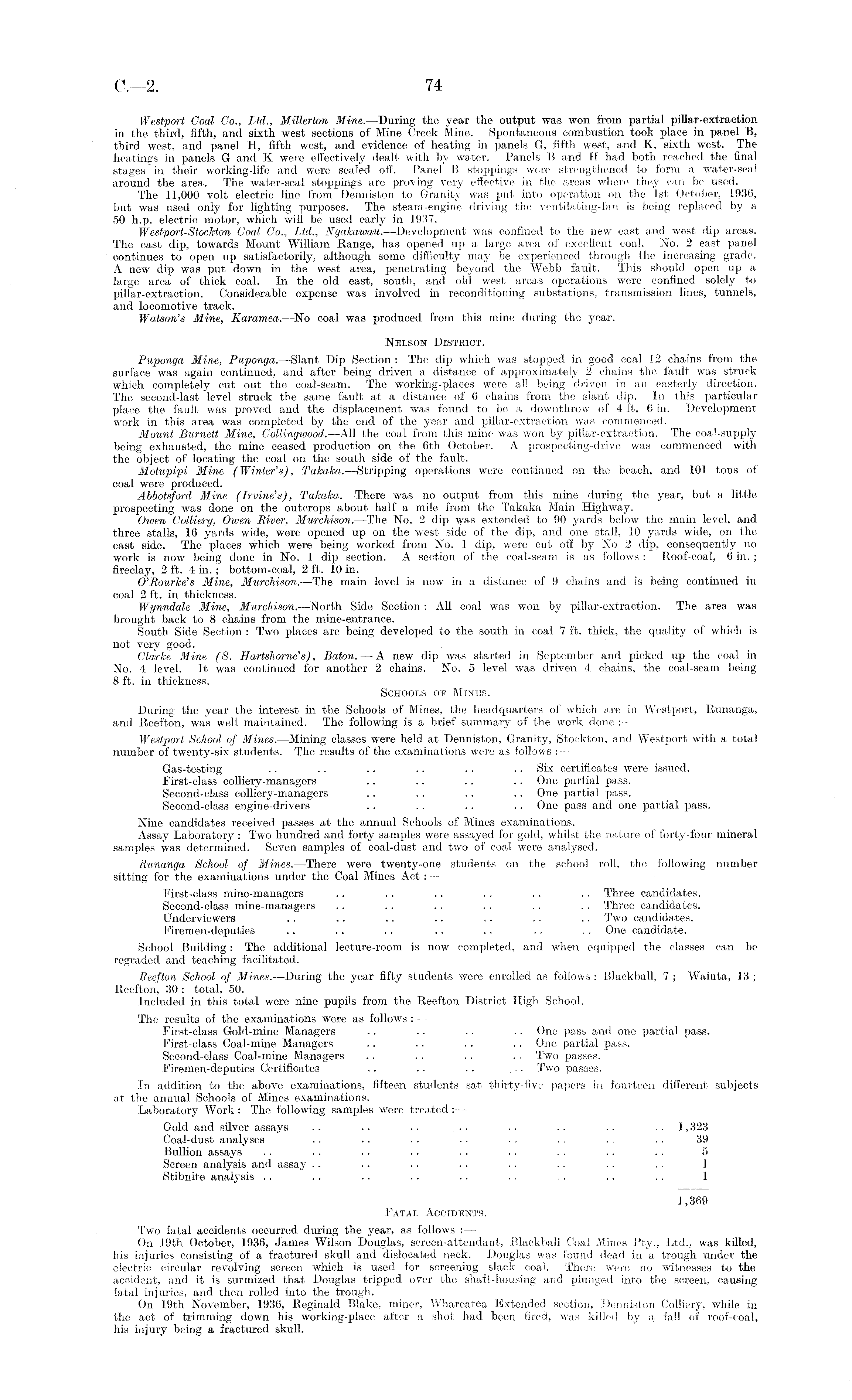 Westport Goal Co., Ltd., Millerton Mine.—During the year the output was won from partial pillar-extraction in the third, fifth, and sixth west sections of Mine Creek Mine. Spontaneous combustion took place in panel B, third west, and panel H, fifth west, and evidence of heating in panels G, fifth west, and K, sixth west. The heatings in panels G and K were effectively dealt with by water. Panels B and H had both reached the final stages in their working-life and were sealed off. Panel B stoppings were strengthened to form a water-seal around the area. The water-seal stoppings are proving very effective in the areas where they can be used. The 11,000 volt electric line from Denniston to Granity was put into operation on the Ist October, 1936, but was used only for lighting purposes. The steam-engine driving the ventilating-fan is being replaced by a 50 h.p. electric motor, which will be used early in 1937. Westport-Stockton Goal Co., Ltd., Ngakawau.—Development was confined to the new east and west dip areas. The east dip, towards Mount William Range, has opened up a large area of excellent coal. No. 2 east panel continues to open up satisfactorily, although some difficulty may be experienced through the increasing grade. A new dip was put down in the west area, penetrating beyond the Webb fault. This should open up a large area of thick coal. In the old east, south, and old west areas operations were confined solely to pillar-extraction. Considerable expense was involved in reconditioning substations, transmission lines, tunnels, and locomotive track. Watson's Mine, Karamea. —No coal was produced from this mine during the year. Nelson District. Puponga Mine, Puponga.—Slant Dip Section: The dip which was stopped in good coal 12 chains from the surface was again continued, and after being driven a distance of approximately 2 chains the fault was struck which completely cut out the coal-seam. The working-places were all being driven in an easterly direction. The second-last level struck the same fault at a distance of 6 chains from the slant dip. In this particular place the fault was proved and the displacement was found to be a downthrow of 4 ft. 6 in. Development work in this area was completed by the end of the year and pillar-extraction was commenced. Mount Burnett Mine, Collingwood.—All the coal from this mine was won by pillar-extraction. The coa!-supply being exhausted, the mine ceased production on the 6th October. A prospecting-drive was commenced with the object of locating the coal on the south side of the fault. Motupipi Mine (Winter's), Takaka.—Stripping operations were continued on the beach, and 101 tons of coal were produced. Abbotsford Mine (Irvine's), Takaka. —There was no output from this mine during the year, but a little prospecting was done on the outcrops about half a mile from the Takaka Main Highway. Owen Colliery, Owen River, Murchison.—The No. 2 dip was extended to 90 yards below the main level, and three stalls, 16 yards wide, were opened up on the west side of the dip, and one stall, 10 yards wide, on the east side. The places which were being worked from No. 1 dip, were cut off by No 2 dip, consequently no work is now being done in No. 1 dip section. A section of the coal-seam is as follows : Roof-coal, 6 in. ; fireclay, 2 ft. 4 in. ; bottom-coal, 2 ft. 10 in. Ô Rourke's Mine, Murchison. —The main level is now in a distance of 9 chains and is being continued in coal 2 ft. in thickness. Wynndale Mine, Murchison. —North Side Section: All coal was won by pillar-extraction. The area was brought back to 8 chains from the mine-entrance. South Side Section : Two places are being developed to the south in coal 7 ft. thick, the quality of which is not very good. Clarke Mine (S. Hartshorne's), Baton. — A new dip was started in September and picked up the coal in No. 4 level. It was continued for another 2 chains. No. 5 level was driven 4 chains, the coal-seam being 8 ft. in thickness. Schools of Mines. During the year the interest in the Schools of Mines, the headquarters of which are in Westport, Runanga, and Reefton, was well maintained. The following is a brief summary of the work done : — Westport School of Mines.—Mining classes were held at Denniston, Granity, Stockton, and Westport with a total number of twenty-six students. The results of the examinations were as follows : — Gas-testing .. .. .. .. .. .. Six certificates were issued. First-class colliery-managers .. .. . . .. One partial pass. Second-class colliery-managers .. . . .. .. One partial pass. Second-class engine-drivers .. . . .. .. One pass and one partial pass. Nine candidates received passes at the annual Schools of Mines examinations. Assay Laboratory : Two hundred and forty samples were assayed for gold, whilst the nature of forty-four mineral samples was determined. Seven samples of coal-dust and two of coal were analysed. Sunanga School of Mines. —There were twenty-one students on the school roll, the following number sitting for the examinations under the Coal Mines Act : — First-class mine-managers .. .. .. .. .. .. Three candidates. Second-class mine-managers .. .. . . .. . . .. Three candidates. Underviewers .. .. .. .. .. .. . . Two candidates. Firemen-deputies .. .. .. .. .. . . .. One candidate. School Building: The additional lecture-room is now completed, and when equipped the classes can be regraded and teaching facilitated. Reefton School of Mines. —During the year fifty students were enrolled as follows : Blackball, 7 ; Waiuta, 13 ; Reefton, 30 : total, 50. Included in this total were nine pupils from the Reefton District High School. The results of the examinations were as follows :— First-class Gold-mine Managers .. .. .. .. One pass and one partial pass. First-class Coal-mine Managers .. .. .. .. One partial pass. Second-class Coal-mine Managers .. .. .. . . Two passes. Firemen-deputies Certificates .. .. .. .. Two passes. In addition to the a