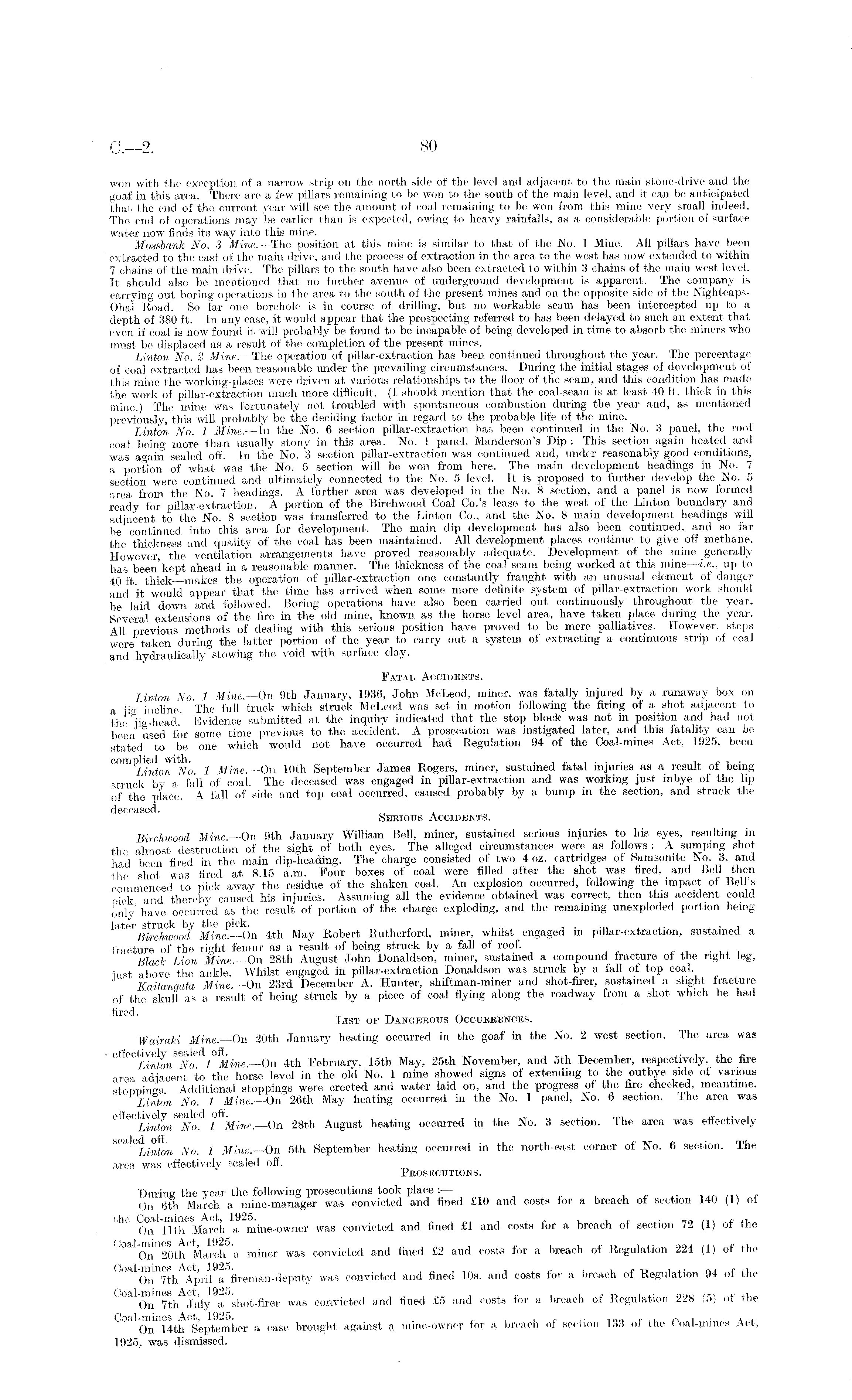 won with the exception of a narrow strip on the north side of the level and adjacent to the main stone-drive and the goaf in this area. There are a few pillars remaining to be won to the south of the main level, and it can be anticipated that the end of the current year will see the amount of coal remaining to be won from this mine very small indeed. The end of operations may be earlier than is expected, owing to heavy rainfalls, as a considerable portion of surface water now finds its way into this mine. Mossbanlc No. 3 Mine. —The position at this mine is similar to that of the No. 1 Mine. All pillars have been extracted to the east of the main drive, and the process of extraction in the area to the west has now extended to within 7 chains of the main drive. The pillars to the south have also been extracted to within 3 chains of the main west level. It should also be mentioned that no further avenue of underground development is apparent. The company is carrying out boring operations in the area to the south of the present mines and oil the opposite side of the NightcapsOhai Road. So far one borehole is in course of drilling, but no workable seam has been intercepted up to a depth of 380 ft. In any case, it would appear that the prospecting referred to has been delayed to such an extent that even if coal is now found it will probably be found to be incapable of being developed in time to absorb the miners who must be displaced as a result of the completion of the present mines. Linton No. 2 Mine. —The operation of pillar-extraction has been continued throughout the year. The percentage of coal extracted has been reasonable under the prevailing circumstances. During the initial stages of development of this mine the working-places were driven at various relationships to the floor of the seam, and this condition has made the work of pillar-extraction much more difficult. (I should mention that the coal-seam is at least 40 ft. thick in this mine.) The mine was fortunately not troubled with spontaneous combustion during the year and, as mentioned previously, this will probably be the deciding factor in regard to the probable life of the mine. Linton No. 1 Mine. —In the No. 6 section pillar-extraction has been continued in the No. 3 panel, the roof coal being more than usually stony in this area. No. 1. panel, Manderson's Dip: This section again heated and was again sealed off. In the No. 3 section pillar-extraction was continued and, under reasonably good conditions, a portion of what was the No. 5 section will be won from here. The main development headings in No. 7 section were continued and ultimately connected to the No. 5 level. It is proposed to further develop the No. 5 area from the No. 7 headings. A further area was developed in the No. 8 section, and a panel is now formed ready for pillar-extraction. A portion of the Birchwood Coal Co.'s lease to the west of the Linton boundary and adjacent to the No. 8 section was transferred to the Linton Co., and the No. 8 main development headings will be continued into this area for development. The main dip development has also been continued, and so far the thickness and qualitv of the coal has been maintained. All development places continue to give off methane. However, the ventilation arrangements have proved reasonably adequate. Development of the mine generally has been'kept ahead in a reasonable manner. The thickness of the coal seam being worked at this mine—i.e., up to 40 ft. thick—makes the operation of pillar-extraction one constantly fraught with an unusual element of danger and "it would appear that the time has arrived when some more definite system of pillar-extraction work should be laid down and followed. Boring operations have also been carried out continuously throughout the year. Several extensions of the fire in the old mine, known as the horse level area, have taken place during the year. All previous methods of dealing with this serious position have proved to be mere palliatives. However, steps were taken during the latter portion of the year to carry out a system of extracting a continuous strip of coal and hydraulically stowing the void with surface clay. Fatal Accidents. l inton No. 1 Mine.—On 9th January, 1936, John McLeod, miner, was fatally injured by a runaway box on a ii» 'incline The full truck which struck McLeod was set in motion following the firing of a shot adjacent to the iia-head. Evidence submitted at the inquiry indicated that the stop block was not in position and had not been used for some time previous to the accident. A prosecution was instigated later, and this fatality can be stated to be one which would not have occurred had Regulation 94 of the Coal-mines Act, 1925, been com phed^ wi —Qn 10th September James Rogers, miner, sustained fatal injuries as a result of being struck by a fall of coal. The deceased was engaged in pillar-extraction and was working just inbye of the lip of the place. A fall of side and top coal occurred, caused probably by a bump in the section, and struck the deceased. _ . Serious Accidents. Birchwood Mine—On 9th January William Bell, miner, sustained serious injuries to his eyes, resulting in the almost destruction of the sight of both eyes. The alleged circumstances were as follows : A sumping shot had been fired in the main dip-heading. The charge consisted of two 4 oz. cartridges of Samsonite No. 3, and the shot was fired at 8.15 a.m. Four boxes of coal were filled after the shot was fired, and Bell then commenced to pick away the residue of the shaken coal. An explosion occurred, following the impact of Bell's pick and thereby caused his injuries. Assuming all the evidence obtained was correct, then this accident could only have occurred as the result of portion of the charge exploding, and the remaining unexploded portion being later struck by the pick. , „ , . ... ... j. • i Birchwood, Mine:—On 4th May Robert Rutherford, miner, whilst enga