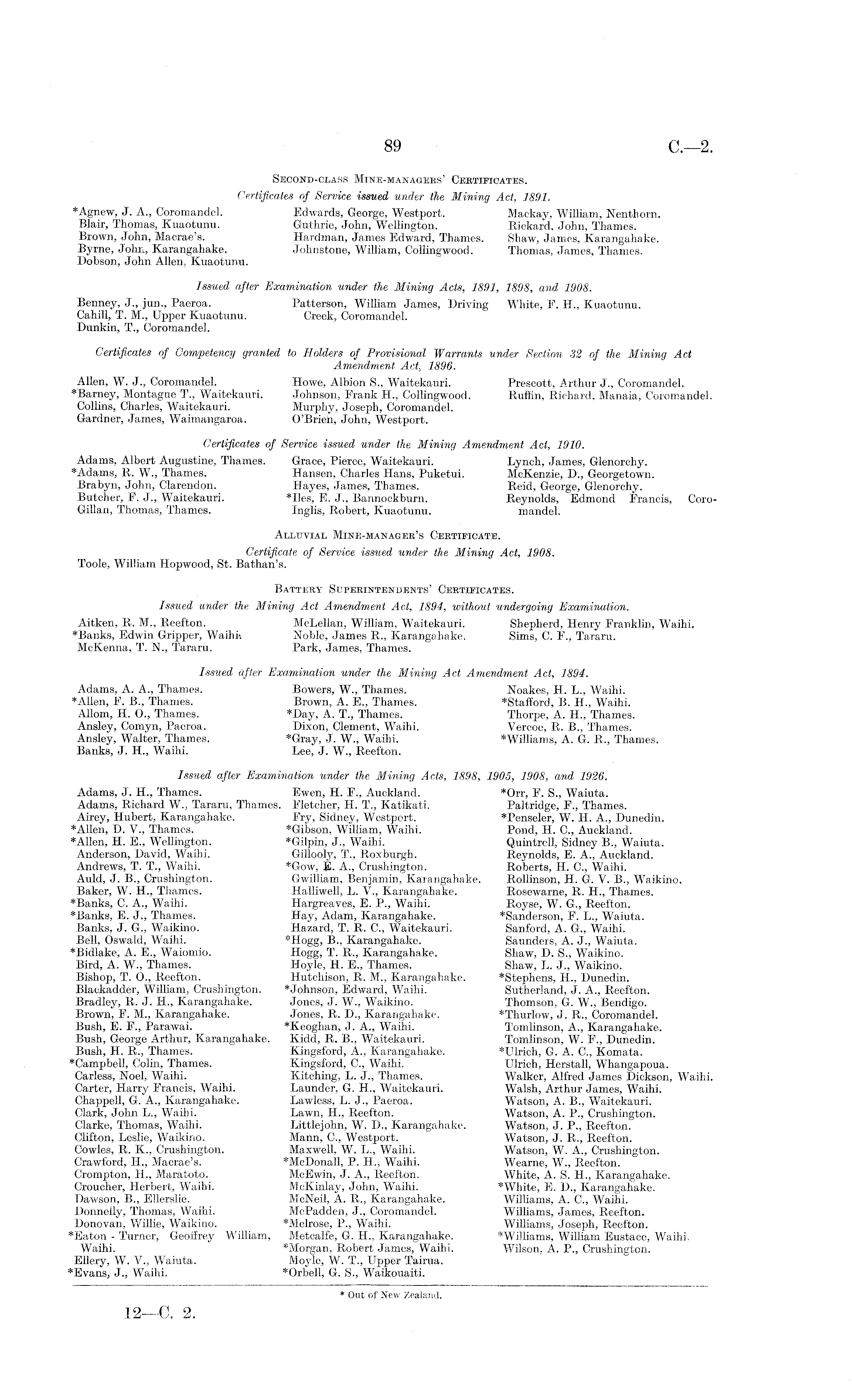 Second-class Mine-managers' Certificates. Certificates of Service issued under the Mining Act, 1891. *Agnew, J. A., Coromandel. Edwards, George, Westport. Mackay, William, Nenthorn. Blair, Thomas, Kuaotunu. Guthrie, John, Wellington. Rickard, John, Thames. Brown, John, Macrae's. Hardman, James Edward, Thames. Shaw, James, Karangahake. Byrne, John, Karangahake. Johnstone, William, Collingwood. Thomas, James, Thames. Dobson, John Allen, Kuaotunu. Issued after Examination under the Mining Acts, 1891, 1898, and 1908. Benney, J., jun., Paeroa. Patterson, William James, Driving White, F. H., Kuaotunu. Cahill, T. M., Upper Kuaotunu. Creek, Coromandel. Dunkin, T., Coromandel. Certificates of Competency granted to Holders of Provisional Warrants under Section 32 of the Mining Act Amendment Act, 1896. Allen, W. J., Coromandel. Howe, Albion S., Waitekauri. Pre Scott, Arthur J., Coromandel. *Barney, Montague T., Waitekauri. Johnson, Frank H., Collingwood. Ruffin, Richard, Manaia, Coromandel. Collins, Charles, Waitekauri. Murphy, Joseph, Coromandel. Gardner, James, Waimangaroa. O'Brien, John, Westport. Certificates of Service issued under the Mining Amendment Act, 1910. Adams, Albert Augustine, Thames. Grace, Pierce, Waitekauri. Lynch, James, Glenorchy. *Adams, R. W., Thames. Hansen, Charles Hans, Puketui. McKenzie, D., Georgetown. Brabyn, John, Clarendon. Hayes, James, Thames. Reid, George, Glenorchy. Butcher, F. J., Waitekauri. "Ties, E. J.. Bannockburn. Reynolds, Edmond Francis, CoroGillan, Thomas, Thames. Inglis, Robert, Kuaotunu. mandel. Alluvial Mine-manager's Certificate. Certificate of Service issued under the Mining Act, 1908. Toole, William Hopwood, St. Bathan's. Battery Superintendents' Certificates. Issued under the Mining Act Amendment Act, 1894, without undergoing Examination. Aitken, R. M., Reefton. McLellan, William, Waitekauri. Shepherd, Henry Franklin, Waihi. *Banks, Edwin Gripper, Waihi*. Noble, James R„ Karangahake. Sims, C. F., Tararu. McKenna, T. N., Tararu. Park, James, Thames. Issued after Examination under the Mining Act Amendment Act, 1894. Adams, A. A., Thames. Bowers, W., Thames. Noakes, H. L., Waihi. * Allen, F. 8., Thames. Brown, A. E., Thames. *Stafford, B. H., Waihi. Allom, H. 0., Thames. *Day, A. T., Thames. Thorpe, A. H., Thames. Ansley, Comyn, Paeroa. Dixon, Clement, Waihi. Vercoe, R. 8., Thames. Ansley, Walter, Thames. *Gray, J. W., Waihi. ""Williams, A. G. R., Thames. Banks, J. H., Waihi. Lee, J. W., Reefton. Issrted after Examination under the Mining Acts, 1898, 1905, 1908, and 1926. Adams, J. H., Thames. Ewen, H. F., Auckland. *Orr, F. S., Waiuta. Adams, Richard W., Tararu, Thames. Fletcher, H. T., Katikati. Paltridge, F., Thames. Airey, Hubert, Karangahake. Fry, Sidney, Westport. *Penseler, W. H. A., Dunedin. *Allen, D. V., Thames. *Gibson, William, Waihi. Pond, H. C., Auckland. * Allen, H. E., Wellington. *Gilpin, J., Waihi. Quintrell, Sidney 8., Waiuta. Anderson, David, Waihi. Gillooly, T., Roxburgh. Reynolds, E. A., Auckland. Andrews, T. T., Waihi. *Gow, B. A., Crushington. Roberts, H. C., Waihi. Auld, J. 8., Crushington. Gwilliam, Benjamin, Karangahake. Rollinson, H. G. V. 8., Waikino. Baker, W. H., Thames. Halliwell, L. V., Karangahake. Rosewarne, R. H., Thames. *Banks, C. A., Waihi. Hargreaves, E. P., Waihi. Royse, W. G., Reefton. *Banks, E. J., Thames. Hay, Adam, Karangahake. F. L., Waiuta. Banks, J. G., Waikino. Hazard, T. R. C., Waitekauri. Sanford, A. G., Waihi. Bell, Oswald, Waihi. "'Hogg, 8., Karangahake. Saunders, A. J., Waiuta. *Bidlake, A. E., Waiomio. Hogg, T. R., Karangahake. Shaw, D. S., Waikino. Bird, A. W., Thames. Hoyle, H. E., Thames. Shaw, L. J., Waikino. Bishop, T. 0., Reefton. Hutchison, R. M., Karangahake. *Stephens, H., Dunedin. Blackadder, William, Crushington. *Johnson, Edward, Waihi. Sutherland, J. A., Reefton. Bradley, R. J. H., Karangahake. Jones, J. W., Waikino. Thomson, G. W., Bendigo. Brown, F. M., Karangahake. Jones, R. D., Karangahake. *Thurlow, J. R., Coromandel. Bush, E. F., Parawai. *Keoghan, J. A., Waihi. Tomlinson, A., Karangahake. Bush, George Arthur, Karangahake. Kidd, R. 8., Waitekauri. Tomlinson, W. F., Dunedin. Bush, H. R., Thames. Kingsford, A., Karangahake. *Ulrich, G. A. C., Komata. *Campbell, Colin, Thames. Kingsford, C., Waihi. Ulrich, Herstall, Whangapoua. Carless, Noel, Waihi. Kitching, L. J., Thames. Walker, Alfred James Dickson, Waihi. Carter, Harry Francis, Waihi. Launder, G. H, Waitekauri. Walsh, Arthur James, Waihi. Chappell, G. A., Karangahake. Lawless, L. J., Paeroa. Watson, A. 8., Waitekauri. Clark, John L., Waihi. Lawn, H., Reefton. Watson, A. P., Crushington. Clarke, Thomas, Waihi. Littlejohn, W. D., Karangahake. Watson, J. P., Reefton. Clifton, Leslie, Waikino. Mann, C., Westport. Watson, J. R., Reefton. Cowles, R. K., Crushington. Maxwell, W. L., Waihi. Watson, W. A., Crushington. Crawford, H., Macrae's. *McDonall, P. H., Waihi. Wearne, W., Reefton. Crompton, H., Maratoto. McEwin, J. A., Reefton. White, A. S. H., Karangahake. Croucher, Herbert, Waihi. McKinlav, John, Waihi. *White, E. D., Karangahake. Dawson, 8., Ellerslie. McNeil, A. R., Karangahake. Williams, A. C., Waihi. Donnelly, Thomas, Waihi. McPadden, J., Coromandel. Williams, James, Reefton. Donovan, Willie, Waikino. "Melrose, P., Waihi. Williams, Joseph, Reefton. *Eaton - Turner, Geoffrey William, Metcalfe, G. H., Karangahake. *Williams, William Eustace, Waihi. Waihi. "'Morgan, Robert James, Waihi. Wilson, A. P., Crushington. Ellery, W. V., Waiuta. Moyle, W. T., Upper Tairua. *Evans, J., Waihi. *orbell, G. S., Waikouaiti.
