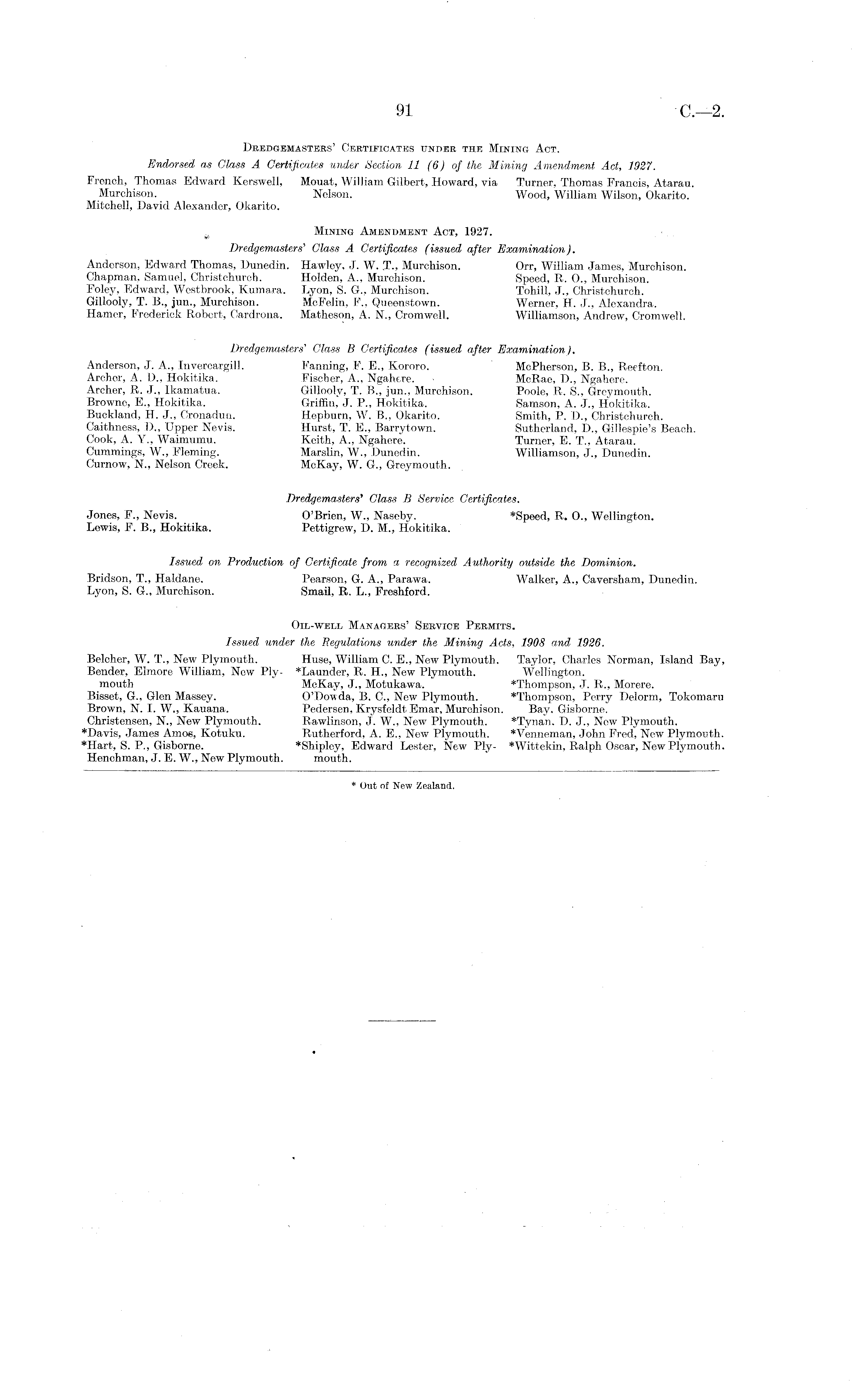 Dredgemasters' Certificates under the Mining Act. Endorsed as Class A Certificates under Section 11 (6) of the Mining Amendment Act, 1927. French, Thomas Edward Kerswell, Mouat, William Gilbert, Howard, via Turner, Thomas Francis, Atarau. Murchison. Nelson. Wood, William Wilson, Okarito. Mitchell, David Alexander, Okarito. # Mining Amendment Act, .1927. Dredgemasters'' Class A Certificates (issued after Examination). Anderson, Edward Thomas, Dunedin. Hawley. J. W. T., Murchison. Orr, William James, Murchison. Chapman, Samuel, Christchurch. Holden, A., Murchison. Speed, R. 0., Murchison. Foley, Edward, Westbrook, Kumara. Lyon, S. G., Murchison. Tohill, J., Christchurch. Gillooly, T. 8., jun., Murchison. McFelin, F., Queenstown. Werner, H. J., Alexandra. Hamer, Frederick Robert, Cardrona. Mat-heson, A. N., Cromwell. Williamson, Andrew, Cromwell. Dredgemasters , Class B Certificates (issued after Examination). Anderson, J. A., Invercargill. Fanning, F. E„ Kororo. McPherson, B. 8., Reefton. Archer, A. D„ Hokitika. Fischer, A., Ngahere. ■ Mcßae, D., Ngahere. Archer, R. J., Ikamatua. Gillooly, T. 8., jun., Murchison. Poole, R. S., Greymouth. Browne, E., Hokitika. Griffin, J. P., Hokitika. Samson, A. J., Hokitika. Buckland, H. J., Cronaduri. Hepburn, W. 8., Okarito. Smith, P. D., Christchurch. Caithness, D., Upper Nevis. Hurst, T. E., Barrytown. Sutherland, IGillespie's Beach. Cook, A. Y., Waimumu. Keith, A., Ngahere. Turner, E. T., Atarau. Cummings, W., Fleming. Marslin, W., Dunedin. Williamson, J., Dunedin. Curnow, N., Nelson Creek. McKay, W. G., Greymouth. Dredgemasters' Class B Service Certificates. Jones, F., Nevis. O'Brien, W., Naseby. *Speed, R. 0., Wellington. Lewis, F. 8., Hokitika. Pettigrew, D. M., Hokitika. Issued on Production of Certificate from a recognized Authority outside the Dominion. Bridson, T., Haldane. Pearson, G. A., Parawa. Walker, A., Caversham, Dunedin. Lyon, S. G., Murchison. Smail, R. L., Freshford. Oil-well Managers' Service Permits. Issued under the Regulations under the Mining Acts, 1908 and 1926. Belcher, W. T., New Plymouth. Huse, William C. E., New Plymouth. Taylor, Charles Norman, Island Bay, Bender, Elmore William, New Ply- *Launder, R. H., New Plymouth. Wellington. mouth McKay, J., Motukawa. Thompson, J. R., Morere. Bisset, G., Glen Massey. O'Dowda, B. C., New Plymouth. ""Thompson, Perry Delorm, Tokomaru Brown, N. I. W., Kauana. Pedersen, Krysfeldt Emar, Murchison. Bay, Gisborne. Christensen, N., New Plymouth. Rawlinson, J. W., New Plymouth. Tynan. D. J., New Plymouth. *Davis, James Amoe, Kotuku. Rutherford, A. E., New Plymouth. *Venneman, John Fred, New Plymouth. *Hart, S. P., Gisborne. *Shipley, Edward Lester, New Ply- *Wittekin, Ralph Oscar, New Plymouth. Henchman, J. E. W., New Plymouth. mouth.
