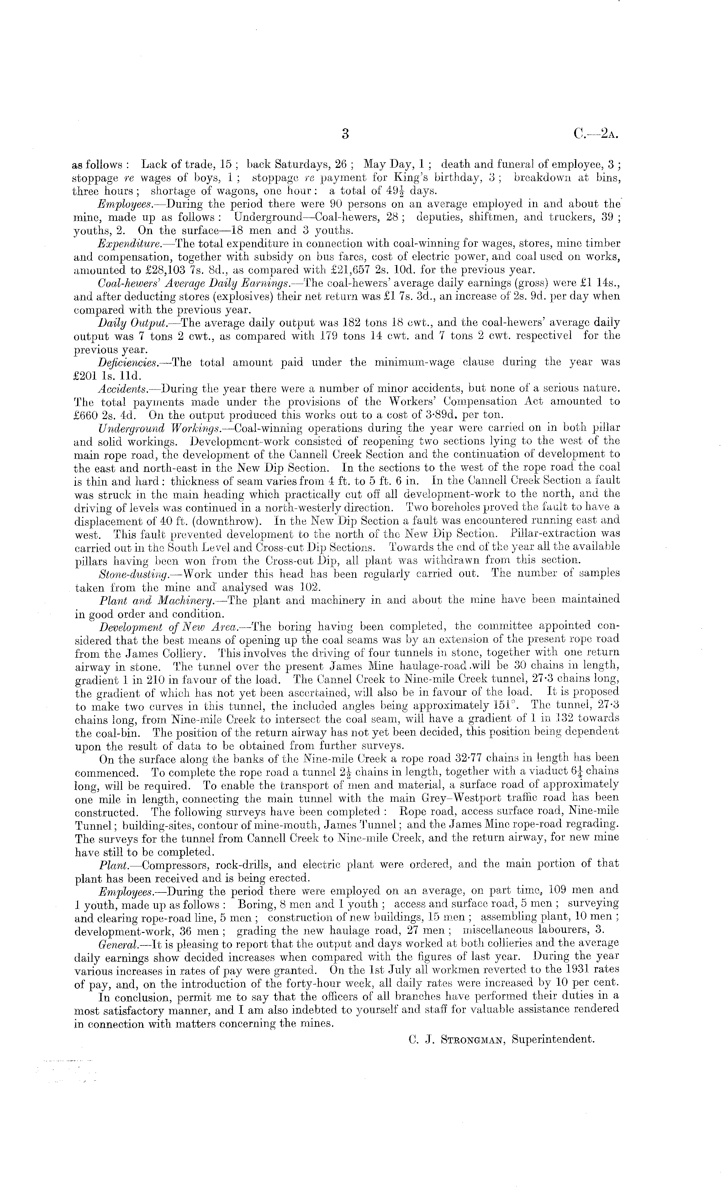 as follows : Lack of trade, 15 ; back Saturdays, 26 ; May Day, 1 ; death and funeral of employee, 3 ; stoppage re wages of boys, 1 ; stoppage re payment for King's birthday, 3 ; breakdown at bins, three hours ; shortage of wagons, one hour: a total of 49f days. Employees.—During the period there were 90 persons on an average employed in and about the mine, made up as follows : Underground —Coal-hewers, 28.; deputies, shiftmen, and truckers, 39 ; youths, 2. On the surface —18 men and 3 youths. Expenditure. —The total expenditure in connection with coal-winning for wages, stores, mine timber and compensation, together with subsidy on bus fares, cost of electric power, and coal used on works, amounted to £28,103 7s. Bd., as compared with £21,657 2s. lOd. for the previous year. Coal-hewers' Average Daily Earnings. —The coal-hewers' average daily earnings (gross) were £1 145., and after deducting stores (explosives) their net return was £1 7s. 3d., an increase of 2s. 9d. per day when compared with the previous year. Daily Output.—The average daily output was 182 tons 18 cwt., and the coal-hewers' average daily output was 7 tons 2 cwt., as compared with 179 tons 14 cwt. and 7 tons 2 cwt. respectivel for the previous year. Deficiencies. —The total amount paid under the minimum-wage clause during the year was £201 Is. lid. Accidents. —During the year there were a number of minor accidents, but none of a serious nature. The total payments made under the provisions of the Workers' Compensation Act amounted to £660 2s. 4d. On the output produced this works out to a cost of 3-89 d. per ton. Underground Workings. —Coal-winning operations during the year were carried on in both pillar and solid workings. Development-work consisted of reopening two sections lying to the west of the main rope road, the development of the Cannell Creek Section and the continuation of development to the east and north-east in the New Dip Section. In the sections to the west of the rope road the coal is thin and hard : thickness of seam varies from 4 ft. to 5 ft. 6 in. In the Cannell Creek Section a fault was struck in the main heading which practically cut off all development-work to the north, and the driving of levels was continued in a north-westerly direction. Two boreholes proved the fault to have a displacement of 40 ft. (downthrow). In the New Dip Section a fault was encountered running east and west. This fault prevented development to the north of the New Dip Section. Pillar-extraction was carried out in the South Level and Cross-cut Dip Sections. Towards the end of the year all the available pillars having been won from the Cross-cut Dip, all plant was withdrawn from this section. Stone-dusting.—Work under this head has been regularly carried out. The number of samples taken from the mine and' analysed was 102. Plant and Machinery. —The plant and machinery in and about the mine have been maintained in good order and condition. Development of New Area. —The boring having been completed, the committee appointed considered that the best means of opening up the coal seams was by an extension of the present rope road from the James Colliery. This involves the driving of four tunnels in stone, together with one return airway in stone. The tunnel over the present James Mine haulage-road .will be 30 chains in length, gradient lin 210 in favour of the load. The Cannel Creek to Nine-mile Creek tunnel, 27-3 chains long, the gradient of which has not yet been ascertained, will also be in favour of the load. It is proposed to make two curves in this tunnel, the included angles being approximately 151°. The tunnel, 27-3 chains long, from Nine-mile Creek to intersect the coal seam, will have a gradient of 1 in 132 towards the coal-bin. The position of the return airway has not yet been decided, this position being dependent upon the result of data to be obtained from further surveys. On the surface along the banks of the Nine-mile Creek a rope road 32-77 chains in length has been commenced. To complete the rope road a tunnel 2| chains in length, together with a viaduct 6J chains long, will be required. To enable the transport of men and material, a surface road of approximately one mile in length, connecting the main tunnel with the main Grey-Westport traffic road has been constructed. The following surveys have been completed : Rope road, access surface road, Nine-mile Tunnel; building-sites, contour of mine-mouth, James Tunnel; and the James Mine rope-road regrading. The surveys for the tunnel from Cannell Creek to Nine-mile Creek, and the return airway, for new mine have still to be completed. Plant. —Compressors, rock-drills, and electric plant were ordered, and the main portion of that plant has been received and is being erected. Employees. —During the period there were employed on an average, on part time* 109 men and 1 youth, made up as follows : Boring, 8 men and 1 youth ; access and surface road, 5 men ; surveying and clearing rope-road line, 5 men ; construction of new buildings, 15 men ; assembling plant, 10 men ; development-work, 36 men ; grading the new haulage road, 27 men ; miscellaneous labourers, 3. General. —It is pleasing to report that the output and days worked at both collieries and the average daily earnings show decided increases when compared with the figures of last year. During the year various increases in rates of pay were granted. On the Ist July all workmen reverted to the 1931 rates of pay, and, on the introduction of the forty-hour week, all daily rates were increased by 10 per cent. In conclusion, permit me to say that the officers of all branches have performed their duties in a most satisfactory manner, and I am also indebted to yourself and staff for valuable assistance rendered in connection with matters concerning the mines. C. J. Strongman, Superintendent.