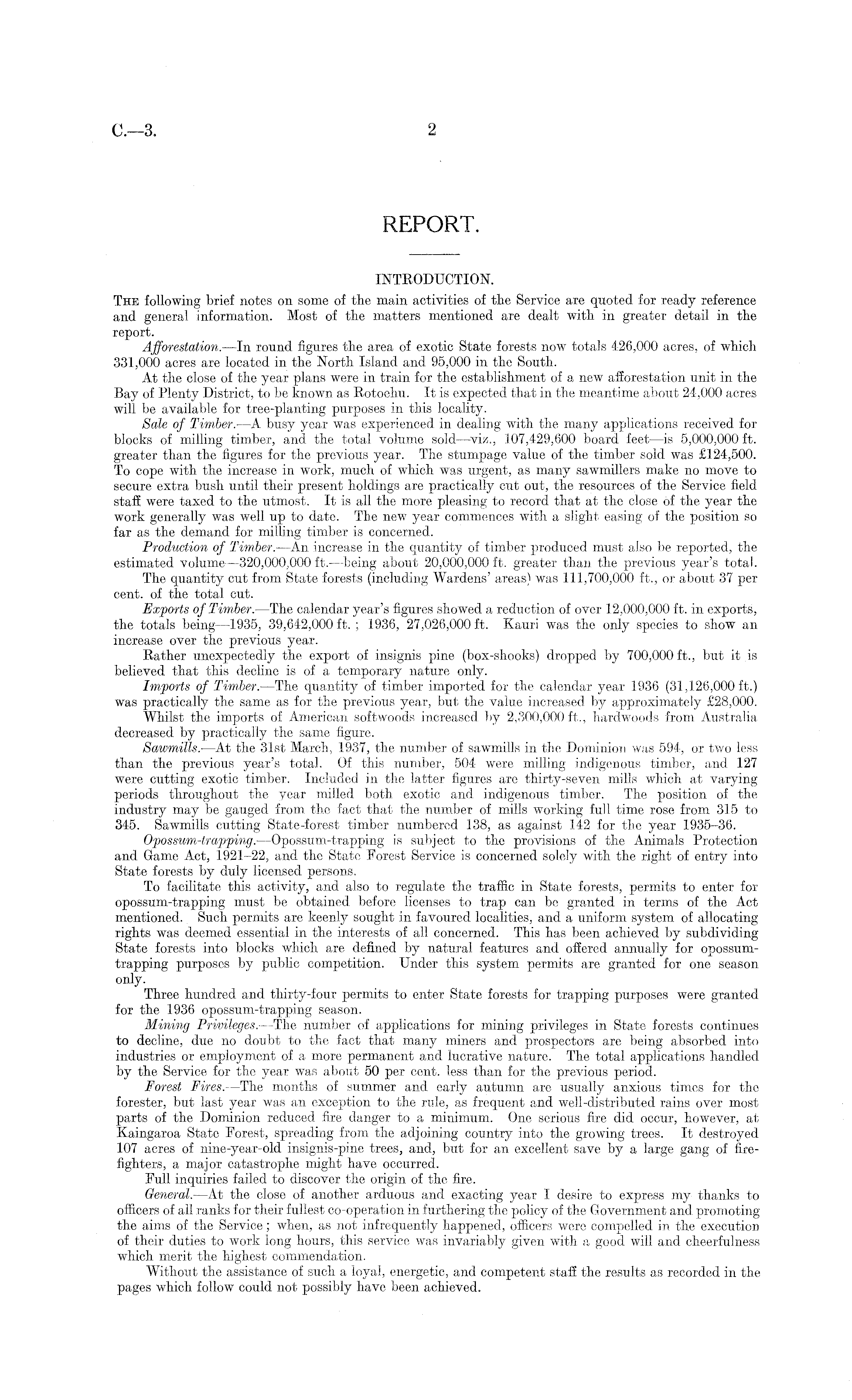INTRODUCTION. The following brief notes on some of the main activities of the Service are quoted for ready reference and general information. Most of the matters mentioned are dealt with in greater detail in the report. Afforestation. —In round figures the area of exotic State forests now totals 426,000 acres, of which 331,000 acres are located in the North Island and 95,000 in the South. At the close of the year plans were in train for the establishment of a new afforestation unit in the Bay of Plenty District, to be known as Rotoehu. It is expected that in the meantime about 24,000 acres will be available for tree-planting purposes in this locality. Sale of Timber. —A busy year was experienced in dealing with the many applications received for blocks of milling timber, and the total volume sold —viz., 107,429,600 board feet —is 5,000,000 ft. greater than the figures for the previous year. The stumpage value of the timber sold was £124,500. To cope with the increase in work, much of which was urgent, as many sawmillers make no move to secure extra bush until their present holdings are practically cut out, the resources of the Service field staff were taxed to the utmost. It is all the more pleasing to record that at the close of the year the work generally was well up to date. The new year commences with a slight easing of the position so far as the demand for milling timber is concerned. Production of Timber. —An increase in the quantity of timber produced must also be reported, the estimated volume —320,000,000 ft. —being about 20,000,000 ft. greater than the previous year's total. The quantity cut from State forests (including Wardens' areas) was 111,700,000 ft., or about 37 per cent, of the total cut. Exports of Timber.—The calendar year's figures showed a reduction of over 12,000,000 ft. in exports, the totals being —1935, 39,642,000 ft. ; 1936, 27,026,000 ft. Kauri was the only species to show an increase over the previous year. Rather unexpectedly the export of insignis pine (box-shooks) dropped by 700,000 ft., but it is believed that this decline is of a temporary nature only. Imports of Timber.—The quantity of timber imported for the calendar year 1936 (31,126,000 ft.) was practically the same as for the previous year, but the value increased by approximately £28,000. Whilst the imports of American softwoods increased by 2,300,000 ft.., hardwoods from Australia decreased by practically the same figure. Sawmills. —At the 31st March, 1937, the number of sawmills in the Dominion was 594, or two less than the previous year's total. Of this number, 504 were milling indigenous timber, and 127 were cutting exotic timber. Included in the latter figures are thirty-seven mills which at varying periods throughout the year milled both exotic and indigenous timber. The position of the industry may be gauged from the fact that the number of mills working full time rose from 315 to 345. Sawmills cutting State-forest timber numbered 138, as against 142 for the year 1935-36. Opossum-trapping.—Opossum-trapping is subject to the provisions of the Animals Protection and Game Act, 1921-22, and the State Forest Service is concerned solely with the right of entry into State forests by duly licensed persons. To facilitate this activity, and also to regulate the traffic in State forests, permits to enter for opossum-trapping must be obtained before licenses to trap can be granted in terms of the Act mentioned. Such permits are keenly sought in favoured localities, and a uniform system of allocating rights was deemed essential in the interests of all concerned. This has been achieved by subdividing State forests into blocks which are defined by natural features and offered annually for opossumtrapping purposes by public competition. Under this system permits are granted for one season only. Three hundred and thirty-four permits to enter State forests for trapping purposes were granted for the 1936 opossum-trapping season. Mining Privileges. —The number of applications for mining privileges in State forests continues to decline, due no doubt to the fact that many miners and prospectors are being absorbed into industries or employment of a more permanent and lucrative nature. The total applications handled by the Service for the year was about 50 per cent, less than for the previous period. Forest Fires.—The months of summer and early autumn are usually anxious times for the forester, but last year was an exception to the rule, as frequent and well-distributed rains over most parts of the Dominion reduced fire danger to a minimum. One serious fire did occur, however, at Kaingaroa State Forest, spreading from the adjoining country into the growing trees. It destroyed 107 acres of nine-year-old insignis-pine trees, and, but for an excellent save by a large gang of firefighters, a major catastrophe might have occurred. Full inquiries failed to discover the origin of the fire. General. —At the close of another arduous and exacting year I desire to express my thanks to officers of all ranks for their fullest co-operation in furthering the policy of the Government and promoting the aims of the Service; when, as not infrequently happened, officers were compelled in the execution of their duties to work long hours, this service was invariably given with a good will and cheerfulness which merit the highest commendation. Without the assistance of such a loyal, energetic, and competent staff the results as recorded in the pages which follow could not possibly have been achieved.