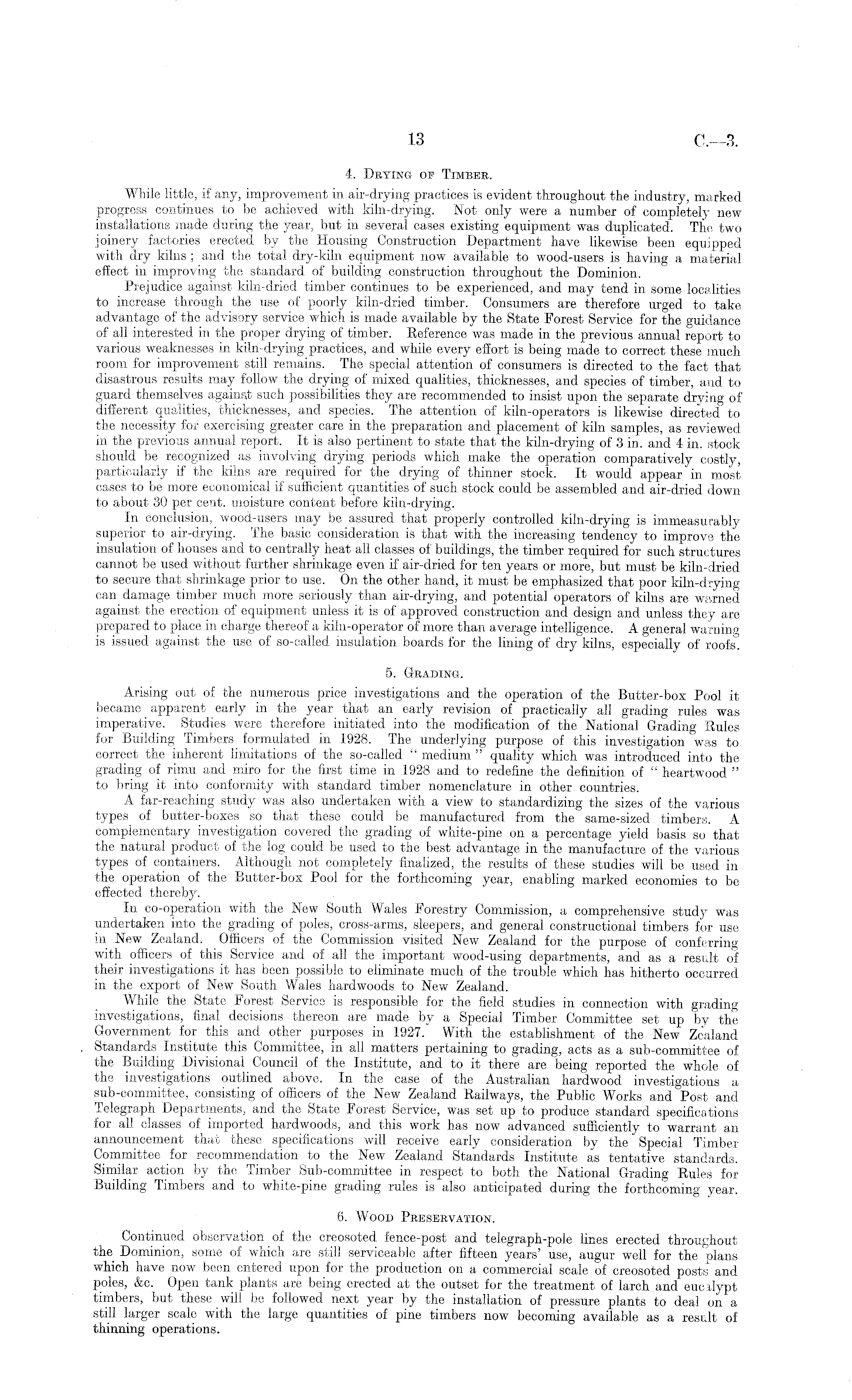 4. Drying of Timber. While little, if any, improvement in air-drying practices is evident throughout the industry, marked progress continues to be achieved with kiln-drying. Not only were a number of completely new installations made during the year, but in several cases existing equipment was duplicated. The two joinery factories erected by the Housing Construction Department have likewise been equipped with dry kilns ; and the total dry-kiln equipment now available to wood-users is having a material efiect in improving the standard of building construction throughout the Dominion. Prejudice against kiln-dried timber continues to be experienced, and may tend in some localities to increase through the use of poorly kiln-dried timber. Consumers are therefore urged to take advantage of the advisory service which is made available by the State Forest Service for the guidance of all interested in the proper drying of timber. Reference was made in the previous annual report to various weaknesses in kiln-drying practices, and while every effort is being made to correct these much room for improvement still remains. The special attention of consumers is directed to the fact that disastrous results may follow the drying of mixed qualities, thicknesses, and species of timber, and to guard themselves against such possibilities they are recommended to insist upon the separate drying of different qualities, thicknesses, and species. The attention of kiln-operators is likewise directed to the necessity for exercising greater care in the preparation and placement of kiln samples, as reviewed in the previous annual report. It is also pertinent to state that the kiln-drying of 3 in. and i in. stock should be recognized as involving drying periods which make the operation comparatively costly, particularly if the kilns are required for the drying of thinner stock. It would appear in most cases to be more economical if sufficient quantities of such stock could be assembled and air-dried down to about 30 per cent, moisture content before kiln-drying. In conclusion, wood-users may be assured that properly controlled kiln-drying is immeasurably superior to air-drying. The basic consideration is that with the increasing tendency to improve the insulation of houses and to centrally heat all classes of buildings, the timber required for such structures cannot be used without further shrinkage even if air-dried for ten years or more, but must be kiln-dried to secure that shrinkage prior to use. On the other hand, it must be emphasized that poor kiln-drying can damage timber much more seriously than air-drying, and potential operators of kilns are warned against the erection of equipment unless it is of approved construction and design and unless they are prepared to place in charge thereof a kiln-operator of more than average intelligence. A general warning is issued against the use of so-called insulation boards for the lining of dry kilns, especially of roofs". 5. Grading. Arising out of the numerous price investigations and the operation of the Butter-box Pool it became apparent early in the year that an early revision of practically all grading rules was imperative. Studies were therefore initiated into the modification of the National Grading Rules for Building Timbers formulated in 1928. The underlying purpose of this investigation was to correct the inherent limitations of the so-called " medium " quality which was introduced into the grading of rimu and miro for the first time in 1928 and to redefine the definition of " heartwood " to bring it into conformity with standard timber nomenclature in other countries. A far-reaching study was also undertaken with a view to standardizing the sizes of the various types of butter-boxes so that these could be manufactured from the same-sized timbers. A complementary investigation covered the grading of white-pine on a percentage yield basis so that the natural product of the log could be used to the best advantage in the manufacture of the various types of containers. Although not completely finalized, the results of these studies will be used in the operation of the Butter-box Pool for the forthcoming year, enabling marked economies to be effected thereby. In co-operation with the New South Wales Forestry Commission, a comprehensive study was undertaken into the grading of poles, cross-arms, sleepers, and general constructional timbers for use in New Zealand. Officers of the Commission visited New Zealand for the purpose of conferring with officers of this Service and of all the important wood-using departments, and as a result of their investigations it has been possible to eliminate much of the trouble which has hitherto occurred in the export of New South Wales hardwoods to New Zealand. While the State Forest Service is responsible for the field studies in connection with grading investigations, final decisions thereon are made by a Special Timber Committee set up by the Government for this and other purposes in 1927." With the establishment of the New Zealand Standards Institute this Committee, in all matters pertaining to grading, acts as a sub-committee of the Building Divisional Council of the Institute, and to it there are being reported the whole of the investigations outlined above. In the case of the Australian hardwood investigations a sub-committee, consisting of officers of the New Zealand Railways, the Public Works and Post and Telegraph Departments, and the State Forest Service, was set up to produce standard specifications for all classes of imported hardwoods, and this work has now advanced sufficiently to warrant an announcement that these specifications will receive early consideration by the Special Timber Committee for recommendation to the New Zealand Standards Institute as tentative standards. Similar action by the Timber Sub-committee in respect to both the National Grading Rules for Building Timbers and to white-pine grading rules is als