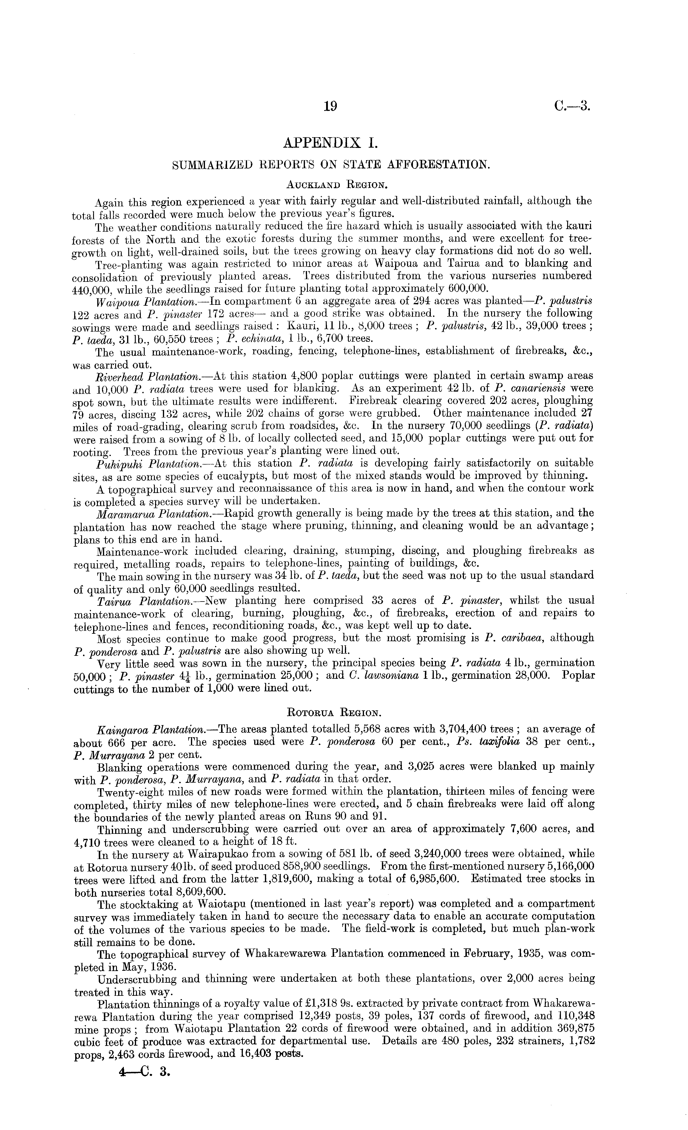 APPENDIX I. SUMMARIZED REPORTS ON STATE AFFORESTATION. Auckland Reg-ion. Again this region experienced a year with fairly regular and well-distributed rainfall, although the total falls recorded were much below the previous year's figures. The weather conditions naturally reduced the fire hazard which is usually associated with the kauri forests of the North and the exotic forests during the summer months, and were excellent for treegrowth on light, well-drained soils, but the trees growing on heavy clay formations did not do so well. Tree-planting was again restricted to minor areas at Waipoua and Tairua and to blanking and consolidation of previously planted areas. Trees distributed from the various nurseries numbered 440,000, while the seedlings raised for future planting total approximately 600,000. Waipoua Plantation. —In compartment 6an aggregate area of 294 acres was planted —P. palustris 122 acres and P. pinaster 172 acres — and a good strike was obtained. In the nursery the following sowings were made and seedlings raised : Kauri, 11 lb., 8,000 trees ; P. palustris, 42 lb., 39,000 trees ; P. taeda, 31 lb., 60,550 trees ; P. echinata, 1 lb., 6,700 trees. The usual maintenance-work, roading, fencing, telephone-lines, establishment of firebreaks, &e., was carried out. Riverhead Plantation. —At this station 4,800 poplar cuttings were planted in certain swamp areas and 10,000 P. radiata trees were used for blanking. As an experiment 42 lb. of P. canariensis were spot sown, but the ultimate results were indifferent. Firebreak clearing covered 202 acres, ploughing 79 acres, discing 132 acres, while 202 chains of gorse were grubbed. Other maintenance included 27 miles of road-grading, clearing scrub from roadsides, &c. In the nursery 70,000 seedlings (P. radiata) were raised from a sowing of 8 lb. of locally collected seed, and 15,000 poplar cuttings were put out for rooting. Trees from the previous year's planting were lined out. Puhipuhi Plantation. —At this station P. radiata is developing fairly satisfactorily on suitable sites, as are some species of eucalypts, but most of the mixed stands would be improved by thinning. A topographical survey and reconnaissance of this area is now in hand, and when the contour work is completed a species survey will be undertaken. Maramarua Plantation. —Rapid growth generally is being made by the trees at this station, and the plantation has now reached the stage where pruning, thinning, and cleaning would be an advantage; plans to this end are in hand. Maintenance-work included clearing, draining, stumping, discing, and ploughing firebreaks as required, metalling roads, repairs to telephone-lines, painting of buildings, &c. The main sowing in the nursery was 34 lb. of P. taeda, but the seed was not up to the usual standard of quality and only 60,000 seedlings resulted. Tairua Plantation. —New planting here comprised 33 acres of P. pinaster, whilst the usual maintenance-work of clearing, burning, ploughing, &c., of firebreaks, erection of and repairs to telephone-lines and fences, reconditioning roads, &c., was kept well up to date. Most species continue to make good progress, but the most promising is P. caribaea, although P. ponderosa and P. palustris are also showing up well. Very little seed was sown in the nursery, the principal species being P. radiata 4 lb., germination 50,000 ; P. pinaster 4J lb., germination 25,000 ; and C. lawsoniana 1 lb., germination 28,000. Poplar cuttings to the number of 1,000 were lined out. Rotorua Region. Kaingaroa Plantation. —The areas planted totalled 5,568 acres with 3,704,400 trees ; an average of about 666 per acre. The species used were P. ponderosa 60 per cent., Ps. taxifolia 38 per cent., P. Murrayana 2 per cent. Blanking operations were commenced during the year, and 3,025 acres were blanked up mainly with P. ponderosa, P. Murrayana, and P. radiata in that order. Twenty-eight miles of new roads were formed within the plantation, thirteen miles of fencing were completed, thirty miles of new telephone-lines were erected, and 5 chain firebreaks were laid off along the boundaries of the newly planted areas on Runs 90 and 91. Thinning and underscrubbing were carried out over an area of approximately 7,600 acres, and 4,710 trees were cleaned to a height of 18 ft. In the nursery at Wairapukao from a sowing of 581 lb. of seed 3,240,000 trees were obtained, while at Rotorua nursery 401b. of seed produced 858,900 seedlings. From the first-mentioned nursery 5,166,000 trees were lifted and from the latter 1,819,600, making a total of 6,985,600. Estimated tree stocks in both nurseries total 8,609,600. The stocktaking at Waiotapu (mentioned in last year's report) was completed and a compartment survey was immediately taken in hand to secure the necessary data to enable an accurate computation of the volumes of the various species to be made. The field-work is completed, but much plan-work still remains to be done. The topographical survey of Whakarewarewa Plantation commenced in February, 1935, was completed in May, 1936. Underscrubbing and thinning were undertaken at both these plantations, over 2,000 acres being treated in this way. Plantation thinnings of a royalty value of £1,318 9s. extracted by private contract from Whakarewarewa Plantation during the year comprised 12,349 posts, 39 poles, 137 cords of firewood, and 110,348 mine props ; from Waiotapu Plantation 22 cords of firewood were obtained, and in addition 369,875 cubic feet of produce was extracted for departmental use. Details are 480 poles, 232 strainers, 1,782 props, 2,463 cords firewood, and 16,403 posts.