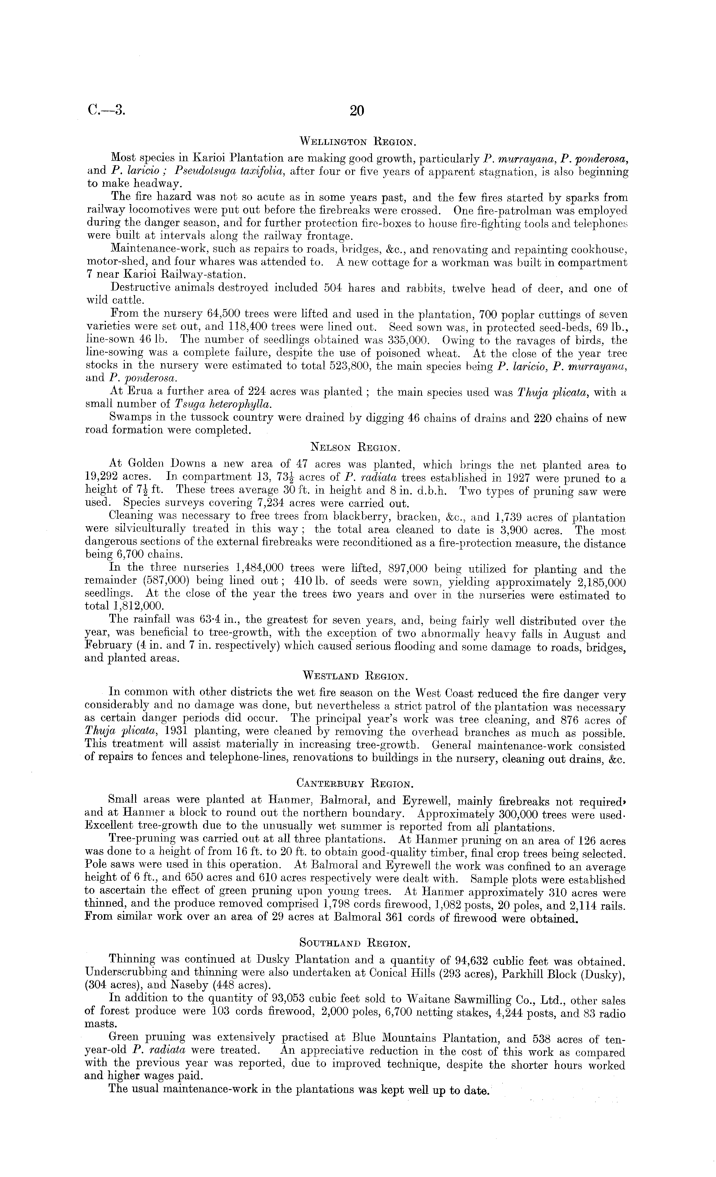 Wellington Region. Most species in Karioi Plantation are making good growth., particularly P. murrayana, P. ponderosa, and P. laricio ; Pseudotsuga taxifolia, after four or five years of apparent stagnation, is also beginning to make headway. The fire hazard was not so acute as in some years past, and the few fires started by sparks from railway locomotives were put out before the firebreaks were crossed. One fire-patrolman was employed during the danger season, and for further protection fire-boxes to house fire-fighting tools and telephones were built at intervals along the railway frontage. Maintenance-work, such as repairs to roads, bridges, &c., and renovating and repainting cookhouse, motor-shed, and four whares was attended to. A new cottage for a workman was built in compartment 7 near Karioi Railway-station. Destructive animals destroyed included 504 hares and rabbits, twelve head of deer, and one of wild cattle. From the nursery 64,500 trees were lifted and used in the plantation, 700 poplar cuttings of seven varieties were set out, and 118,400 trees were lined out. Seed sown was, in protected seed-beds, 69 lb., line-sown 46 lb. The number of seedlings obtained was 335,000. Owing to the ravages of birds, the line-sowing was a complete failure, despite the use of poisoned wheat. At the close of the year tree stocks in the nursery were estimated to total 523,800, the main species being P. laricio, P. murrayana, and P. ponderosa. At Erua a further area of 224 acres was planted ; the main species used was Thuja plicata, with a small number of Tsuga heterophylla. Swamps in the tussock country were drained by digging 46 chains of drains and 220 chains of new road formation were completed. Nelson Region. At Golden Downs a new area of 47 acres was planted, which brings the net planted area to 19,292 acres. In compartment 13, 73J acres of P. radiata trees established in 1927 were pruned to a height of 7| ft. These trees average 30 ft. in height and 8 in. d.b.h. Two types of pruning saw were used. Species surveys covering 7,234 acres were carried out. Cleaning was necessary to free trees from blackberry, bracken, &c., and 1,739 acres of plantation were silviculturally treated in this way; the total area cleaned to date is 3,900 acres. The most dangerous sections of the external firebreaks were reconditioned as a fire-protection measure, the distance being 6,700 chains. In the three nurseries 1,484,000 trees were lifted, 897,000 being utilized for planting and the remainder (587,000) being lined out; 410 lb. of seeds were sown, yielding approximately 2,185,000 seedlings. At the close of the year the trees two years and over in the nurseries were estimated to total 1,812,000. The rainfall was 63-4 in., the greatest for seven years, and, being fairly well distributed over the year, was beneficial to tree-growth, with the exception of two abnormally heavy falls in August and February (4- in. and 7 in. respectively) which caused serious flooding and some damage to roads, bridges, and planted areas. Westland Region. In common with other districts the wet fire season on the West Coast reduced the fire danger very considerably and no damage was done, but nevertheless a strict patrol of the plantation was necessary as certain danger periods did occur. The principal year's work was tree cleaning, and 876 acres of Thuja plicata, 1931 planting, were cleaned by removing the overhead branches as much as possible. This treatment will assist materially in increasing tree-growth. General maintenance-work consisted of repairs to fences and telephone-lines, renovations to buildings in the nursery, cleaning out drains, &c. Canterbury Region. Small areas were planted at Hanmer, Balmoral, and Eyrewell, mainly firebreaks not required» and at Hanmer a block to round out the northern boundary. Approximately 300,000 trees were usedExcellent tree-growth due to the unusually wet summer is reported from all plantations. Tree-pruning was carried out at all three plantations. At Hanmer pruning on an area of 126 acres was done to a height of from 16 ft. to 20 ft. to obtain good-quality timber, final crop trees being selected. Pole saws were used in this operation. At Balmoral and Eyrewell the work was confined to an average height of 6 ft., and 650 acres and 610 acres respectively were dealt with. Sample plots were established to ascertain the effect of green pruning upon young trees. At HaUmer approximately 310 acres were thinned, and the produce removed comprised 1,798 cords firewood, 1,082 posts, 20 poles, and 2,114 rails. From similar work over an area of 29 acres at Balmoral 361 cords of firewood were obtained. Southland Region. Thinning was continued at Dusky Plantation and a quantity of 94,632 cublic feet was obtained. Underscrubbing and thinning were also undertaken at Conical Hills (293 acres), Parkhill Block (Dusky) (304 acres), and Naseby (448 acres). In addition to the quantity of 93,053 cubic feet sold to Waitane Sawmilling Co., Ltd., other sales of forest produce were 103 cords firewood, 2,000 poles, 6,700 netting stakes, 4,244 posts, and 83 radio masts. Green pruning was extensively practised at Blue Mountains Plantation, and 538 acres of ten-year-old P. radiata were treated. An appreciative reduction in the cost of this work as compared with the previous year was reported, due to improved technique, despite the shorter hours worked and higher wages paid. The usual maintenance-work in the plantations was kept well up to date.