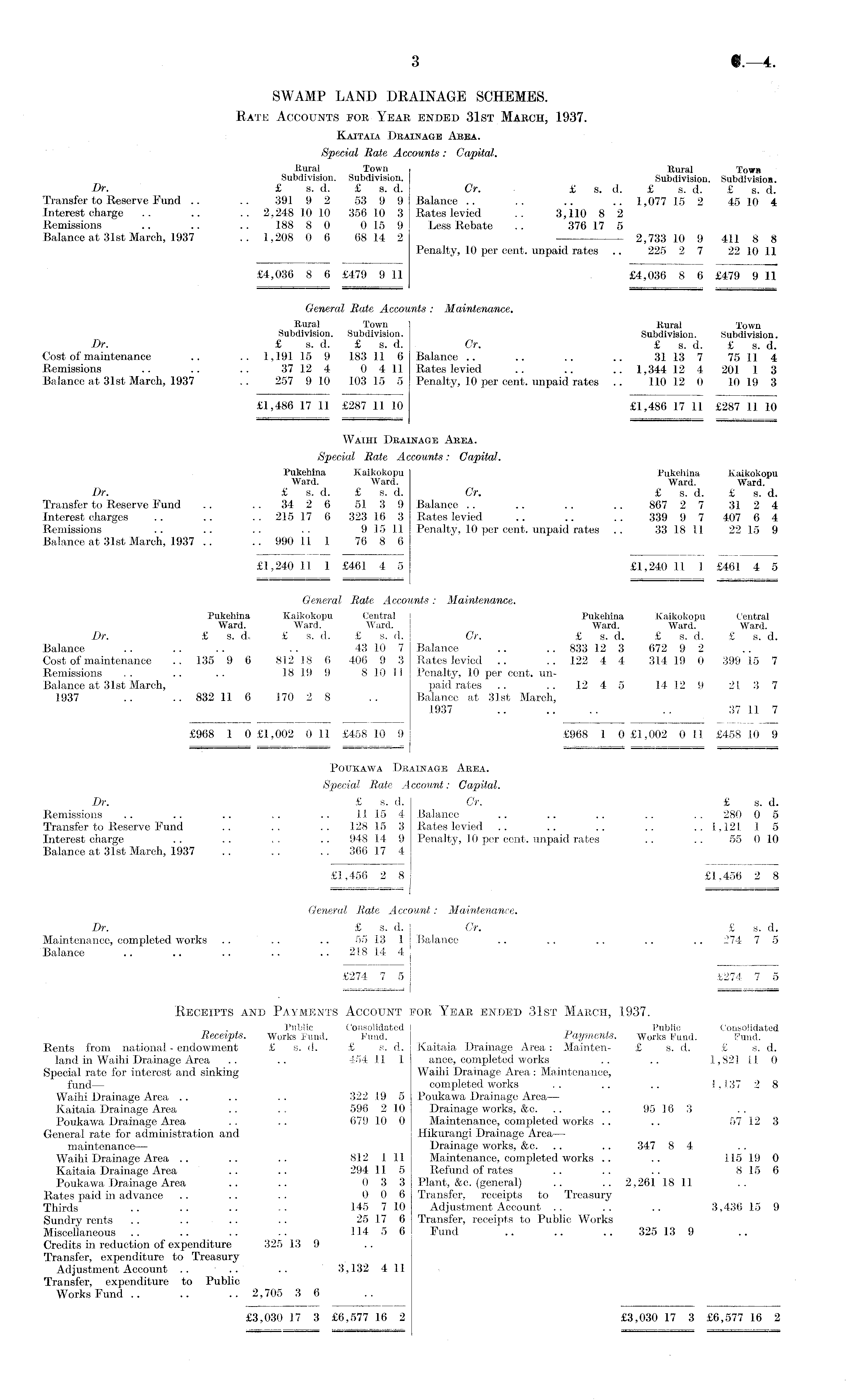 SWAMP LAND DRAINAGE SCHEMES. Rate Accounts for Year ended 31st March, 1937. Kaitaia IJeaoage Abea. Special Rate Accounts : Capital. Rural Town Rural To»b Subdivision. Subdivision. Subdivision. Subdivision Dr■ £ s. d. £ s. d. Cr. £ s. d. £ s. d. £ s. d. Transfer to Reserve Fund .. .. 391 9 2 53 9 9 Balance .. .. .. .. 1,077 15 2 45 10 4 Interest charge .. .. .. 2,248 10 10 356 10 3 Rates levied .. 3,110 8 2 Remissions .. .. .. 188 8 0 0 15 9 Less Rebate .. 376 17 5 Balance at 31st March, 1937 .. 1,208 0 6 68 14 2 2,733 10 9 411 8 8 Penalty, 10 per cent, unpaid rates ... 225 2 7 22 10 11 £4,036 8 6 £479 9 11 £4,036 8 6 £479 9 11 General Rate Accounts : Maintenance. Rural Town Rural Town Subdivision. Subdivision. Subdivision. Subdivision. Dr. £ s. d. £ s. d. Cr. £ s. d. £ s. d. Cost of maintenance .. .. 1,191 15 9 183 11 6 Balance .. .. .. .. 31 13 7 75 11 4 Remissions .. .. .. 37 12 4 0 411 Rates levied .. .. .. 1,344 12 4 201 1 3 Balance at 31st March, 1937 .. 257 910 103 15 5 Penalty, 10 per cent, unpaid rates .. 110 12 0 10 19 3 £1,486 17 11 £287 11 10 £1,486 17 11 £287 11 10 Waihi Drainage Abea. Special Rate Accounts: Capital. Pukehina Kaikokopu Pukehina Kaikokopu Ward. Ward. Ward. Ward. Dr. £ s. d. £ s. d. Cr. £ s. d. £ s. d. Transfer to Reserve Fund .. .. 34 2 6 51 3 9 Balance .. .. .. .. 867 2 7 31 2 4 Interest charges .. .. .. 215 17 6 323 16 3 Rates levied .. .. .. 339 9 7 407 6 4 Remissions .. .. .. .. 9 15 11 Penalty, 10 per cent, unpaid rates .. 33 18 11 22 15 9 Balance at 31st March, 1937 .. .. 990 11 1 76 8 6 £1,240 11 1 £461 4 5 £1,240 11 1 £461 4 5 General Rate Accounts: Maintenance. Pukehina Kaikokopu Central Pukehina Kaikokopu Central Ward. Ward. Ward. Ward. Ward. Ward. Dr. £ s. d. £ s. d. £ s. d. Cr. £ s. d. £ s. d. £ s. d. Balance .. .. .. .. 43 10 7 Balance .. .. 833 12 3 672 9 2 Cost of maintenance .. 135 9 6 812 18 6 406 9 3 Rates levied .. .. 122 4 4 314 19 0 399 15 7 Remissions .. .. .. 18 19 9 8 10 11 Penalty, 10 per cent, unBalance at 31st March, paid rates .. .. 12 4 5 14 12 9 21 3 7 1937 .. .. 832 11 6 170 2 8 .. Balance at 31st March, 1937 .. .. .. .. 37 11 7 £968 1 0 £1,002 0 11 £458 10 9 £968 1 0 £1,002 0 11 £458 10 9 Pottkawa Drainage Abea. Special Rate Account: Capital. Dr. £ s. d. Cr. £ s. d. Remissions .. .. .. .. .. 11 15 4 Balance .. .. .. .. .. 280 0 5 Transfer to Reserve Fund .. .. .. 128 15 3 Rates levied. .. .. .. .. .. 1,121 1 5 Interest charge .. .. .. .. 948 14 9 Penalty, 10 per cent, unpaid rates .. .. 55 0 10 Balance at 31st March, 1937 .. .. .. 366 17 4 £1,456 2 8 £1,456 2 8 General Rate Account: Maintenance. Dr. £ s. d. Cr. £ s. d. Maintenance, completed works .. .. .. 55 13 1 Balance .. .. .. .. .. 274 7 5 Balance .. .. .. .. .. 218 14 4 £274 7 5 £274 7 5 Receipts and Payments Account for Year ended 31st March, 1937. . Public Consolidated Public Consolidated Receipts. Works Fund. Fund. rayments. Works Fund. Fund. Rents from national - endowment £ s. d. £ s. d. Kaitaia Drainage Area : Mainten- £ s. d. £ s. d. land in Waihi Drainage Area .. .. 454 11 1 ance, completed works .. .. 1,821 11. 0 Special rate for interest and sinking Waihi Drainage Area: Maintenance, fund — completed works .. .. .. 1,137 2 8 Waihi Drainage Area .. .. .. 322 19 5 Poukawa Drainage Area— Kaitaia Drainage Area .. .. 596 210 Drainage works, &c. .. .. 95 16 3 Poukawa Drainage Area .. .. 679 10 0 Maintenance, completed works .. .. 57 12 3 General rate for administration and Hikurangi Drainage Area — maintenance — Drainage works, &c. .. .. 347 8 4 Waihi Drainage Area .. .. .. 812111 Maintenance, completed works .. .. 115 19 0 Kaitaia Drainage Area .. .. 294 11 5 Refund of rates .. .. .. 8 15 6 Poukawa Drainage Area .. .. 0 3 3 Plant, &c. (general) .. .. 2,261 18 11 Rates paid in advance .. .. .. 0 0 6 Transfer, receipts to Treasury Thirds .. .. .. .. 145 7 10 Adjustment Account .. .. .. 3,436 15 9 Sundry rents .. .. .. .. 25 17 6 Transfer, receipts to Public Works Miscellaneous .. .. .. .. 114 5 6 Fund .. .. .. 325 13 9 Credits in reduction of expenditure 325 13 9 Transfer, expenditure to Treasury Adjustment Account .. .. .. 3,132 4 11 Transfer, expenditure to Public Works Fund .. .. .. 2,705 3 6 £3,030 17 3 £6,577 16 2 £3,030 17 3 £6,577 16 2