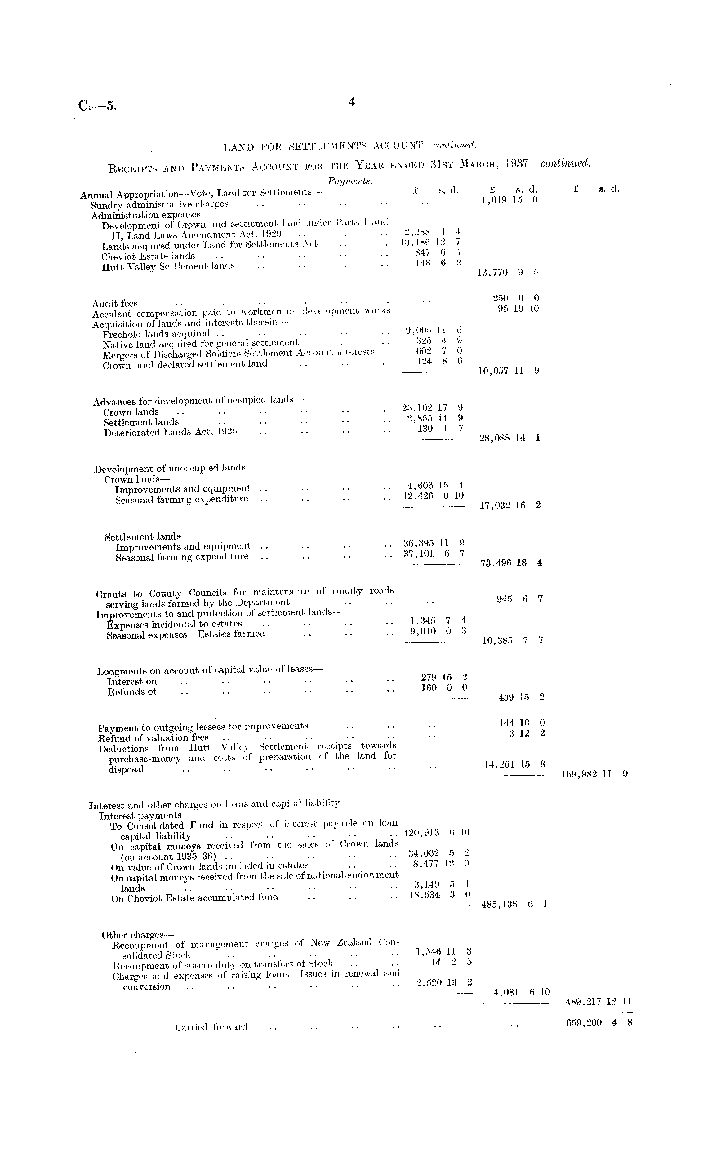 LAND FOR SETTLEMENTS ACCOUNT—continued. Receipts and Payments Account fob the Year ended 31st March, 1937—continued. Payments. Annual Appropriation—Vote, Land for Settlements— £ s. d. £ s. d. £ ». d. Sundry administrative charges .. .. •• •• I,u Administration expenses— Development of Crpwn and settlement land under Parts 1 and 11, Land Laws Amendment Act, 1929 .. .. 2,288 4 4 Lands acquired under Land for Settlements Act . . .. 10,48b 1Z 7 Cheviot Estate lands .. .. ° 4 Hutt Valley Settlement lands .. . . • • • • +48 " |;i 77Q 0 g Audit fees • • • • •• • ■ 250 0 0 Accident compensation paid to workmen on development works .. 95 19 10 Acquisition of lands and interests therein— Freehold lands acquired .. •• •• 'XI. ' £ Native land acquired for general settlement . . • • ® 4 9 Mergers of Discharged Soldiers Settlement Account interests .. 602 7 0 Crown land declared settlement land .. •• •• 124 8 6 10 057 n 9 Advances for development of occupied lands — Crown lands 25,102 17 9 Settlement lands .. •• •• ■■ •• 2 '® 4 ® Deteriorated Lands Act, 1925 .. .. • • • • Development of unoccupied lands — Crown lands— , ~ . Improvements and equipment .. .. •• *><>"« j! u \ Seasonal farming expenditure .. .. •• 12,42b 17 032 16 2 Settlement lands— Improvements and equipment .. .. " 07'Vni fi 7 Seasonal farming expenditure .. .. • • • • 37,101 b 7 Grants to County Councils for maintenance of county roads serving lands farmed by the Department .. .. • ■ • • 94b b / Improvements to and protection of settlement lands Expenses incidental to estates .. .. •• •• -Uj>4s 7 Seasonal expenses—Estates farmed .. • • • • 9,040 u d 1Q 3gg ? 7 Lodgments on account of capital value of leases — Interest on fin a n Refunds - 439 15 2 Payment to outgoing lessees for improvements .. -. • • 12 2 Refund of valuation fees .. . ■ ■ • • • • • Deductions from Hutt Valley Settlement receipts towards purchase-money and costs of preparation of the land for Ti .. .• 14,Z0l ID o disposal .. •• •• •• •• 169,982 11 9 Interest and other charges on loans and capital liability— Interest payments— To Consolidated Fund in respect of interest payable 011 loan capital liability .. •• •• •• •• 420,913 0 10 On capital moneys received from the sales of Crown lands (on account 1935-36) .. •• •• ,5 „ On value of Crown lands included in estates .. .. 8,477 12 0 On capital moneys received from the sale of national-endowment lands .. •• •• •• •• •• 3,149 5 1 On Cheviot Estate accumulated fund .. .. •• 18,534 3 0 485,136 6 1 Other charges— Recoupment of management charges of New Zealand Consolidated Stock !> 54 6 il 3 Recoupment of stamp duty on transfers of Stock .. .. 14-5 Charges and expenses of raising loans —Issues in renewal and 2 ' 4,081 6 10 489,217 12 11 Carried forward •• 659 " 200 4 8