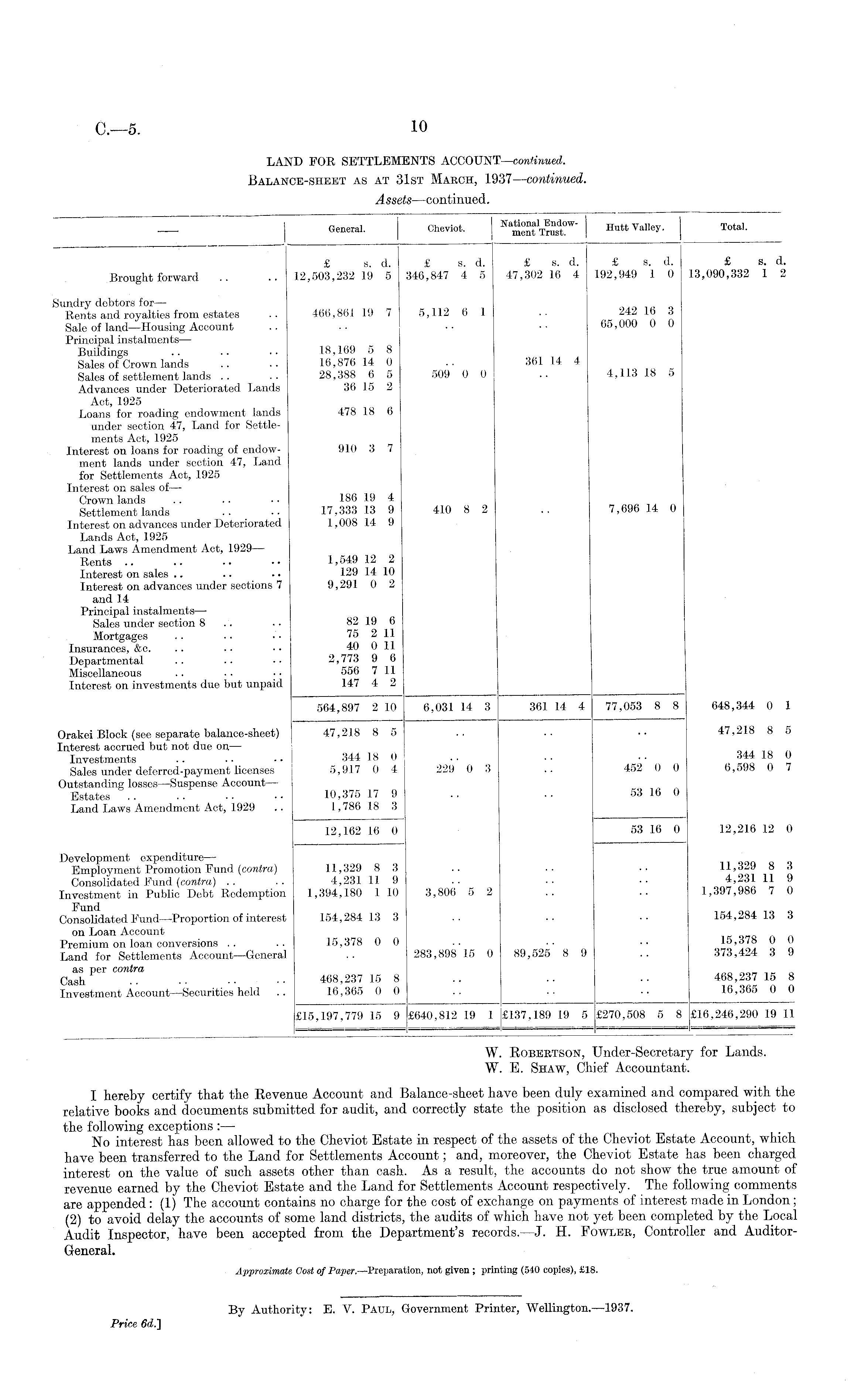 W. Robertson, Under-Secretary for Lands. W. E. Shaw, Chief Accountant. I hereby certify that the Revenue Account and Balance-sheet have been duly examined and compared with the relative books and documents submitted for audit, and correctly state the position as disclosed thereby, subject to the following exceptions No interest has been allowed to the Cheviot Estate in respect of the assets of the Cheviot Estate Account, which have been transferred to the Land for Settlements Account; and, moreover, the Cheviot Estate has been charged interest on the value of such assets other than cash. As a result, the accounts do not show the true amount of revenue earned by the Cheviot Estate and the Land for Settlements Account respectively. The following comments are appended: (1) The account contains no charge for the cost of exchange on payments of interest made in London; (2) to avoid delay the accounts of some land districts, the audits of which have not yet been completed by the Local Audit Inspector, have been accepted from the Department's records.—-J. H. Fowler, Controller and AuditorGeneral. Approximate Cost of Paper.—Preparation, not given ; printing (540 copies), £18.