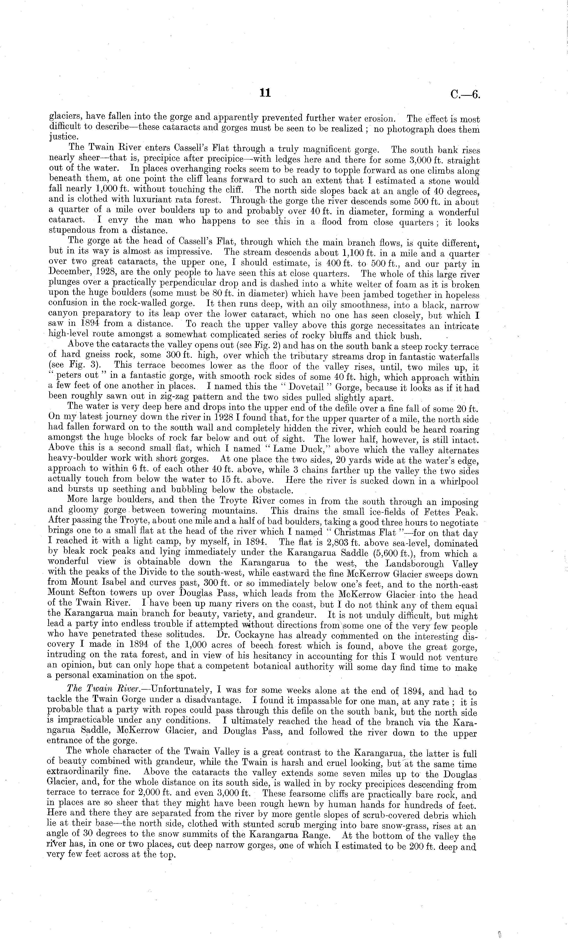 glaciers, have fallen into the gorge and apparently prevented further water erosion. The effect is most difficult to describe—these cataracts and gorges must be seen to be realized ;no photograph does them justice. The Twain River enters Cassell's Flat through a truly magnificent gorge. The south bank rises nearly sheer—that is, precipice after precipice—with ledges here and there for some 3,000 ft. straight out of the water. In places overhanging rocks seem to be ready to topple forward as one climbs along beneath them, at one point the cliff leans forward to such an extent that I estimated a stone would fall nearly 1,000 ft. without touching the cliff. The north side slopes back at an angle of 40 degrees, and is clothed with luxuriant rata forest. Through-the gorge the river descends some 500 ft. in about a quarter of a mile over boulders up to and probably over 40 ft. in diameter, forming a wonderful cataract. I envy the man who happens to see this in a flood from close quarters ; it looks stupendous from a distance. The gorge at the head of Cassell's Plat, through which the main branch flows, is quite different, but in its way is almost as impressive. The stream descends about 1,100 ft. in a mile and a quarter over two great cataracts, the upper one, I should estimate, is 400 ft. to 500 ft., and our party in December, 1928, are the only people to have seen this at close quarters. The whole of this large river plunges over a practically perpendicular drop and is dashed into a white welter of foam as it is broken upon the huge boulders (some must be 80 ft. in diameter) which have been jambed together in hopeless confusion in the rock-walled gorge. It then runs deep, with an oily smoothness, into a black, narrow canyon preparatory to its leap over the lower cataract, which no one has seen closely, but which I saw in 1894 from a distance. To reach the upper valley above this gorge necessitates an intricate high-level route amongst a somewhat complicated series of rocky bluffs and thick bush. Above the cataracts the valley opens out (see Fig. 2) and has on the south bank a steep rocky terrace of hard gneiss rock, some 300 ft. high, over which the tributary streams drop in fantastic waterfalls (see Fig. This terrace becomes lower as the floor of the valley rises, until, two miles up, it ■' peters out " in a fantastic gorge, with smooth rock sides of some 40 ft. high, which approach within a few feet of one another in places. I named this the ' : Dovetail " Gorge, because it looks as if it had been roughly sawn out in zig-zag pattern and the two sides pulled slightly apart. The water is very deep here and drops into the upper end of the defile over a fine fall of some 20 ft. On my latest journey down the river in 1928 I found that, for the upper quarter of a mile, the north side had fallen forward on to the south wall and completely hidden the river, which could be heard roaring amongst the huge blocks of rock far below and out of sight. The lower half, however, is still intact. Above this is a second small flat, which I named " Lame Duck," above which the valley alternates heavy-boulder work with short gorges. At one place the two sides, 20 yards wide at the water's edge, approach to within 6 ft. of each other 40 ft. above, while 3 chains farther up the valley the two sides actually touch from below the water to 15 ft. above. Here the river is sucked down in a whirlpool and bursts up seething and bubbling below the obstacle. More large boulders, and then the Troyte River comes in from the south through an imposing and gloomy gorge between towering mountains. This drains the small ice-fields of Fettes Peak. After passing the Troyte, about one mile and a half of bad boulders, taking a good three hours to negotiate brings one to a small flat at the head of the river which I named " Christmas Flat "—for on that day I reached it with a light camp, by myself, in 1894. The flat is 2,803 ft. above sea-level, dominated by bleak rock peaks and lying immediately under the Karangarua Saddle (5,600 ft.), from which a wonderful view is obtainable down the Karangarua to the west, the Landsborough Valley with the peaks of the Divide to the south-west, while eastward the fine McKerrow Glacier sweeps down from Mount Isabel and curves past, 300 ft. or so immediately below one's feet, and to the north-east Mount Sefton towers up over Douglas Pass, which leads from the McKerrow Glacier into the head of the Twain River. I have been up many rivers on the coast, but Ido not think any of them equal the Karangarua main branch for beauty, variety, and grandeur. It is not unduly difficult, but might lead a party into endless trouble if attempted without directions from some one of the very few people who have penetrated these solitudes. Dr. Cockayne has already commented on the interesting discovery I made in 1894 of the 1,000 acres of beech forest which is found, above the great gorge, intruding on the rata forest, and in view of his hesitancy in accounting for this I would not venture an opinion, but can only hope that a competent botanical authority will some day find time to make a personal examination on the spot. The Twain River.— Unfortunately, I was for some weeks alone at the end of 1894, and had to tackle the Twain Gorge under a disadvantage. 1 found it impassable for one man, at any rate ; it is probable that a party with ropes could pass through this defile on the south bank, but the north side is impracticable under any conditions. I ultimately reached the head of the branch via the Karangarua Saddle, McKerrow Glacier, and Douglas Pass, and followed the river down to the upper entrance of the gorge. The whole character of the Twain Valley is a great contrast to the Karangarua, the latter is full of beauty combined with grandeur, while the Twain is harsh and cruel looking, but at the same time extraordinarily fine. Above the cataracts the valley extends some seven miles up to the Douglas Glaci