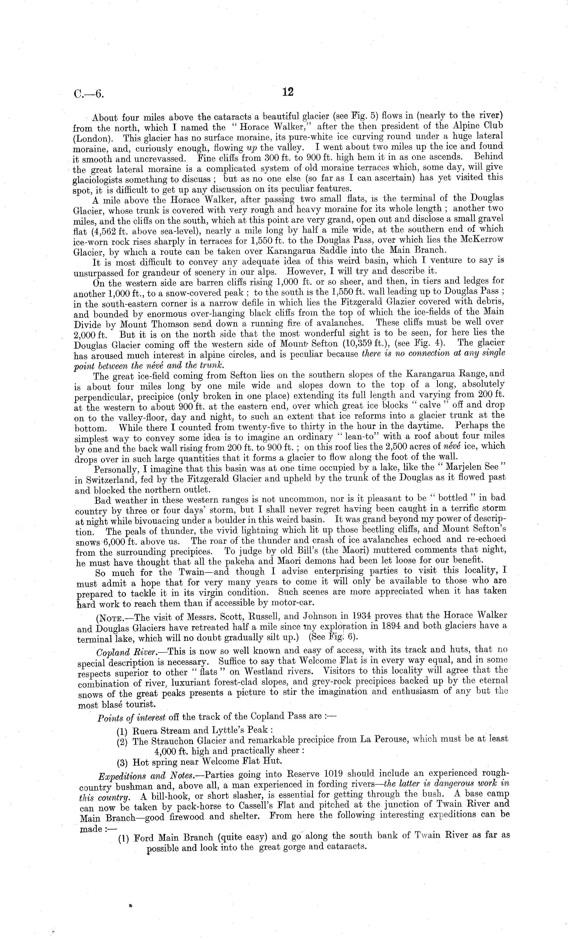 About four miles above the cataracts a beautiful glacier (see Fig. 5) flows in (nearly to the river) from the north, which I named the " Horace Walker," after the then president of the Alpine Club (London). This glacier has no surface moraine, its pure-white ice curving round under a huge lateral moraine, and, curiously enough, flowing up the valley. I went about two miles up the ice and found it smooth and uncrevassed. Fine cliffs from 300 ft. to 900 ft. high hem it in as one ascends. Behind the great lateral moraine is a complicated system of old moraine terraces which, some day, will give glaciologists something to discuss ; but as no one else (so far as I can ascertain) has yet visited this spot, it is difficult to get up any discussion on its peculiar features. A mile above the Horace Walker, after passing two small flats, is the terminal of the Douglas Glacier, whose trunk is covered with very rough and heavy moraine for its whole length ; another two miles, and the cliffs on the south, which at this point are very grand, open out and disclose a small gravel flat (4,562 ft. above sea-level), nearly a mile long by half a mile wide, at the southern end of which ice-worn rock rises sharply in terraces for 1,550 ft. to the Douglas Pass, over which lies the McKerrow Glacier, by which a route can be taken over Karangarua Saddle into the Main Branch. It is most difficult to convey any adequate idea of this weird basin, which I venture to say is unsurpassed for grandeur of scenery in our alps. However, I will try and describe it. On the western side are barren cliffs rising 1,000 ft. or so sheer, and then, in tiers and ledges for another 1,000 ft., to a snow-covered peak ; to the south is the 1,550 ft. wall leading up to Douglas Pass ; in the south-eastern corner is a narrow defile in which lies the Fitzgerald Glazier covered with debris, and bounded by enormous over-hanging black cliffs from the top of which the ice-fields of the Main Divide by Mount Thomson send down a running fire of avalanches. These cliffs must be well over 2,000 ft. But it is on the north side that the most wonderful sight is to be seen, for here lies the Douglas Glacier coming off the western side of Mount- Sefton (10,359 ft.), (see Fig. 4). The glacier has aroused much interest in alpine circles, and is peculiar because there is no connection at any single point between the neve and the trunk. The great ice-field coming from Sefton lies on the southern slopes of the Karangarua Range, and is about four miles long by one mile wide and slopes down to the top of a long, absolutely perpendicular, precipice (only broken in one place) extending its full length and varying from 200 ft. at the western to about 900 ft. at the eastern end, over which great ice blocks " calve " off and drop on to the valley-floor, day and night, to such an extent that ice reforms into a glacier trunk at the bottom. While there I counted from twenty-five to thirty in the hour in the daytime. Perhaps the simplest way to convey some idea is to imagine an ordinary " lean-to" with a roof about four miles by one and the back wall rising from 200 ft. to 900 ft. ; on this roof lies the 2,500 acres of neve ice, which drops over in such large quantities that it forms a glacier to flow along the foot of the wall. Personally, I imagine that this basin was at one time occupied by a lake, like the " Marjelen See " in Switzerland, fed by the Fitzgerald Glacier and upheld by the trunk of the Douglas as it flowed past and blocked the northern outlet. Bad weather in these western ranges is not uncommon, nor is it pleasant to be " bottled " in bad country by three or four days' storm, but I shall never regret having been caught in a terrific storm at night while bivouacing under a boulder in this weird basin. It was grand beyond my power of description. The peals of thunder, the vivid lightning which lit up those beetling cliffs, and Mount Sefton's snows 6,000 ft. above us. The roar of the thunder and crash of ice avalanches echoed and re-echoed from the surrounding precipices. To judge by old Bill's (the Maori) muttered comments that night, he must have thought that all the pakeha and Maori demons had been let loose for our benefit. So much for the Twain—and though I advise enterprising parties to visit this locality, I must admit a hope that for very many years to come it will only be available to those who are prepared to tackle it in its virgin condition. Such scenes are more appreciated when it has taken hard work to reach them than if accessible by motor-car. (Note.— The visit of Messrs. Scott, Russell, and Johnson in 1934 proves that the Horace Walker and Douglas Glaciers have retreated half a mile since my exploration in 1894 and both glaciers have a terminal lake, which will no doubt gradually silt up.) (See Fig. 6). Copland River. —This is now so well known and easy of access, with its track and huts, that no special description is necessary. Suffice to say that Welcome Flat is in every way equal, and in some respects superior to other " flats " on Westland rivers. Visitors to this locality will agree that the combination of river, luxuriant forest-clad slopes, and grey-rock precipices backed up by the eternal snows of the great peaks presents a picture to stir the imagination and enthusiasm of any but the most blase tourist. Points of interest off the track of the Copland Pass are : — (1) Ruera Stream and Lyttle's Peak : (2) The Strauchon Glacier and remarkable precipice from La Perouse, which must be at least 4,000 ft. high and practically sheer : (3) Hot spring near Welcome Flat Hut. Expeditions and Notes.— Parties going into Reserve 1019 should include an experienced roughcountry bushman and, above all, a man experienced in fording rivers— the latter is dangerous work in this country. A bill-hook, or short slasher, is essential for getting through the bush. A base camp can now be taken by pack-horse to Cassell's Flat and pitched at the 