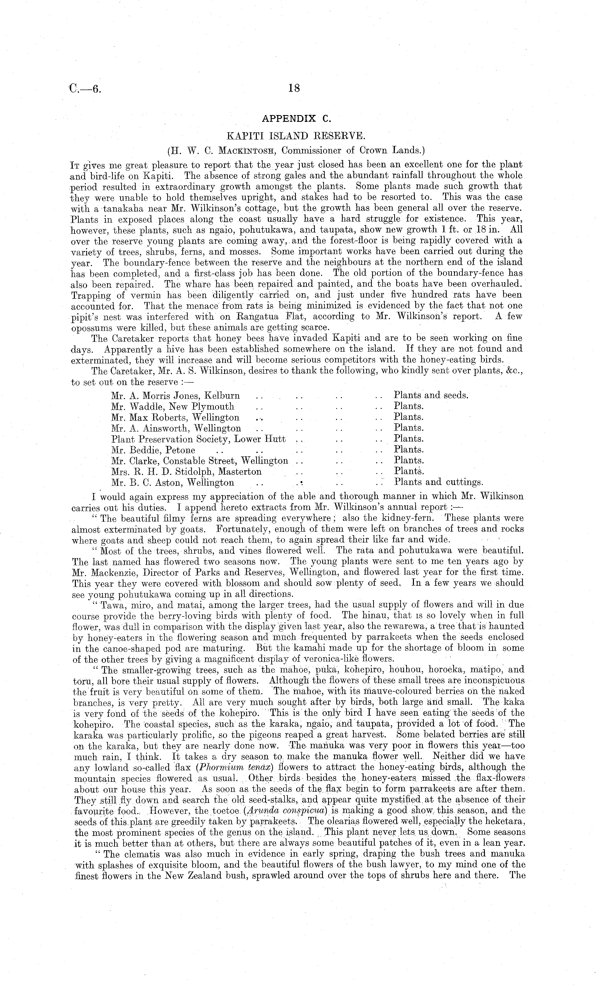 APPENDIX C. KAPITI ISLAND RESERVE. (H. W. C. Mackintosh, Commissioner of Crown Lands.) It gives me great pleasure to report that the year just closed has been an excellent one for the plant and bird-life on Kapiti. The absence of strong gales and the abundant rainfall throughout the whole period resulted in extraordinary growth amongst the plants. Some plants made such growth that they were unable to hold themselves upright, and stakes had to be resorted to. This was the case with a tanakaha near Mr. Wilkinson's cottage, but the growth has been general all over the reserve. Plants in exposed places along the coast usually have a hard struggle for existence. This year, however, these plants, such as ngaio, pohutukawa, and taupata, show new growth 1 ft. or 18 in. All over the reserve young plants are coming away, and the forest-floor is being rapidly covered with a variety of trees, shrubs, ferns, and mosses. Some important works have been carried out during the year. The boundary-fence between the reserve and the neighbours at the northern end of the island has been completed, and a first-class job has been done. The old portion of the boundary-fence has also been repaired. The whare has been repaired and painted, and the boats have been overhauled. Trapping of vermin has been diligently carried on, and just under five hundred rats have been accounted for. That the menace from rats is being minimized is evidenced by the fact that not one pipit's nest was interfered with on Rangatua Flat, according to Mr. Wilkinson's report. A few opossums were killed, but these animals are getting scarce. The Caretaker reports that honey bees have invaded Kapiti and are to be seen working on fine days. Apparently a hive has been established somewhere on the island. If they are not found and exterminated, they will increase and will become serious competitors with the honey-eating birds. The Caretaker, Mr. A. S. Wilkinson, desires to thank the following, who kindly sent over plants, &c, to set out on the reserve :— Mr. A. Morris Jones, Kelburn .. .. .. . . Plants and seeds. Mr. W r addle, New Plymouth . . . . . . . . Plants. Mr. Max Roberts, Wellington .. . . . . . . Plants. Mr. A. Ainsworth, Wellington . . . . .. .. Plants. Plant Preservation Society, Lower Hutt .. .. .. Plants. Mr. Beddie, Petone .. .. . . . . . . Plants. Mr. Clarke, Constable Street, Wellington . . .. . . Plants. Mrs. R. H. D. Stidolph, Masterton . . . . . . Plants. Mr. B. C. Aston, Wellington .. .: . . . . Plants and cuttings. I would again express my appreciation of the able and thorough manner in which Mr. Wilkinson carries out his duties. I append hereto extracts from Mr. Wilkinson's annual report :->- " The beautiful filmy ferns are spreading everywhere; also the kidney-fern. These plants were almost exterminated by goats. Fortunately, enough of them were left on branches of trees and rocks where goats and sheep could not reach them, to again spread their like far and wide. " Most of the trees, shrubs, and vines flowered well. The rata and pohutukawa were beautiful. The last named has flowered two seasons now. The young plants were sent to me ten years ago by Mr. Mackenzie, Director of Parks and Reserves, Wellington, and flowered last year for the first time. This year they were covered with blossom and should sow plenty of seed. In a few years we should see young pohutukawa coming up in all directions. " Tawa, miro, and matai, among the larger trees, had the usual supply of flowers and will in due course provide the berry-loving birds with plenty of food. The hinau, that is so lovely when in full flower, was dull in comparison with the display given last year, also the rewarewa, a tree that is haunted by honey-eaters in the flowering season and much frequented by parrakeets when the seeds enclosed in the canoe-shaped pod are maturing. But the kamahi made up for the shortage of bloom in some of the other trees by giving a magnificent display of veronica-like flowers. " The smaller-growing trees, such as the mahoe, puka, kohepiro, houhou, horoeka, matipo, and torn, all bore their usual supply of flowers. Although the flowers of these small trees are inconspicuous the fruit is very beautiful on some of them. The mahoe, with its tnauve-coloured berries on the naked branches, is very pretty. All are very much sought after by birds, both large and small. The kaka is very fond of the seeds of the kohepiro. This is the only bird I have seen eating the seeds of the kohepiro. The coastal species, such as the karaka, ngaio, and taupata, provided a lot of food. The karaka was particularly prolific, so the pigeons reaped a great harvest. Some belated berries are still on the karaka, but they are nearly done now. The manuka was very poor in flowers this year —too much rain, I think. It takes a dry season to make the manuka flower well. Neither did we have any lowland so-called flax (Phormium tendx) flowers to attract the honey-eating birds, although the mountain species flowered as usual. Other birds besides the honey-eaters missed the flax-flowers about our house this year. As soon as the seeds of the flax begin to form parrakeets are after them. They still fly down and search the old seed-stalks, and appear quite mystified at the absence of their favourite food.. However, the toetoe (Arunda conspicua) is making a good show, this season, and the seeds of this plant are greedily taken by parrakeets. The olearias flowered well, especially the heketara, the most prominent species of the genus on the island. This plant never lets us, down. Some seasons it is much better than at others, but there are always some beautiful patches of it, even in a lean year. " The clematis was also much in evidence in early spring, draping the bush trees and manuka with splashes of exquisite bloom, and the beautiful flowers of the bush lawyer, to my mind one of the finest flowers in the New Zealand bush, sprawled around over the tops of shrubs here and there. Th
