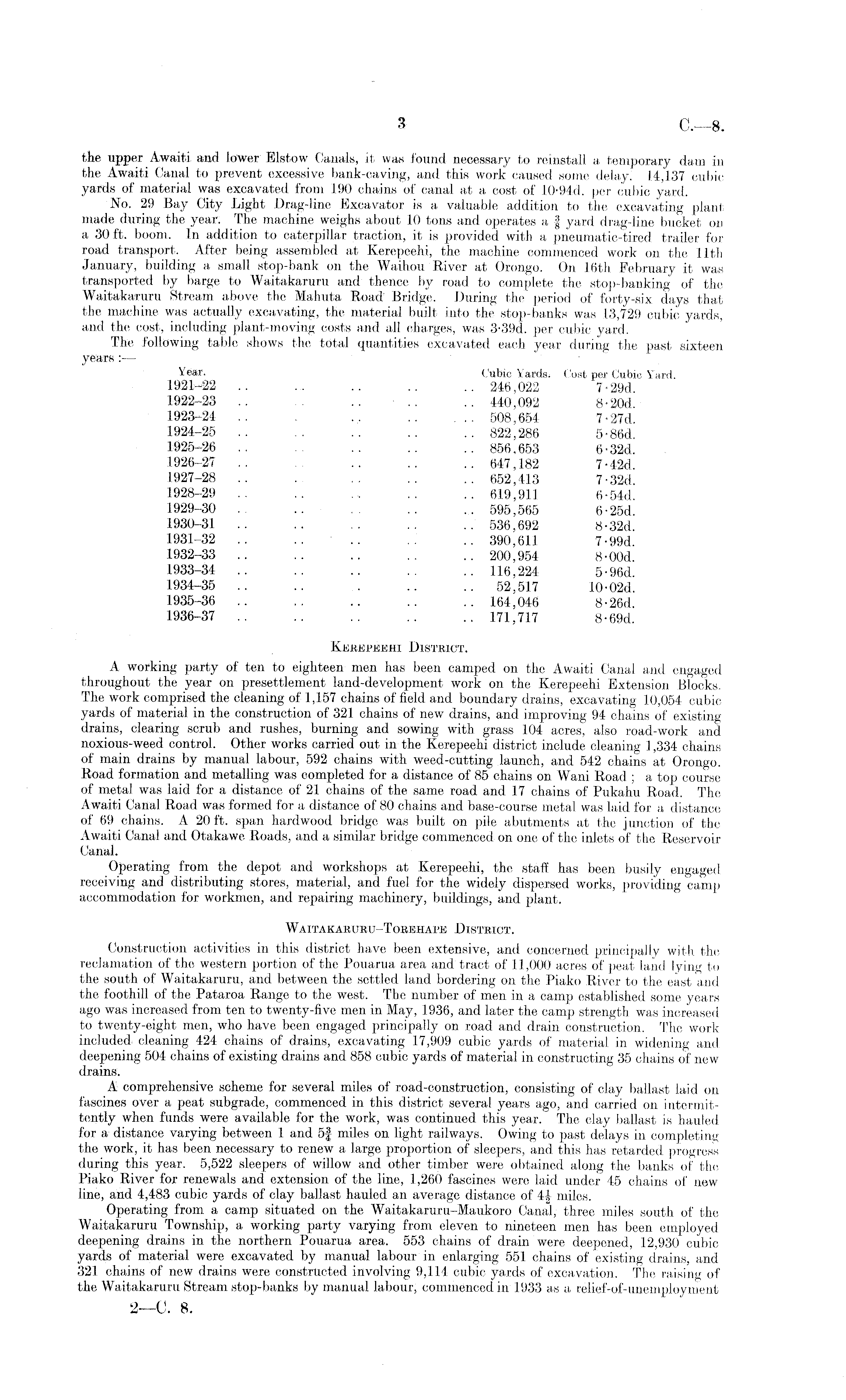 the upper Awaiti and lower Rls tow Canals, it was found necessary to reinstall a temporary dam in the Awaiti Canal to prevent excessive bank-caving, and this work caused some delay. 14,137 cubic yards of material was excavated from 190 chains of canal at a cost of 10-94 d. per cubic yard. No. 29 Bay City Light Drag-line Excavator is a valuable addition to the excavating plant made during the year. The machine weighs about 10 tons and operates a f yard drag-line bucket on a3O ft. boom. In addition to caterpillar traction, it is provided with a pneumatic-tired trailer for road transport. After being assembled at Kerepeehi, the machine commenced work on the 11th January, building a small stop-bank on the Waihou River at Orongo. On 16th February it was transported by barge to Waitakaruru and thence by road to complete the stop-banking of the Waitakaruru Stream above the Mahtita Road Bridge. During the period of forty-six days that the machine was actually excavating, the material built into the stop-banks was 13,729 cubic yards, and the cost, including plant-moving costs and all charges, was 3'39d. per cubic yard. The following table shows the total quantities excavated each year during the past sixteen years ¥ê&r. Cubic Yards. Cost per Cubic Yard. 1921-22 .. ... .. .. ..246,022 7-29 d. 1922-23 .. .. .. .. 440,092 8-20 d. 1923-24 .. .. 508,654 7-274 1924-25 .. .. .. .. .. 822,286 5-86 d. 1925-26 .. .. .. .. 856,653 6-32 d. 1926-27 .. .. .. .. 647,182 7-4-2 d. 1927-28 .. . .. .. .. 652,413 7-32 d. 1928-29 .. .. ~ .. .. 619,911 6-54 d. 1929-30 .. .. .. ... 595,565 6-25 d. 1930-31 .. .. .. .. .. 536,692 8-32 d. 1931-32 .. .. .. .. 390,611 7-99 d. 1932-33 .. .. .. .. .. 200,954 8-00 d. 1933-34 .. .. .. .. .. 116,224 5-96 d. 1934-35 .. .. . .. .. 52,517 10-02 d. 1935-36 .. .. .. .. .. 164,046 8-26 d. 1936-37 .. .. .. .. .. 171,717 8-69 d. Kerepeehi District. A working party of ten to eighteen men has been camped on the Awaiti Canal and engaged throughout the year on presettlement land-development work on the Kerepeehi Extension Blocks. The work comprised the cleaning of 1,157 chains of field and boundary drains, excavating 10,054 cubic yards of material in the construction of 321 chains of new drains, and improving 94 chains of existing drains, clearing scrub and rushes, burning and sowing with grass 104 acres, also road-work and" noxious-weed control. Other works carried out in the Kerepeehi district include cleaning 1,334 chains of main drains by manual labour, 592 chains with weed-cutting launch, and 542 chains at Orongo. Road formation and metalling was completed for a distance of 85 chains on Wani Road ; a top course of metal was laid for a distance of 21 chains of the same road and 17 chains of Pukahu Road. The Awaiti Canal Road was formed for a distance of 80 chains and base-course metal was laid for a distance of 69 chains. A 20ft. span hardwood bridge was built on pile abutments at the junction of the Awaiti Canal and Otakawe Roads, and a similar bridge commenced on one of the inlets of the Reservoir Canal. Operating from the depot and workshops at Kerepeehi, the staff has been busily engaged, receiving and distributing stores, material, and fuel for the widely dispersed works, providing camj) accommodation for workmen, and repairing machinery, buildings, and plant. Waitakaruru-Torehape District. Construction activities in this district have been extensive, and concerned principally with the reclamation of the western portion of the Pouarua area and tract of 11,000 acres of peat land lying to the south of Waitakaruru, and between the settled land bordering on the Piako River to the east and the foothill of the Pataroa Range to the west. The number of men in a camp established some years ago was increased from ten to twenty-five men in May, 1936, and later the camp strength was increased to twenty-eight men, who have been engaged principally on road and drain construction. The work included* cleaning 424 chains of drains, excavating 17,909 cubic yards of material in widening and deepening 504 chains of existing drains and 858 cubic yards of material in constructing 35 chains of new drains. A comprehensive scheme for several miles of road-construction, consisting of clay ballast laid on fascines over a peat subgrade, commenced in this district several years ago, and carried on intermittently when funds were available for the work, was continued this year. The clay ballast is hauled for a distance varying between 1 and 5f miles on light railways. Owing to past delays in completing the work, it has been necessary to renew a large proportion of sleepers, and this has retarded progress during this year. 5,522 sleepers of willow and other timber were obtained along the banks of the Piako River for renewals and extension of the line, 1,260 fascines were laid under 45 chains of new line, and 4,483 cubic yards of clay ballast hauled an average distance of 1-1 miles. Operating from a camp situated on the Waitakaruru-Maukoro Canal, three miles south of the Waitakaruru Township, a working party varying from eleven to nineteen men has been employed deepening drains in the northern Pouarua area. 553 chains of drain were deepened, 12,930 cubic yards of material were excavated by manual labour in enlarging 551 chains of existing drains, and 321 chains of new drains were constructed involving 9,114 cubic yards of excavation. The raising of the Waitakaruru Stream stop-banks by manual labour, commenced in 1933 as a relic,f-of-unernployment 2—C. 8.