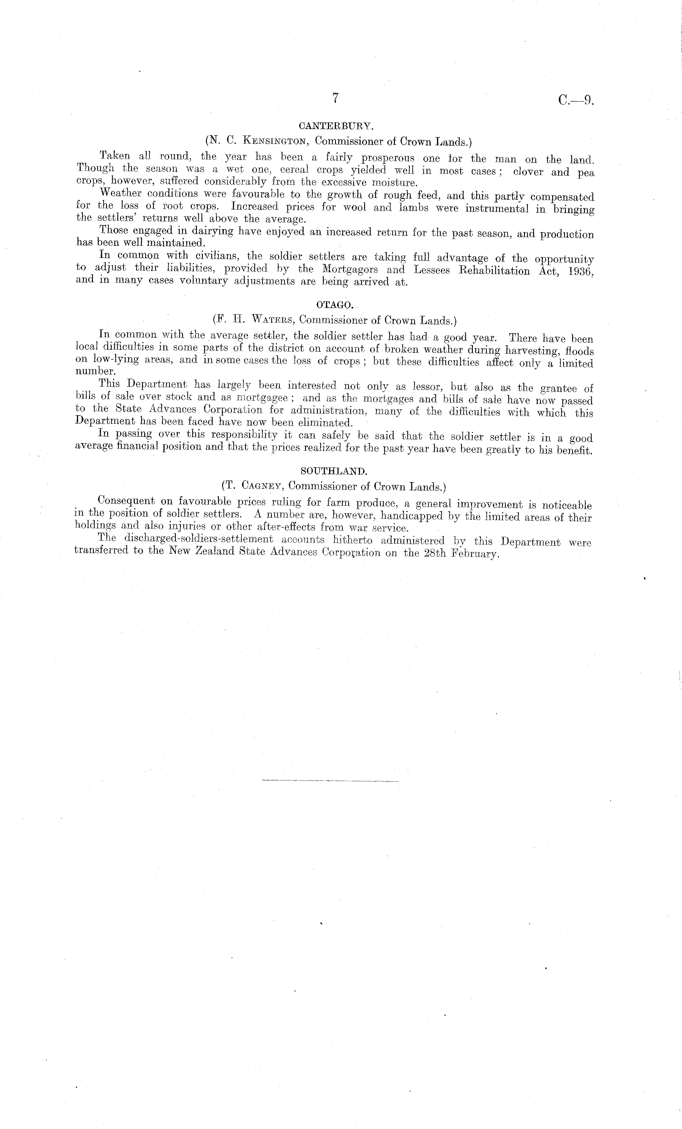 CANTERBURY. (N. C. Kensington, Commissioner of Crown Lands.) Taken all round, the year has been a fairly prosperous one for the man on the land. Though the season was a wet one, cereal crops yielded well in most cases; clover and pea crops, however, suffered considerably from the excessive moisture. Weather conditions were favourable to the growth of rough feed, and this partly compensated for the loss of root crops. Increased prices for wool and lambs were instrumental in bringing the settlers' returns well above the average. Those engaged in dairying have enjoyed an increased return for the past season, and production has been well maintained. In common with civilians, the soldier settlers are taking full advantage of the opportunity to adjust their liabilities, provided by the Mortgagors and Lessees Rehabilitation Act, 1936, and in many cases voluntary adjustments are being arrived at. OTAGO. (F. 11. Waters, Commissioner of Crown Lands.) In common with the average settler, the soldier settler has had a good year. There have been local difficulties in some parts of the district on account of broken weather during harvesting, floods on low-lying areas, and in some cases the loss of crops ; but these difficulties affect only a limited number. This Department has largely been interested not only as lessor, but also as the grantee of bills of sale over stock and as mortgagee; and as the mortgages and bills of sale have now passed to the State Advances Corporation for administration, many of the difficulties with which this Department has been faced have now been eliminated. In passing over this responsibility it can safely be said that the soldier settler is in a good average financial position and that the prices realized for the past year have been greatly to his benefit. SOUTHLAND. (T. Cagnby, Commissioner of Crown Lands.) Consequent on favourable prices ruling for farm produce, a general improvement is noticeable in the position of soldier settlers. A number are, however, handicapped by the limited areas of their holdings and also injuries or other after-effects from war service. The discharged-soldiers-settlement accounts hitherto administered by this Department were transferred to the New Zealand State Advances Corporation on the 28th February.
