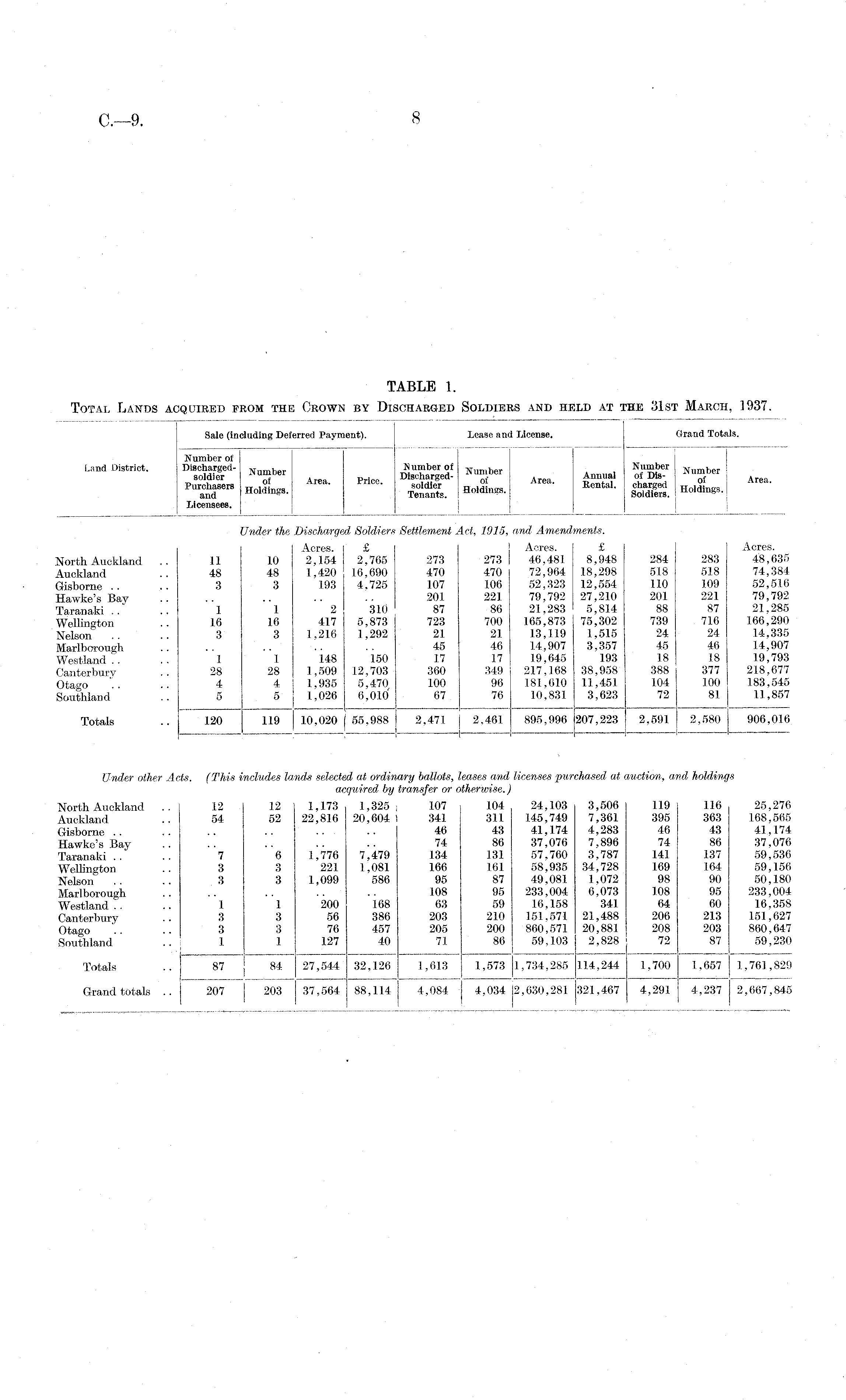 TABLE 1. Total Lands acquired from the Crown by Discharged Soldiers and held at the 31st March, 1937.