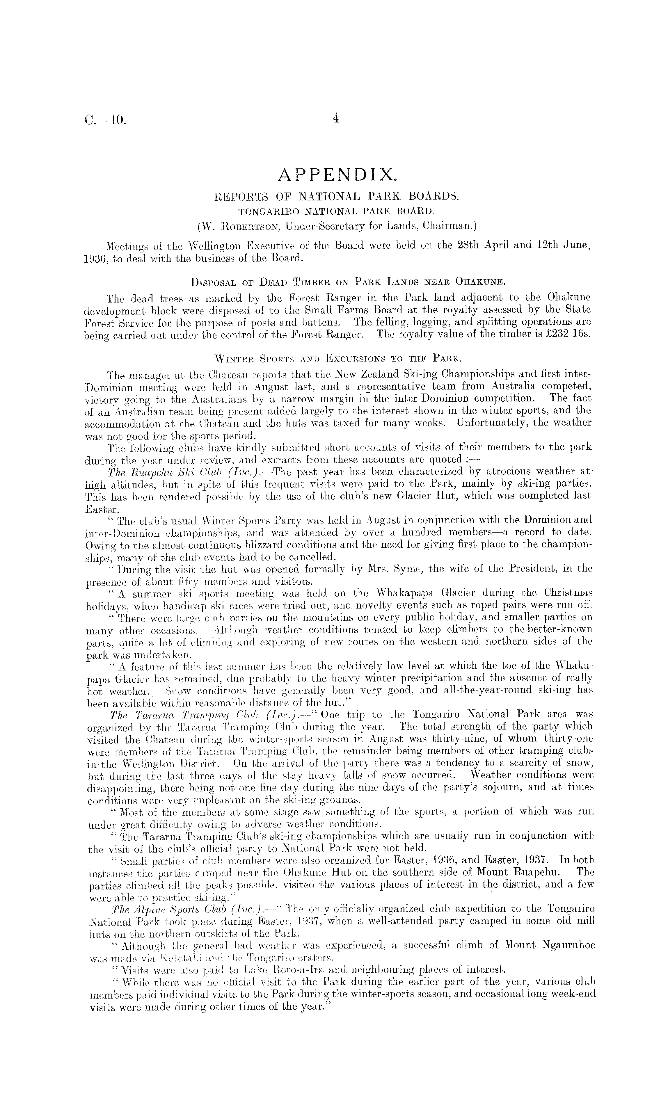 APPENDIX. REPORTS OF NATIONAL PARK BOARDS. TONGARIRO NATIONAL PARK BOARD. (W. Robertson, Under-Secretary for Lands, Chairman.) Meetings of the Wellington Executive of the Board were held on the 28th April and 12th June, 1936, to deal with the business of the Board. Disposal op Dead Timber on Park Lands near Ohakune. The dead trees as marked by the Forest Ranger in the Park land adjacent to the Ohakune development block were disposed of to the Small Farms Board at the royalty assessed by the State Forest Service for the purpose of posts and battens. The felling, logging, and splitting operations are being carried out under the control of the Forest Ranger. The royalty value of the timber is £232 16s. Winter Sports and Excursions to the Park. The manager at the Chateau reports that the New Zealand Ski-ing Championships and first interDominion meeting were held in August last, and a representative team from Australia competed, victory going to the Australians by a narrow margin in the inter-Dominion competition. The fact of an Australian team being present added largely to the interest shown in the winter sports, and the accommodation at the Chateau and the huts was taxed for many weeks. Unfortunately, the weather was not good for the sports period. The following clubs have kindly submitted short accounts of visits of their members to the park during the year under review, and extracts from these accounts are quoted : — The Ruapehu Ski Club (Inc.). —The past year has been characterized by atrocious weather athigh altitudes, but in spite of this frequent visits were paid to the Park, mainly by ski-ing parties. This has been rendered possible by the use of the club's new Glacier Hut, which was completed last Easter. " The club's usual Winter Sports Party was held in August in conjunction with the Dominion and inter-Dominion championships, and was attended by over a hundred members —a record to date. Owing to the almost continuous blizzard conditions and the need for giving first place to the championships, many of the club events had to be cancelled. " During the visit the hut was opened formally by Mrs. Syme, the wife of the President, in the presence of about fifty members and visitors. " A summer ski sports meeting was held on the Whakapapa Glacier during the Christmas holidays, when handicap ski races were tried out, and novelty events such as roped pairs were run off. " There were large club parties on the mountains on every public holiday, and smaller parties on many other occasions. Although weather conditions tended to keep climbers to the better-known parts, quite a lot of climbing and exploring of new routes on the western and northern sides of the park was undertaken. " A feature of this last summer has been the relatively low level at which the toe of the Whakapapa Glacier has remained, due probably to the heavy winter precipitation and the absence of really hot weather. Snow conditions have generally been very good, and all-the-year-round ski-ing has been available within reasonable distance of the hut." The Tararua Tramping Club (Inc.). —"One trip to the Tongariro National Park area was organized by the Tararua Tramping Club during the year. The total strength of the party which visited the Chateau during the winter-sports season in August was thirty-nine, of whom thirty-one were members of the Tararua Tramping Club, the remainder being members of other tramping clubs in the Wellington District. On the arrival of the party there was a tendency to a scarcity of snow, but during the last three days of the stay heavy falls of snow occurred. Weather conditions were disappointing, there being not one fine day during the nine days of the party's sojourn, and at times conditions were very unpleasant on the ski-ing grounds. " Most of the members at some stage saw something of the sports, a portion of which was run under great difficulty owing to adverse weather conditions. " The Tararua Tramping Club's ski-ing championships which are usually run in conjunction with the visit of the club's official party to National Park were not held. " Small parties of club members were also organized for Easter, 1936, and Easter, 1937. In both instances the parties camped near the Ohakune Hut on the southern side of Mount Ruapehu. The parties climbed all the peaks possible, visited the various places of interest in the district, and a few were able to practice ski-ing." The Alpine Sports Club (Inc.). —" The only officially organized club expedition to the Tongariro National Park took place during Easter, 1937, when a well-attended party camped in some old mill huts on the northern outskirts of the Park. " Although the general bad weather was experienced, a successful climb of Mount Ngauruhoe was made via Ketetahi and the Tongariro craters. " Visits were also paid to Lake Roto-a-Ira and neighbouring places of interest. " While there was no official visit to the Park during the earlier part of the year, various club members paid individual visits to the Park during the winter-sports season, and occasional long week-end visits were made during other times of the year."