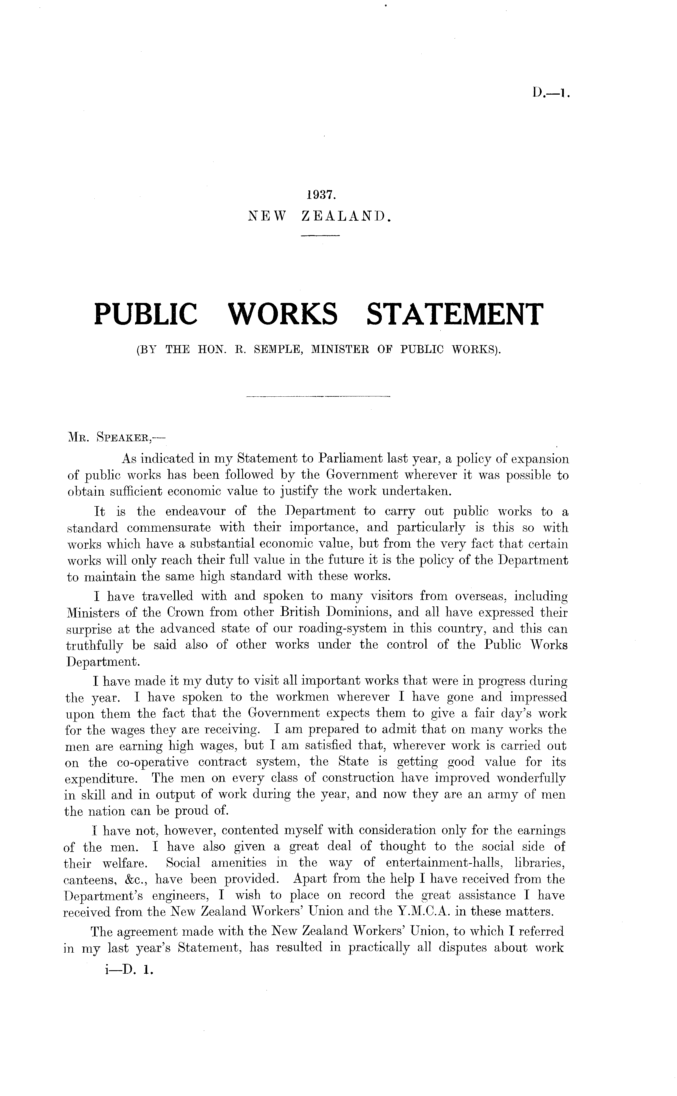 Mr. Speaker,— As indicated in my Statement to Parliament last year, a policy of expansion of public works lias been followed by the Government wherever it was possible to obtain sufficient economic value to justify the work undertaken. It is the endeavour of the Department to carry out public works to a standard commensurate with their importance, and particularly is this so with works which have a substantial economic value, but from the very fact that certain works will only reach their full value in the future it is the policy of the Department to maintain the same high standard with these works. I have travelled with and spoken to many visitors from overseas, including Ministers of the Crown from other British Dominions, and all have expressed their surprise at the advanced state of our roading-system in this country, and this can truthfully be said also of other works under the control of the Public Works Department. I have made it my duty to visit all important works that were in progress during the year. I have spoken to the workmen wherever I have gone and impressed upon them the fact that the Government expects them to give a fair day's work for the wages they are receiving. lam prepared to admit that on many works the men are earning high wages, but I am satisfied that, wherever work is carried out on the co-operative contract system, the State is getting good value for its expenditure. The men on every class of construction have improved wonderfully in skill and in output of work during the year, and now they are an army of men the nation can be proud of. I have not, however, contented myself with consideration only for the earnings of the men. I have also given a great deal of thought to the social side of their welfare. Social amenities in the way of entertainment-halls, libraries, canteens, &c., have been provided. Apart from the help I have received from the Department's engineers, I wish to place on record the great assistance I have received from the New Zealand Workers' Union and the Y.M.C.A. in these matters. The agreement made with the New Zealand Workers' Union, to which I referred in my last year's Statement, has resulted in practically all disputes about work