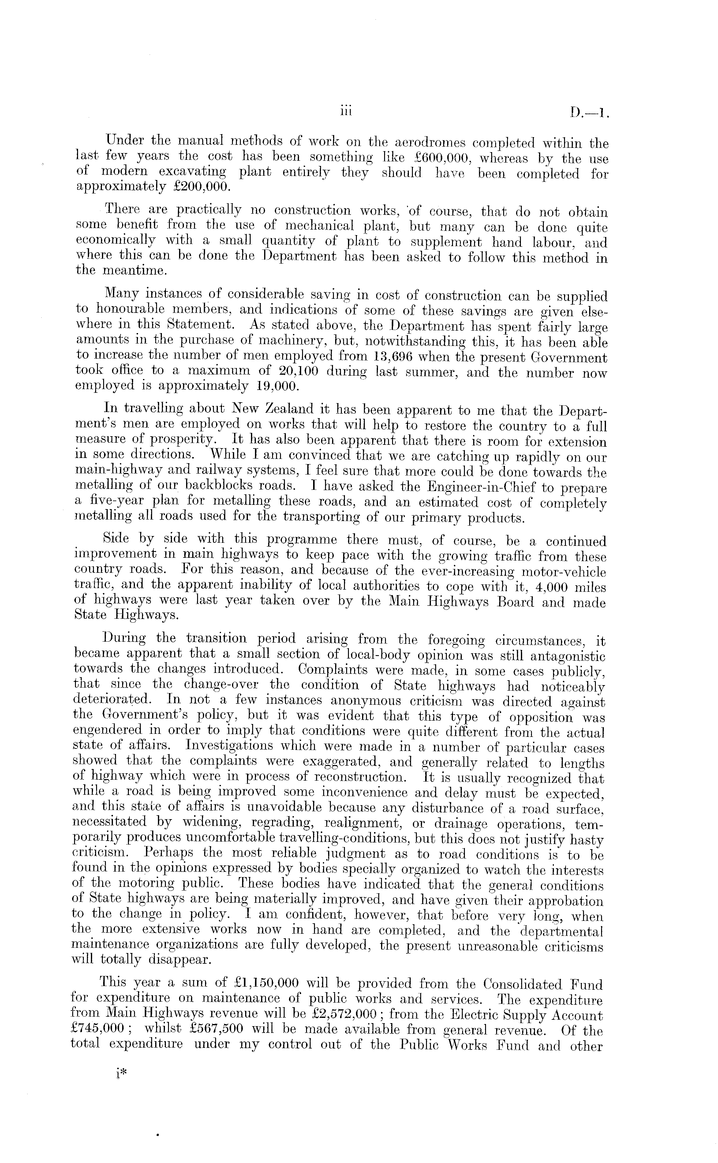 Under the manual methods of work on the aerodromes completed within the last few years the cost has been something like £600,000, whereas by the use of modern excavating plant entirely they should have been completed for approximately £200,000. There are practically no construction works, 'of course, that do not obtain some benefit from the use of mechanical plant, but many can be done quite economically with a small quantity of plant to supplement hand labour, and where this can be done the Department has been asked to follow this method in the meantime. Many instances of considerable saving in cost of construction can be supplied to honourable members, and indications of some of these savings are given elsewhere in this Statement. As stated above, the Department has spent fairly large amounts in the purchase of machinery, but, notwithstanding this, it has been able to increase the number of men employed from 13,696 when the present Government took office to a maximum of 20,10*0 during last summer, and the number now employed is approximately 19,000. In travelling about New Zealand it has been apparent to me that the Department's men are employed on works that will help to restore the country to a full measure of prosperity. It has also been apparent that there is room for extension in some directions. While lam convinced that we are catching up rapidly on our main-highway and railway systems, I feel sure that more could be done towards the metalling of our backblocks roads. I have asked the Engineer-in-Chief to prepare a five-year plan for metalling these roads, and an estimated cost of completely metalling all roads used for the transporting of our primary products. Side by side with this programme there must, of course, be a continued improvement in main highways to keep pace with the growing traffic from these country roads, lor this reason, and because of the ever-increasing motor-vehicle traffic, and the apparent inability of local authorities to cope with it, 4,000 miles of highways were last year taken over by the Main Highways Board and made State Highways. During the transition period arising from the foregoing circumstances, it became apparent that a small section of local-body opinion was still antagonistic towards the changes introduced. Complaints were made, in some cases publicly, that since the change-over the condition of State highways had noticeably deteriorated. In not a few instances anonymous criticism was directed against the Government's policy, but it was evident that this type of opposition was engendered in order to imply that conditions were quite different from the actual state of affairs. Investigations which were made in a number of particular cases showed that the complaints were exaggerated, and generally related to lengths of highway which were in process of reconstruction. It is usually recognized that while a road is being improved some inconvenience and delay must be expected, and this state of affairs is unavoidable because any disturbance of a road surface, necessitated by widening, regrading, realignment, or drainage operations, temporarily produces uncomfortable travelling-conditions, but this does not justify hasty criticism. Perhaps the most reliable judgment as to road conditions is to be found in the opinions expressed by bodies specially organized to watch the interests of the motoring public. These bodies have indicated that the general conditions of State highways are being materially improved, and have given their approbation to the change in policy. I am confident, however, that before very long, when the more extensive works now in hand are completed, and the departmental maintenance organizations are fully developed, the present unreasonable criticisms will totally disappear. This year a sum of £1,150,000 will be provided from the Consolidated Fund for expenditure on maintenance of public works and services. The expenditure from Main Highways revenue will be £2,572,000; from the Electric Supply Account £745,000 ; whilst £567,500 will be made available from general revenue. Of the total expenditure under my control out of the Public Works Fund and other