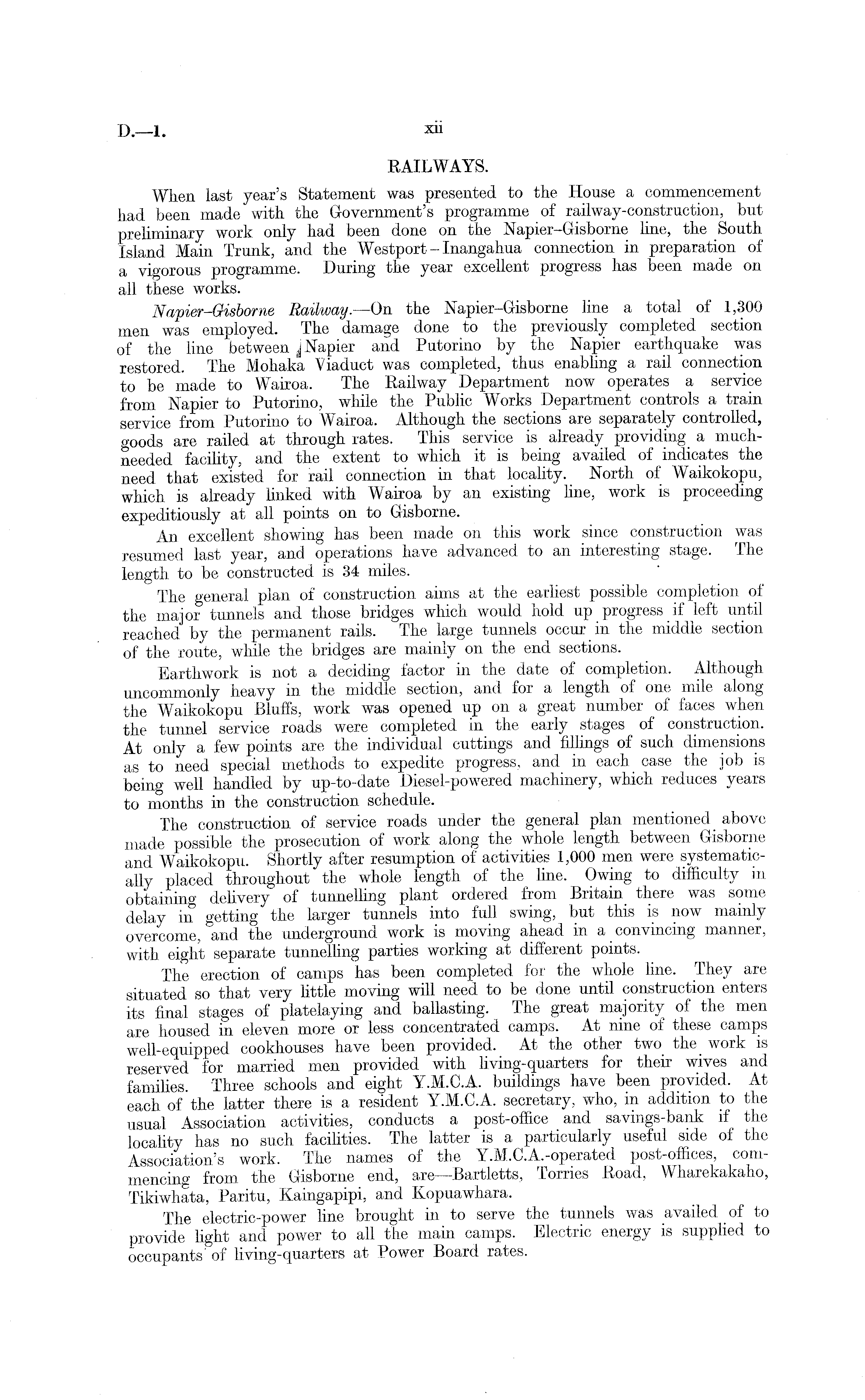 RAILWAYS. When last year's Statement was presented to the House a commencement had been made with the Government's programme of railway-construction, but preliminary work only had been done on the Napier-Gisborne line, the South Island Main Trunk, and the Westport - Inangahua connection in preparation of a vigorous programme. During the year excellent progress has been made on all these works. Napier-Gisborne Railway .—On the Napier-G-isborne line a total of 1,300 men was employed. The damage done to the previously completed section of the line between J Napier and Putorino by the Napier earthquake was restored. The Mohaka Viaduct was completed, thus enabling a rail connection to be made to Wairoa. The Railway Department now operates a service from Napier to Putorino, while the Public Works Department controls a train service from Putorino to Wairoa. Although the sections are separately controlled, goods are railed at through rates. This service is already providing a muchneeded facility, and the extent to which it is being availed of indicates the need that existed for rail connection in that locality. North of Waikokopu, which is already linked with Wairoa by an existing line, work is proceeding expeditiously at all points on to Gisborne. An excellent showing has been made on this work since construction was resumed last year, and operations have advanced to an interesting stage. The length to be constructed is 34 miles. The general plan of construction aims at the earliest possible completion of the major tunnels and those bridges which would hold up progress if left until reached by the permanent rails. The large tunnels occur in the middle section of the route, while the bridges are mainly on the end sections. Earthwork is not a deciding factor in the date of completion. Although uncommonly heavy in the middle section, and for a length of one mile along the Waikokopu Bluffs, work was opened up on a great number of faces when the tunnel service roads were completed in the early stages of construction. At only a few points are the individual cuttings and fillings of such dimensions as to need special methods to expedite progress, and in each case the job is being well handled by up-to-date Diesel-powered machinery, which reduces years to months in the construction schedule. The construction of service roads under the general plan mentioned above made possible the prosecution of work along the whole length between Gisborne and Waikokopu. Shortly after resumption of activities 1,000 men were systematically placed throughout the whole length of the line. Owing to difficulty in obtaining delivery of tunnelling plant ordered from Britain there was some delay in getting the larger tunnels into full swing, but this is now mainly overcome, and the underground work is moving ahead in a convincing manner, with eight separate tunnelling parties working at different points. The erection of camps has been completed for the whole line. They are situated so that very little moving will need to be done until construction enters its final stages of platelaying and ballasting. The great majority of the men are housed in eleven more or less concentrated camps. At nine of these camps well-equipped cookhouses have been provided. At the other two the work is reserved for married men provided with living-quarters for their wives and families. Three schools and eight Y.M.C.A. buildings have been provided. At each of the latter there is a resident Y.M.C.A. secretary, who, in addition to the usual Association activities, conducts a post-office and savings-bank if the locality has no such facilities. The latter is a particularly useful side of the Association's work. The names of the Y.M.C.A.-operated post-offices, commencing from the Gisborne end, are—Bartletts, Torries Road, Wharekakaho, Tikiwhata, Paritu, Kaingapipi, and Kopuawhara. The electric-power line brought in to serve the tunnels was availed of to provide light and power to all the main camps. Electric energy is supplied to occupants of living-quarters at Power Board rates.
