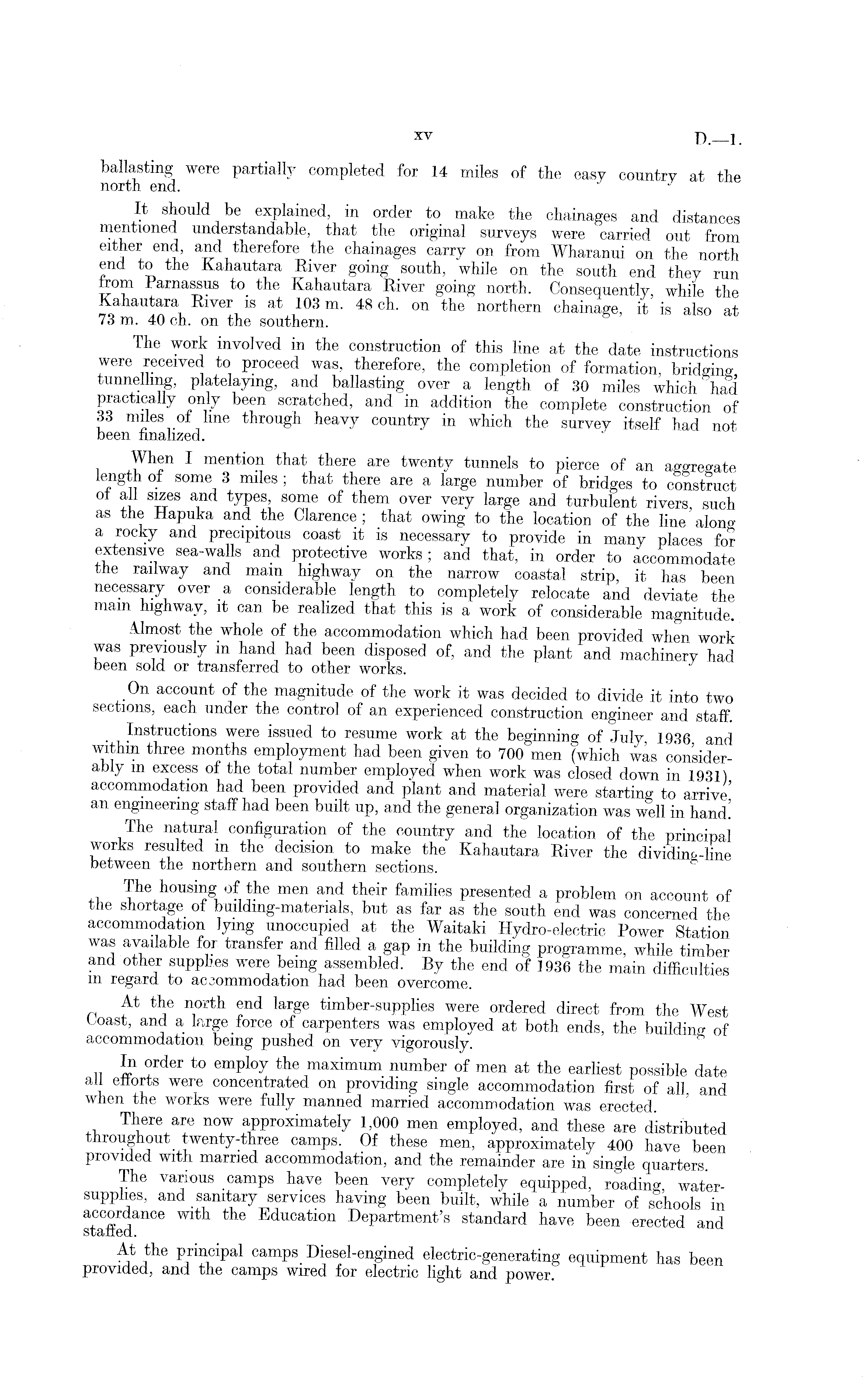 ballasting were partially completed for 14 miles of the easy country at the north end. It should be explained, in order to make the chainages and distances mentioned understandable, that the original surveys were carried out from either end, and therefore the chainages carry on. from Wharanui on the north end to the Kahautara River going south, while on the south end they run from Parnassus to the Kahautara River going north. Consequently, while the Kahautara River is at 108 m. 48 ch. on the northern chainage, it is also at 73 m. 40 ch. on the southern. The work involved in the construction of this line at the date instructions were received to proceed was, therefore, the completion of formation, bridging tunnelling, platelaymg, and ballasting over a length of 30 miles which had practically only been scratched, and in addition the complete construction of 33 miles of line through heavy country in which the survey itself had not been finalized. i ' mentl '°. n there are twenty tunnels to pierce of an aggregate length of some 3 miles ; that there are a large number of bridges to construct li S 'r, e,S i some of them over very large and turbulent rivers, such as the Hapuka and the Clarence ; that owing to the location of the line' alone a rocky and precipitous coast it is necessary to provide in many places for extensive sea-walls and protective works; and that, in order to accommodate the railway and main highway on the narrow coastal strip, it has been necessary over a considerable length to completely relocate and deviate the mam highway, it can be realized that this is a work of considerable magnitude. Almost the whole of the accommodation which had been provided when work was previously in hand had been disposed of, and the plant and machinery had been sold or transferred to other works. On account of the magnitude of the work it was decided to divide it into two sections, each under the control of an experienced construction engineer and staff. Instructions were issued to resume work at the beginning of July 1936 and withm three months employment had been given to 700 men (which was considerably m excess of the total number employed when work was closed down in 1931) accommodation had been provided and plant and material were starting to arrive an engineering staff had been built up, and the general organization was well in hand.' The natural configuration of the country and the location of the principal works resulted m the decision to make the Kahautara River the dividing-line between the northern and southern sections. The housing of the men and their families presented a problem on account of the shortage of buildmg-materials, but as far as the south end was concerned the accommodation lying unoccupied at the Waitaki Hydro-electric Power Station was available for transfer and filled a gap in the building programme, while timber and other supplies were being assembled. By the end of 1936 the main difficulties m regard to accommodation had been overcome. At the north end large timber-supplies were ordered direct from the West Coast, and a large force of carpenters was employed at both ends, the building of accommodation being pushed on very vigorously. lii order to employ the maximum number of men at the earliest possible date all efforts were concentrated on providing single accommodation first of all. and when the works were fully manned married accommodation was erected. There are now approximately 1,000 men employed, and these are distributed twenty-three camps. Of these men, approximately 400 have been provided with married accommodation, and the remainder are in single quarters. The various camps have been very completely equipped, roading, watersupplies, and sanitary services having been built, while a number of schools in accordance with the Education Department's standard have been erected and started. At the principal camps Diesel-engined electric-generating equipment has been provided, and the camps wired for electric light and power.
