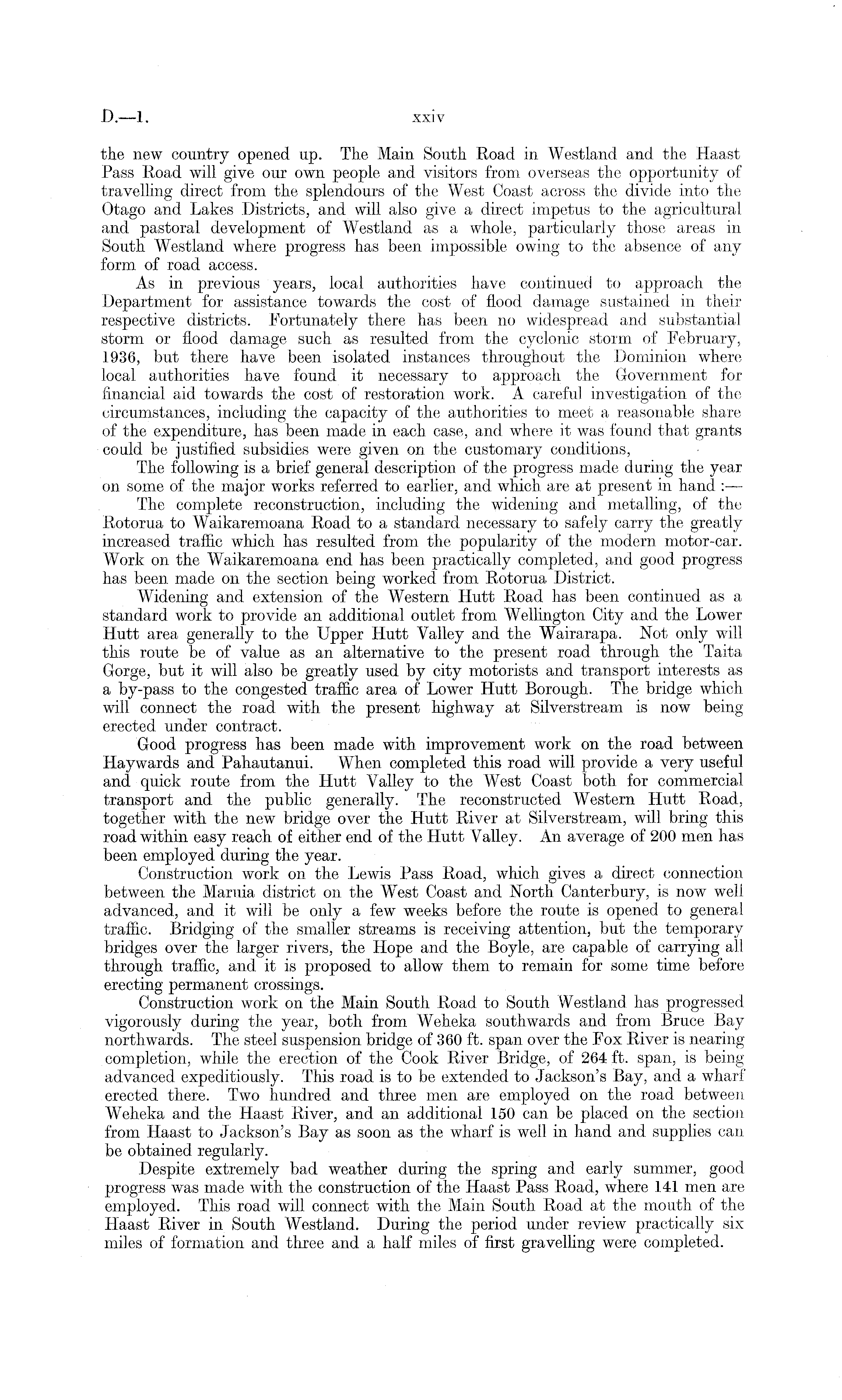 the new country opened up. The Main South Road in Westland and the Haast Pass Road will give our own people and visitors from overseas the opportunity of travelling direct from the splendours of the West Coast across the divide into the Otago and Lakes Districts, and will also give a direct impetus to the agricultural and pastoral development of Westland as a whole, particularly those areas in South Westland where progress has been impossible owing to the absence of any form of road access. As in previous years, local authorities have continued to approach the Department for assistance towards the cost of flood damage sustained in their respective districts. Fortunately there has been no widespread and substantial storm or flood damage such as resulted from the cyclonic storm of February, 1936, but there have been isolated instances throughout the Dominion where local authorities have found it necessary to approach the Government for financial aid towards the cost of restoration work. A careful investigation of the circumstances, including the capacity of the authorities to meet a reasonable share of the expenditure, has been made in each case, and where it was found that grants could be justified subsidies were given on the customary conditions, The following is a brief general description of the progress made during the year on some of the major works referred to earlier, and which are at present in hand The complete reconstruction, including the widening and metalling, of the Rotorua to Waikaremoana Road to a standard necessary to safely carry the greatly increased traffic which has resulted from the popularity of the modern motor-car. Work on the Waikaremoana end has been practically completed, and good progress has been made on the section being worked from Rotorua District. Widening and extension of the Western Hutt Road has been continued as a standard work to provide an additional outlet from Wellington City and the Lower Hutt area generally to the Upper Hutt Valley and the Wairarapa. Not only will this route be of value as an alternative to the present road through the Taita Gorge, but it will also be greatly used by city motorists and transport interests as a by-pass to the congested traffic area of Lower Hutt Borough. The bridge which will connect the road with the present highway at Silverstream is now being erected under contract. Good progress has been made with improvement work on the road between Hay wards and Pahautanui. When completed this road will provide a very useful and quick route from the Hutt Valley to the West Coast both for commercial transport and the public generally. The reconstructed Western Hutt Road, together with the new bridge over the Hutt River at Silverstream, will bring this road within easy reach of either end of the Hutt Valley. An average of 200 men has been employed during the year. Construction work on the Lewis Pass Road, which gives a direct connection between the Maruia district on the West Coast and North Canterbury, is now well advanced, and it will be only a few weeks before the route is opened to general traffic. Bridging of the smaller streams is receiving attention, but the temporary bridges over the larger rivers, the Hope and the Boyle, are capable of carrying all through traffic, and it is proposed to allow them to remain for some time before erecting permanent crossings. Construction work on the Main South Road to South Westland has progressed vigorously during the year, both from Weheka southwards and from Bruce Bay northwards. The steel suspension bridge of 360 ft. span over the Fox River is nearing completion, while the erection of the Cook River Bridge, of 264 ft. span, is being advanced expeditiously. This road is to be extended to Jackson's Bay, and a wharf erected there. Two hundred and three men are employed on the road between Weheka and the Haast River, and an additional 150 can be placed on the section from Haast to Jackson's Bay as soon as the wharf is well in hand and supplies can be obtained regularly. Despite extremely bad weather during the spring and early summer, good progress was made with the construction of the Haast Pass Road, where 141 men are employed. This road will connect with the Main South Road at the mouth of the Haast River in South Westland. During the period under review practically six miles of formation and three and a half miles of first gravelling were completed.