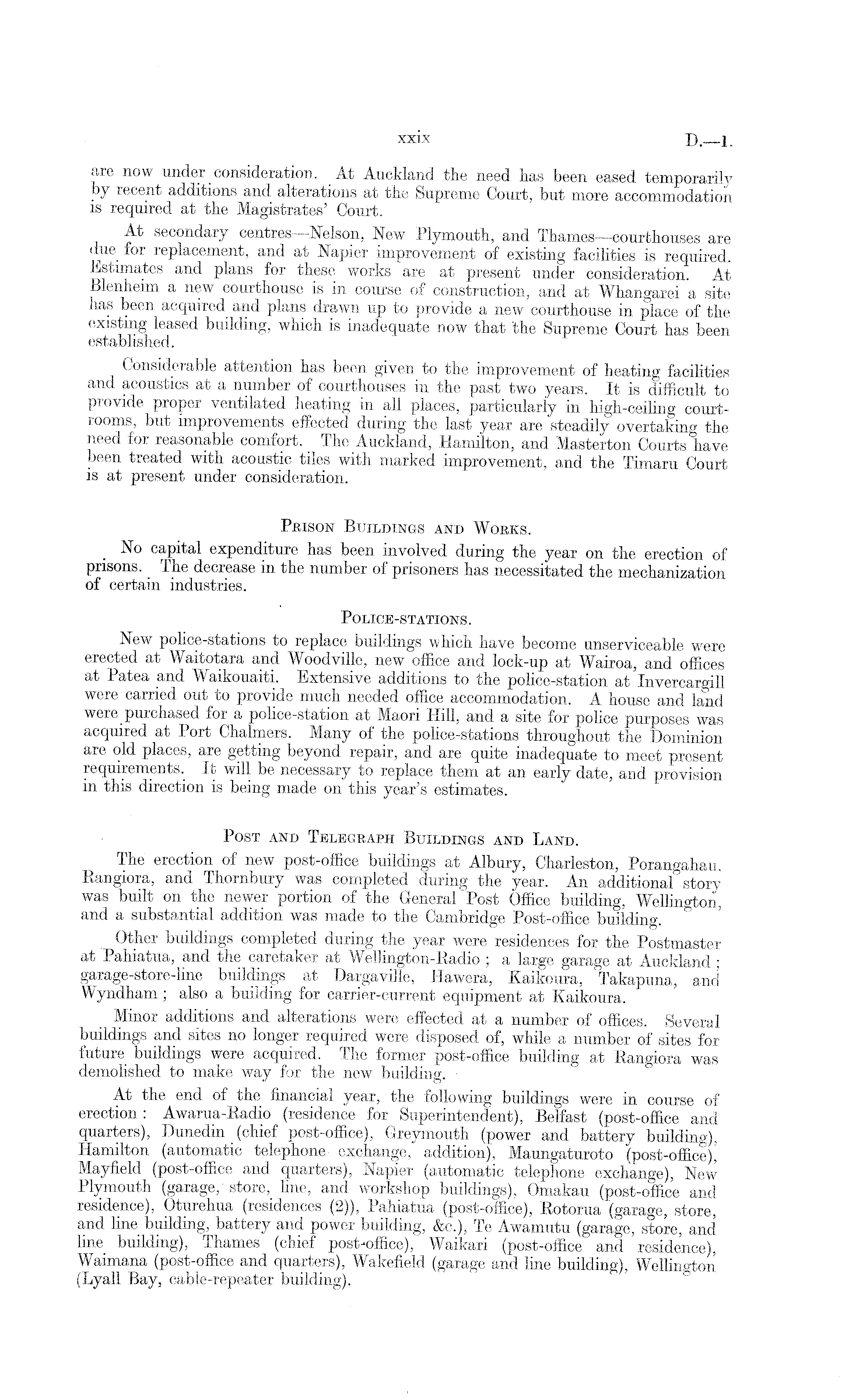 are now under consideration. At Auckland the need lias been eased temporarily by recent additions and alterations at the Supreme Court, but more accommodation is required at the Magistrates' Court. At secondary centres—Nelson, New Plymouth, and Thames—courthouses are due for replacement, and at Napier improvement of existing facilities is required. Estimates and plans for these works are at present under consideration. At Blenheim a new courthouse is in course of construction, and at Whangarei a site has been acquired and plans drawn up to provide a new courthouse in place of the existing leased building, which is inadequate now that the Supreme Court has been established. Considerable attention has been given to the improvement of heating facilities and acoustics at a number of courthouses in the past two years. It is difficult to provide proper ventilated heating in all places, particularly in high-ceiling courtrooms, but improvements effected during the last year are steadily overtaking the need for reasonable comfort. The Auckland, Hamilton, and Masterton Courts have been treated with acoustic tiles with marked improvement, and the Timaru Court is at present under consideration. Prison Buildings and Works. No capital expenditure has been involved during the year on the erection of prisons. _ The decrease in the number of prisoners has necessitated the mechanization of certain industries. Police-stations. police-stations to replace buildings which have become unserviceable were erected at Waitotara and Woodville, new office and lock-up at Wairoa, and offices at Patea and Waikouaiti. Extensive additions to the police-station at Invercargill were carried out to provide much needed office accommodation. A house and land were purchased for a police-station at Maori Hill, and a site for police purposes was acquired at Port Chalmers. Many of the police-stations throughout the Dominion are old places, are getting beyond repair, and are quite inadequate to meet present requirements. It will be necessary to replace them at an early date, and provision in this direction is being made 011 this year's estimates. Post and Telegraph Buildings and Land. The erection of new post-office buildings at Albury, Charleston, Porangahau. Rangiora, and Thornbury was completed during the year. An additional story was built 011 the newer portion of the General Post Office building, Wellington, and a substantial addition was made to the Cambridge Post-office building. ' Other buildings completed during the year were residences for the Postmaster at Pahiatua, and the caretaker at Wellington-Radio ; a large garage at Auckland ; garage-store-line buildings at Dargaville, Hawera, Kaikoura, Takapima, and Wyndham ; also a building for carrier-current equipment at Kaikoura. Minor additions and alterations were effected at a number of offices. Several buildings and sites 110 longer required were disposed of, while a number of sites for future buildings were acquired. The former post-office building at Rangiora was demolished to make way for the new building. At the end of the financial year, the following buildings were in course of erection : Awarua-Radio (residence for Superintendent), Belfast (post-office and quarters), Dunedin (chief post-office), Greymouth (power and battery building), Hamilton (automatic telephone exchange, addition), Maungaturoto (post-office), Mayfield (post-office and quarters), Napier (automatic telephone exchange), New Plymouth (garage, store, line, and workshop buildings), Omakau (post-office and residence), Oturehua (residences (2)), Pahiatua (post-office), Rotorua (garage, store, and line building, battery and power building, &c.), Te Awamutu (garage, store, and line building), Thames (chief post-office), Waikari (post-office and residence), Waimana (post-office and quarters), Wakefield (garage and line building), Wellington (Lyall Bay, cable-repeater building).