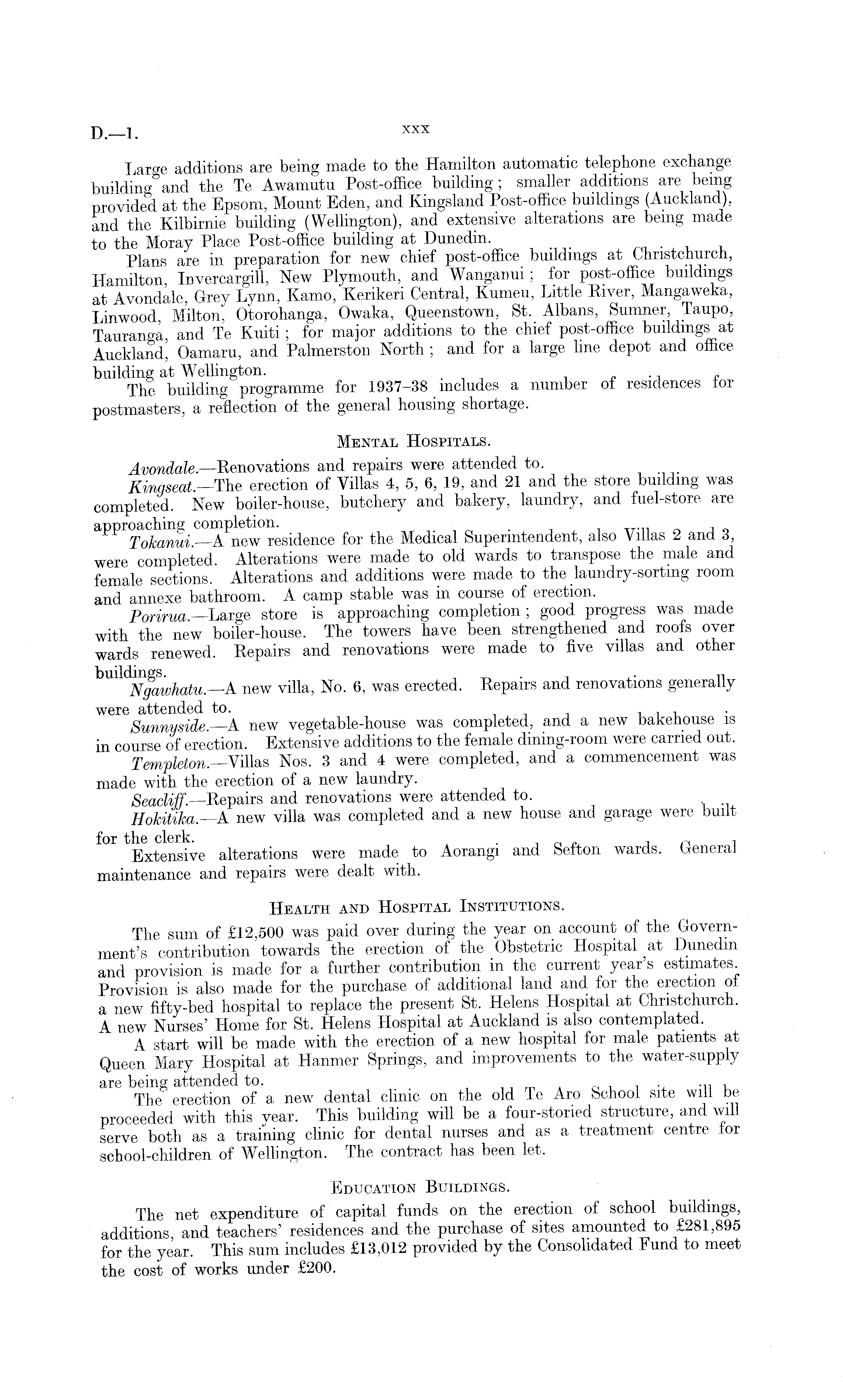 Larcre additions are being made to the Hamilton automatic telephone exchange building o and the Te Awamutu Post-office building ; smaller additions are being provided at the Epsom, Mount Eden, and Kingsland Post-office buildings (Auckland), and the Kilbirnie building (Wellington), and extensive alterations are being made to the Moray Place Post-office building at Dunedin. ril . _ . Plans arc in preparation for new chief post-office buildings at Cnristcnurcii, Hamilton Invercargill, New Plymouth, and Wangaimi; for post-office buildings at Avondale, Grey Lynn, Kamo, Kerikeri Central, Kumeu, Little River, Mangaweka, Linwood, Milton, Otorohanga, Owaka, Queenstown, St. Albans, Sumner, Taupo, Tauranga, and Te Kuiti; for major additions to the chief post-office buildings at Auckland, Oamaru, and Palmerston North ; and for a large line depot and office building at Wellington. The building programme for 1937—38 includes a number 01 residences tor postmasters, a reflection of the general housing shortage. Mental Hospitals. Avondale. —Renovations and repairs were attended to. Kingseat.—The erection of Villas 4, 5, 6, 19, and 21 and the store building was completed. New boiler-house, butchery and bakery, laundry, and fuel-store are approaching completion. , , . .„ , Tokanui—A new residence for the Medical Superintendent, also Villas 2 and 3, were completed. Alterations were made to old wards to transpose the male and female sections. Alterations and additions were made to the laundry-sortmg room and annexe bathroom. A camp stable was in course of erection. Porirua —Large store is approaching completion ; good progress was made with the new boiler-house. The towers have been strengthened and roofs over wards renewed. Repairs and renovations were made to five villas and other Ngawhatu. —A new villa, No. 6, was erected. Repairs and renovations generally were attended to. . Sunnyside—A new vegetable-house was completed, and a new bakehouse is in course of erection. Extensive additions to the female dining-room were carried out. Templeton. —Villas Nos. 3 and 4 were completed, and a commencement was made with the erection of a new laundry. Seacliff. —Repairs and renovations were attended to. Hohitlha. —A new villa was completed and a new house and garage were built for the clerk Extensive alterations were made to Aorangi and Sefton wards. General maintenance and repairs were dealt with. Health and Hospital Institutions. The sum of £12,500 was paid over during the year on account of the Government's contribution towards the erection of the Obstetric Hospital at Dunedin and provision is made for a further contribution in the current year's estimates Provision is also made for the purchase of additional land and for the erection of a new fifty-bed hospital to replace the present St. Helens Hospital at Christchurch. A new Nurses' Home for St. Helens Hospital at Auckland is also contemplated. A start will be made with the erection of a new hospital for male patients at Queen Mary Hospital at Hanmer Springs, and improvements to the water-supply are being attended to. The erection of a new dental clinic on the old Te Aro School site will be proceeded with this year. This building will be a four-stoned structure, and will serve both as a training clinic for dental nurses and as a treatment centre for school-children of Wellington. The contract has been let. Education Buildings. The net expenditure of capital funds on the erection of school buildings, additions and teachers' residences and the purchase of sites amounted to £281,895 for the year. This sum includes £13,012 provided by the Consolidated Fund to meet the cost of works under £200.