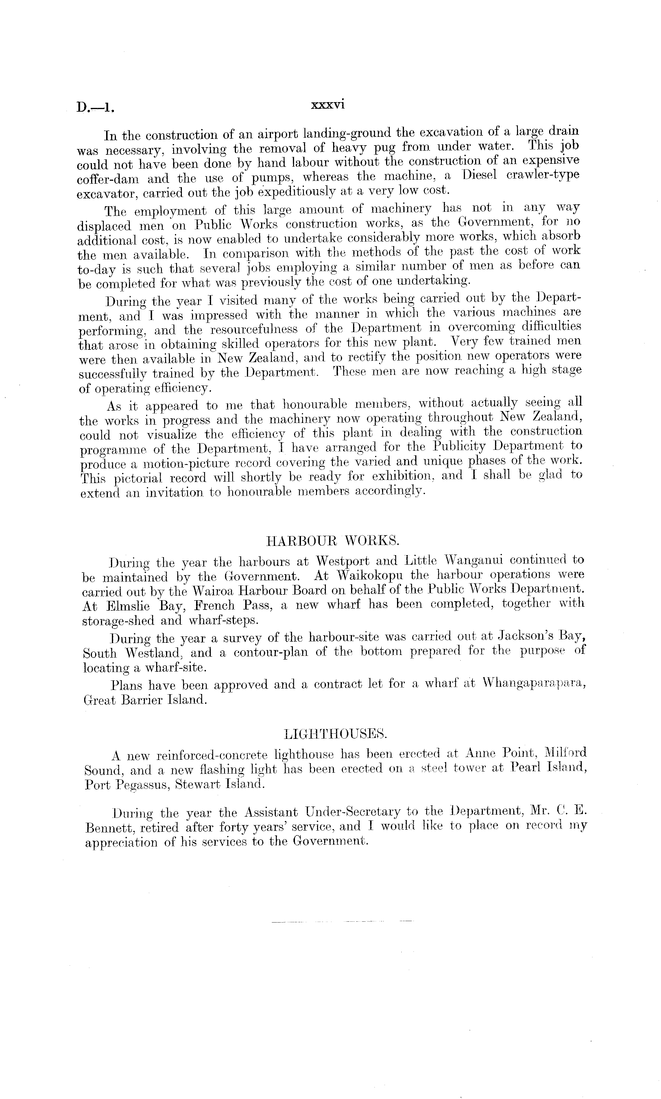 In the construction of an airport landing-ground tlie excavation of a large drain was necessary, involving the removal of heavy pug from under water. This job could not have been done by hand labour without the construction of an expensive coffer-dam and the use of pumps, whereas the machine, a Diesel crawler-type excavator, carried out the job expeditiously at a very low cost. The employment of this large amount of machinery has not in any way displaced men on Public Works construction works, as the Government, for no additional cost, is now enabled to undertake considerably more works, which absorb the men available. In comparison with the methods of the past the cost of work to-day is such that several jobs employing a similar number of men as before can be completed for what was previously the cost of one undertaking. During the year I visited many of the works being carried out by the Department, and I was impressed with the manner in which the various machines are performing, and the resourcefulness of the Department in overcoming difficulties that arose in obtaining skilled operators for this new plant. Very few trained men were then available in New Zealand, and to rectify the position new operators were successfully trained by the Department. These men are now reaching a high stage of operating efficiency. As it appeared to me that honourable members, without actually seeing all the works in progress and the machinery now operating throughout New Zealand, could not visualize the efficiency of this plant in dealing with the construction programme of the Department, Ī have arranged for the Publicity Department to produce a motion-picture record covering the varied and unique phases of the work. This pictorial record will shortly be ready for exhibition, and I shall be glad to extend an invitation to honourable members accordingly. HARBOUR WORKS. During the year the harbours at Westport and Little Wanganui continued to be maintained by the Government. At Waikokopu the harbour operations were carried out by the Wairoa Harbour Board on behalf of the Public Works Department. At Elmslie Bay, French Pass, a new wharf has been completed, together with storage-shed and wharf-steps. During the year a survey of the harbour-site was carried out at Jackson's Bay, South Westland, and a contour-plan of the bottom prepared for the purpose of locating a wharf-site. Plans have been approved and a contract let for a wharf at Whangaparapara, Great Barrier Island. LIGHTHOUSES. A new reinforced-concrete lighthouse has been erected at Anne Point, Milford Sound, and a new flashing light lias been erected on a steel tower at Pearl Island, Port Pegassus, Stewart Island. During the year the Assistant Under-Secretary to the Department, Mr. C. E. Bennett, retired after forty years' service, and I would like to place on record my appreciation of his services to the Government.