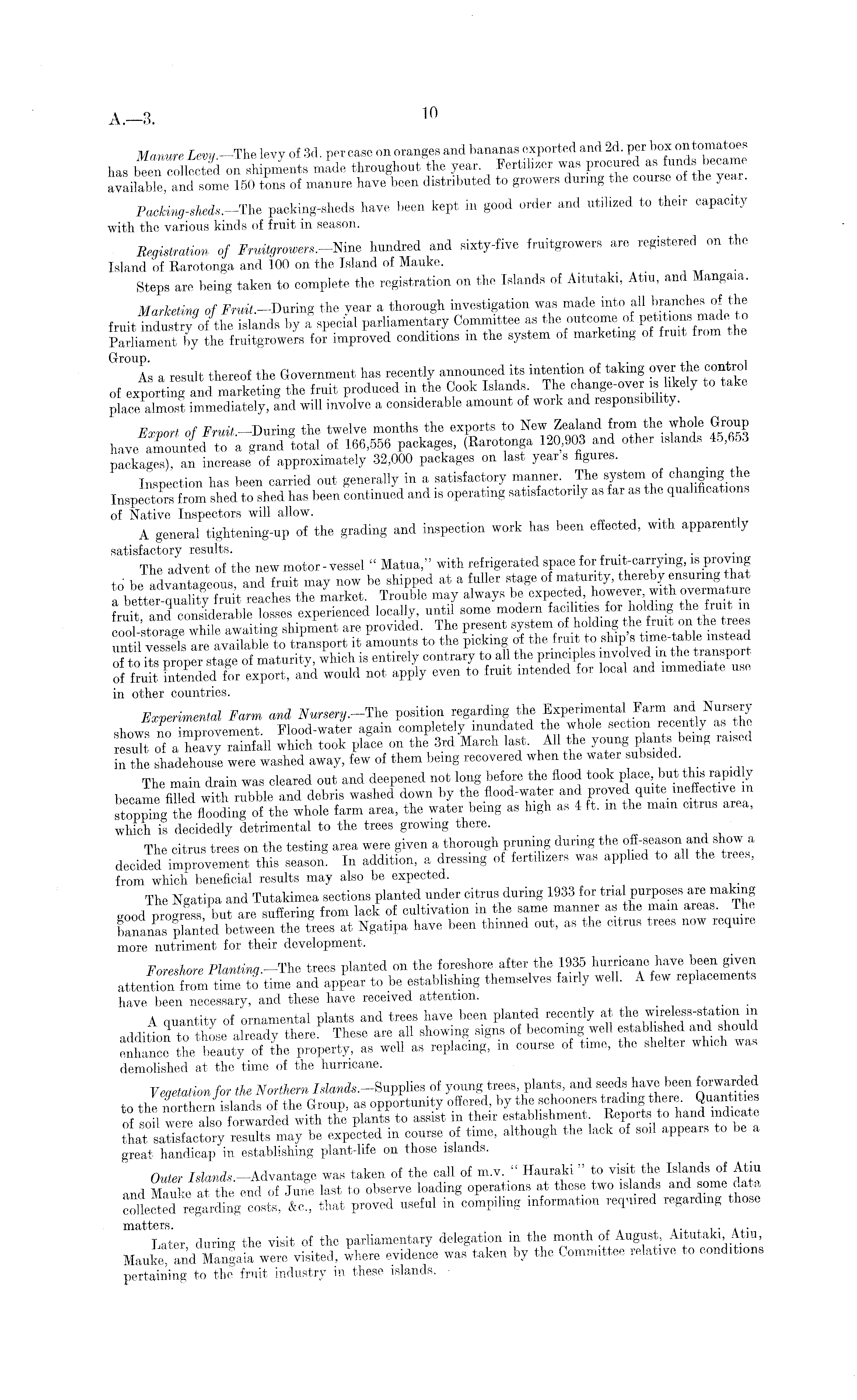 Manure Levy —The levy of 3d. per case on oranges and bananas exported and 2d. per box on tomatoes has been SleoS on shipments made throughout the year. Fertilizer was procured as funds became available, and some 150 tons of manure have been distributed to growers during the course of t y . . Packing-sheds.—The packing-sheds have been kept in good order and utilized to their capacity with the various kinds of fruit in season. Registration of Fruitgrowers.-Nine hundred and sixty-five fruitgrowers are registered on the Island of Rarotonga and 100 on the Island of Mauke. Steps are being taken to complete the registration on the Islands of Aitutaki, Atiu, and Mangaia. Marketing of Fruit.—During the vear a thorough investigation was made into all branches of the fruit industry of the islands by a special parliamentary Committee as the outcome of petitions to Parliament by the fruitgrowers for improved conditions in the system of marketing of fruit from As a result thereof the Government has recently announced its intention of taking over the control of and marketing the fruit produced in the Cook Islands. The change-over is ikely to take place almost immediately, and will involve a considerable amount of work and responsibility. Exvort of Fruit—During the twelve months the exports to New Zealand from the whole Group have amounted to a grand total of 166,556 packages, (Rarotonga 120,903 and other islands 45,653 packages), an increase of approximately 32,000 packages on last year S figures. Inspection has been carried out generally in a satisfactory manner. The system of changing the Inspectors from shed to shed has been continued and is operating satisfactorily as far as the qualifications of Native Inspectors will allow. A general tightening-up of the grading and inspection work has been effected, with apparently satisfactory results. . . . The advent of the new motor - vessel " Matua," with refrigerated space for fruit-carrying, is proving to be advantageous, and fruit may now be shipped at a fuller stage of maturity, thereby ensuring that a better-quality fruit reaches the market. Trouble may always be expected, however with overmature fruit and considerable losses experienced locally, until some modern facilities for holding the fruit cool-storage while awaiting shipment are provided. The present system of holding the fruit on the trees until vessels are available to transport it amounts to the picking of the fruit to ship s time-tab l6 instead of o ite proper stage of maturity, which is entirely contrary to all the principles involved m the transport of fruit intended for export, and would not apply even to fruit intended for local and immediate use in other countries. Experimental Farm and Nursery.—The position regarding the Experimental Farm and Nursery shows no improvement. Flood-water again completely inundated the whole section recently as the result of a he P avy rainfall which took place on the 3rd March last. All the young plants being raised in the shadehouse were washed away, few of them being recovered when the water subsided. The main drain was cleared out and deepened not long before the flood took place, but this rapidly bee.™ fS With mbtte and debris «shed down by stopping the flooding of the whole farm area, the water being as high as 4 ft. m the mam citrus area, which is decidedly detrimental to the trees growing there. The citrus trees on the testing area were given a thorough pruning during the off-season and show a decided improvement this season. In addition, a dressing of fertilizers was applied to all the trees, from which beneficial results may also be expected. The Ngatipa and Tutakimea sections planted under citrus during 1933 for trial purposes are making pood nro»ress but are suffering from lack of cultivation m the same manner as the mam areas. The bananas planted between the trees at Ngatipa have been thinned out, as the citrus trees now require more nutriment for their development. Foreshore Planting.-The trees planted on the foreshore after the 1935 hurricane have been given attention from time to time and appear to be establishing themselves fairly well. A few replacements have been necessary, and these have received attention. 4 quantity of ornamental plants and trees have been planted recently at the weless-stationi m addition to those already there. These are all showing signs of becoming well established and should enhance fc be.nty of 4, property, • well „ replying, in cows, ol time, the ehelte, wlneh w» S demolished at the time of the hurricane. Vegetation for the Northern Islands.-Supplies of young trees plants, and seeds have been forwarded to the northern islands of the Group, as opportunity offered, by the schooners trading there. Quantities of soil were also forwarded with the plants to assist in their establishment Reports to hand indicate that satisfactory results may be expected in course of time, although the lack of soil appears great handicap in establishing plant-life on those islands. Outer Islands. —Advantage was taken of the call of m.v. " Hauraki " to visit the Islands of Atiu and Mauke at the end of June last to observe loading operations at these two islands and some data collected'regarding costs, &c„ that proved useful in compiling information required regarding those matters. . . . Later during the visit of the parliamentary delegation in the month of August, Aitutaki Atiu, Mauke and Mangaia were visited, where evidence was taken by the Committee relative to conditions pertaining to the fruit industry in these islands. -