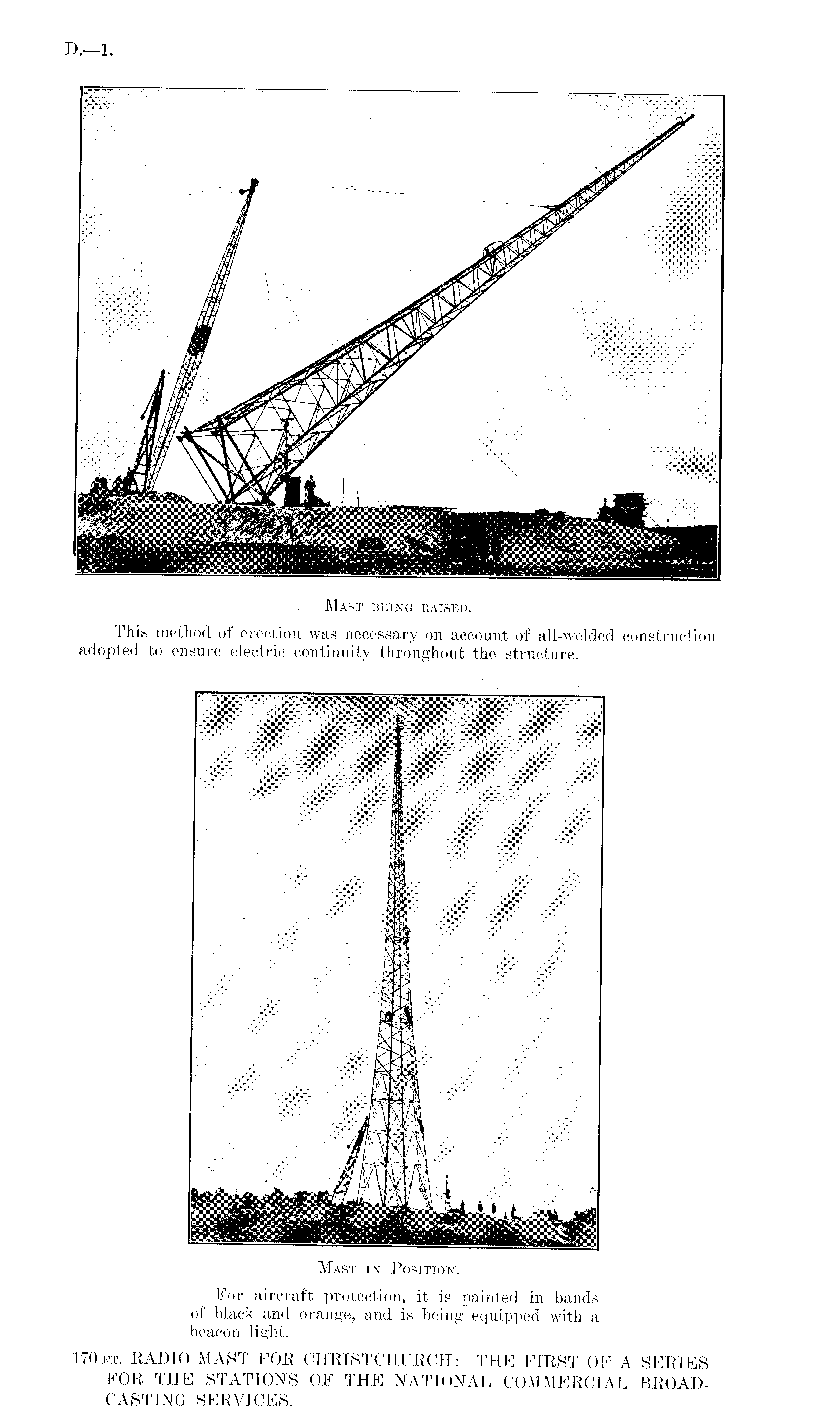 For aircraft protection, it is painted in bands of black and orange, and is being equipped with a beacon light. 170 FT. RADIO MAST FOR CHRISTCHURCH: THE FIRST OF A SERIES FOR THE STATIONS OF THE NATIONAL COMMERCIAL BROADCASTING SERVICES.