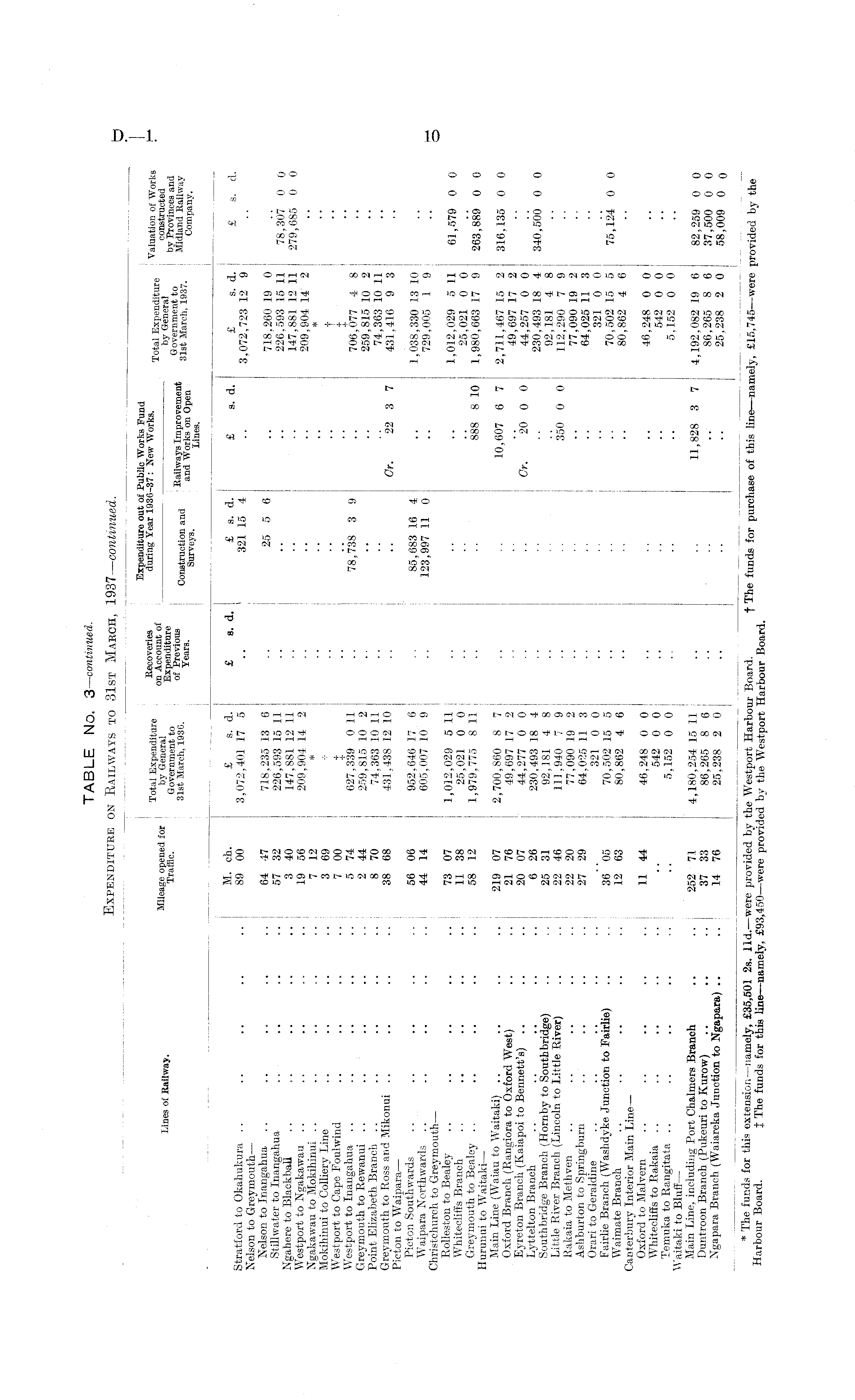 Expenditure out of Public Works Fund Total Expenditure °™ ri f , i during Yeaī 1936 - 37: Works. T Bxi)endituie Valuation ol Works Lines of Railway, Mileage opened for by General "i ■ hv °^?5 Ucted „ Traffic. Government to T) T . Government to by Provinces and 81 st March, 19 36. "'S" ! Constructs and Improvement y ' Lines. M. ch. £ s. d. £ g. d. I £ s. d. £ s. d. £ s d £ s d Stratiord to Okahukura .. .. .. .. .. 89 00 3,072,401 17 5 .. » 321 15 4 .. 3 072 723 12* 9 Nelson to Grevmouth — * * ' ' Nelson to Inangahua .. .. .. 64 47 718,235 13 6 .. 25 5 6 .. 718 260 19 0 Stillwater to Inangahua ... .. .. .. 57 32 226,593 15 11 .. .. ' 226'ō93 15 11 78 307 n ft Ngahere to Blackball 3 40 147,881 12 11 .. .. ' 147 88112 11 279 685 0 0 Westport to Ngakawau 19 56 209,904 14 2 .. .. 209 904 14 2 Z ' y '° 8 ° U U Ngakawau to Mokihinui .......... 712 * .. .. ' * Mokihinui to Colliery Line .. .. .. .. 3 69 f .. .. *' + Westport to Cape Foulwind ........ 7 00 J .. .. ' * + Westport to Inangahua .. .. .. .. .. 5 74 627,339 0 11 " 78,738 3 9 !! 706 077 4 8 Greymouth to Rewanui .. .. .. .. .. 2 44 259,815 10 2 .. .. 259' 815 10 2 Point Elizabeth Branch .. .. .. .. .. 8 70 74,363 10 11 .. .. " 74'363 10 11 Greymouth to Ross and Mikonui .. .. .. .. 38 68 431,438 12 10 .. .. Or. 22 3 7 431'416 9 3 Pic ton to Waipara — ' Picton Southwards .. .. .. .. .. 56 06 952,646 17 6 .. 85,683 16 4 .. 1,038 330 13 10 Waipara Northwards .. .. .. .. .. 44 14 605,007 10 9 .. 123,997 11 0 72<)'005 1 9 Christchurch to Greymouth — Rolleston to Bealey 73 07 1,012,029 5 11 .. .. .. 1,012,029 5 11 61,579 0 0 Whitecliffs Branch .. .. .. .. .. 11 38 25,021 0 0.. 25 021 0 0 Greymouth to Bealey 58 12 1,979,775 8 11 .. .. 888 8 10 1,980, '663 17 9 263,889 0 0 Hurunui to Waitaki — Main Line (Waiau to Waitaki) 219 07 2,700,860 8 7 _ .. 10,607 6 7 2,711,467 15 2 316,135 0 0 Oxford Branch (Rangiora to Oxford West) .. ,. 21 76 49,697 17 2 .. .. .. 49 697 17 2 Eyreton Branch (Kaiapoi to Bennett's) .. .. .. 20 07 44,277 0 0 . Cr 20 0 0 44'257 0 0 Lyttelton Branch _ .. .. 6 26 230,493 18 4 .. .. .. 230 1493 18 4 340,500 0 0 bouthbridge Branch (Hornby to Southbrcdge) .. .. 25 31 92,181 4 8 .. .. 92 181 4 8 Little River Branch (Lincoln to Little River) .. .. 22 46 111,940 7 9 '. ] 350 0 0 112'290 7 9 Rakaia to Methven .. .. .. .. .. 22 20 77,090 19 2 . 77'090 19 2 Ashburton to Springburn .. .. .. .. 27 29 64.025 11 3 .. .. " «4W ii ? Orari to Geraldine .. .. .. .. .. .. 321 0 0 .. " '321 0 0 Fairlie Branch (Washdvke Junction to Fairlie) .. .. 36 05 70,502 15 5 70 502 15 5 75 124 0 0 Waimate Branch .. .. .. .. .. 12 63 80,862 4 6 11 " 8o'8fi2 4 6 Canterbury Interior Main Line — '' ' Oxford to Malvern .. .. .. .. .. 11 44 46,248 0 0 .. .. 46 248 0 0 Whitecliffs to Rakaia .. .. .. .. .. .. 542 0 0 .. '' ' 542 0 0 Temuka to Rangitata .. .. .. .. .. .. 5,152 0 0 " * iw n 0 Waitaki to Bluff— " " ' Main Line, including Port Chalmers Branch .. .. 252 71 4,180,254 15 11 .. 11 828 3 7 4 192 082 19 6 82 okq n ft Duntroon Branch (Pukeuri to Kurow) 37 33 86,265 8 6 .. .. 86 265 8 6 37 500 0 0 Ngapara Branch (Waiareka Junction to Ngapara) .. .. 14 76 25,238 2 0 .. .. .. 25*238 2 0 0 0 * The funds for this extension— namely, £35,501 2s. lid.—were provided by the Westport Harbour Board. t The funds for purchase of this line— namely, £15,745— were provided bv the Harbour Board. J The funds for this line —namely, £93,450 —were provided by the Westport Harbour Board.