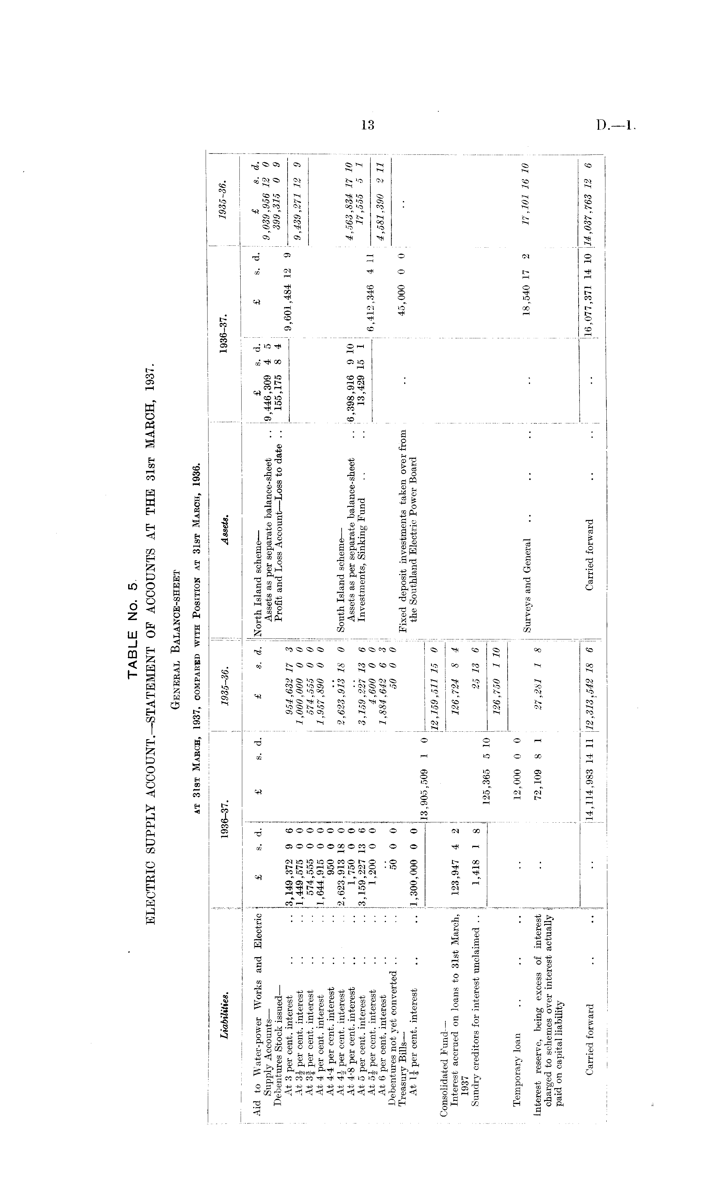 TABLE No. 5 ELECTRIC SUPPLY ACCOUNT.— STATEMENT OF ACCOUNTS AT THE 31st MARCH, 1937. General Balance-sheet at 31st March, 1937, compared with Position at 31st March, 1936.