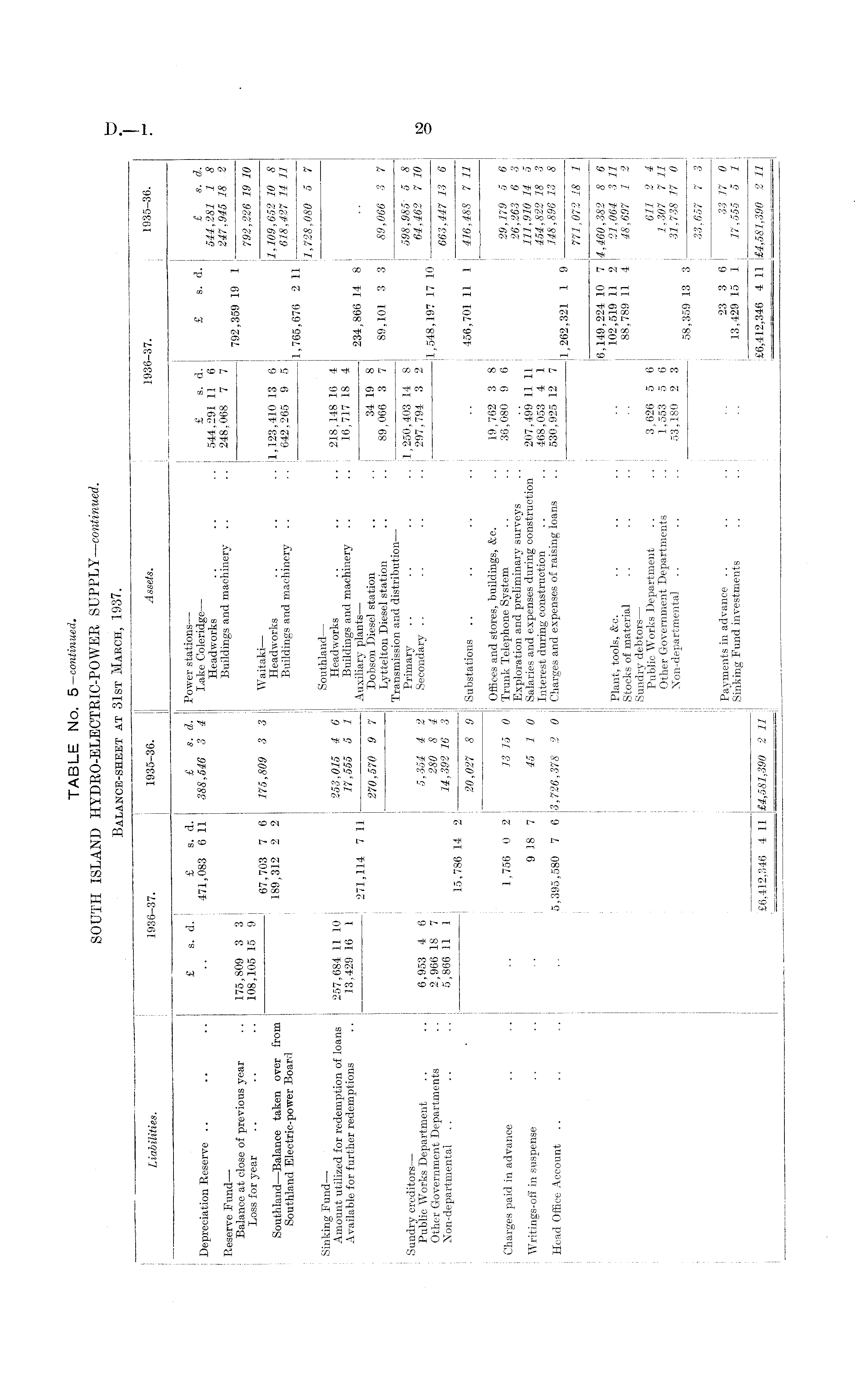 TABLE No. 5—continued. SOUTH ISLAND HYDRO-ELECTRIC-POWER SUPPLY—continued. Balance-sheet at 31st March, 1937.