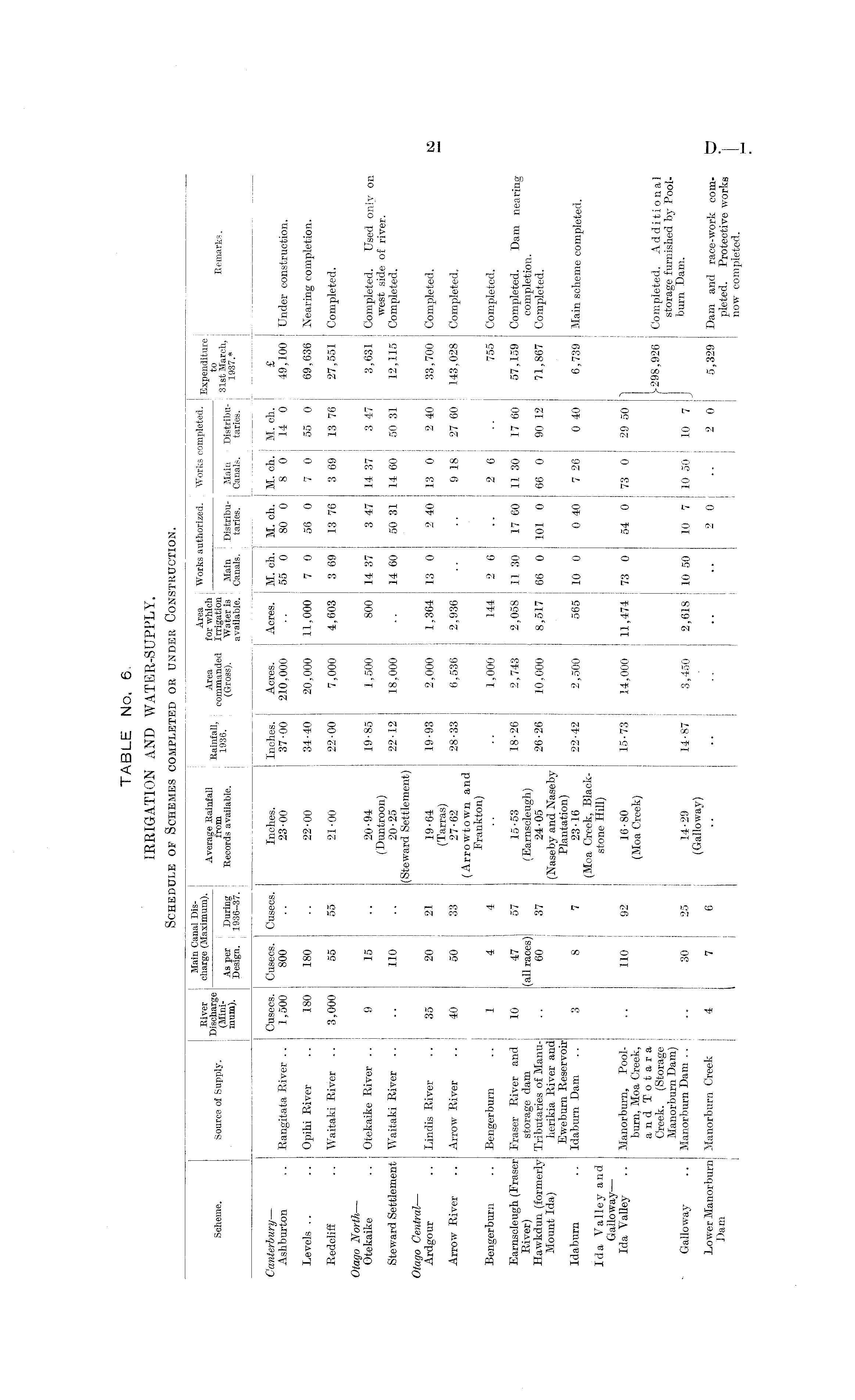 Average Rainfall j Bainlall Area forwhth 1 aUth0ri2ed ' W ° rkS com P leted - [ Expenditure Soheme. Source of Supply. ™- , 8 from ioqr commanded Irrigation 1 ,, 1tl i;,,,.,.!. Remarks. rnnm'i" As per | During Records available. j | (Gross). Water is j Alain j Distribu- Main I Bistribu- | 1Qq7 , ' Design. ; 1986-37. | I : available, j Canals, | taries. Canals, i taries. | * Canterbury — Cusees. Cusecs. Cuseos. Inches. Inches. Acres. Acres. M. ch. M. eh. M. ch. M. ch. j £ Ashburton .. Rangitata River .. 1,500 800 .. 23-00 37 ■ 00 210,000 .. 55 0 80 0 8 0 14 0 49,100 Under construction. Levels .. .. Opihi River .. 180 180 .. 22-00 34-40 20,000 11,000 7 0 56 0 7 0 55 0 69,636 Nearing completion. Redclifi .. Waitaki River .. 3,000 55 55 21-00 22-00 7,000 4,603 3 69 13 76 3 69 13 76 27,551 Completed. Otago North — Otekaike .. Otekaike River .. 9 15 .. 20-94 19-85 1,500 800 14 37 3 47 14 37 3 47 3,631 Completed. Used only on (Duntroon) west side of river. Steward Settlement Waitaki River .. .. 110 .. 20-25 22-12 18,000 .. 14 60 50 31 14 60 50 31 12,115 Completed. (Steward Settlement) Otago Central — Ardgour .. Lindis River .. 35 20 21 19-64 19-93 2,000 1,364 13 0 2 40 13 0 2 40 33,700 Completed. (Tarras) Arrow River .. Arrow River .. 40 50 33 27-62 28-33 6,536 2,936 .. .. 9 18 27 60 143,028 Completed, (Arrowtown and Frankton) Bengerburn .. Bengerburn ..1 4 4 .. .. 1,000 144 2 6 .. 2 6 .. 755 Completed. Earnscleugh (Fraser Fraser River and 10 47 57 15-53 18-26 2,743 2,058 11 30 17 60 11 30 17 60 57,159 Completed. Dam nearing River) storage dam (all races) (Earnscleugh) completion. Hawkdun (formerly Tributaries of Mann- .. 60 37 24-05 26-26 10,000 8,517 66 0 101 0 66 0 90 12 71,867 Completed. Mount Ida) lierikia River and (Naseby and Naseby Eweburn Reservoir Plantation) Idaburn .. Idaburn Dam ..3 8 7 23-16 22-42 2,500 565 10 0 0 40 7 26 0 40 6,739 Main scheme completed. (Moa Creek, BlackIda Valley and stone Hill) Galloway — Ida Valley .. Manorburn, Pool- .. 110 92 16-80 15-73 14,000 11,474 73 0 54 0 73 0 29 50 burn, Moa Creek, (Moa Creek) Creek. (Storage f-298,926 Completed. Additional Manorburn Dam) j storage furnished by PoolGalloway .. Manorburn Dam .. .. 30 25 14-29 14-87 3,450 2,618 10 50 10 7 10 50 10 7 J burn Dam. (Galloway) Lower Manorburn Manorburn Creek 4 7 6 .. .. .. .. .. 20.. 20 5,329 Dam and race -work completed. Protective works I ' now completed.