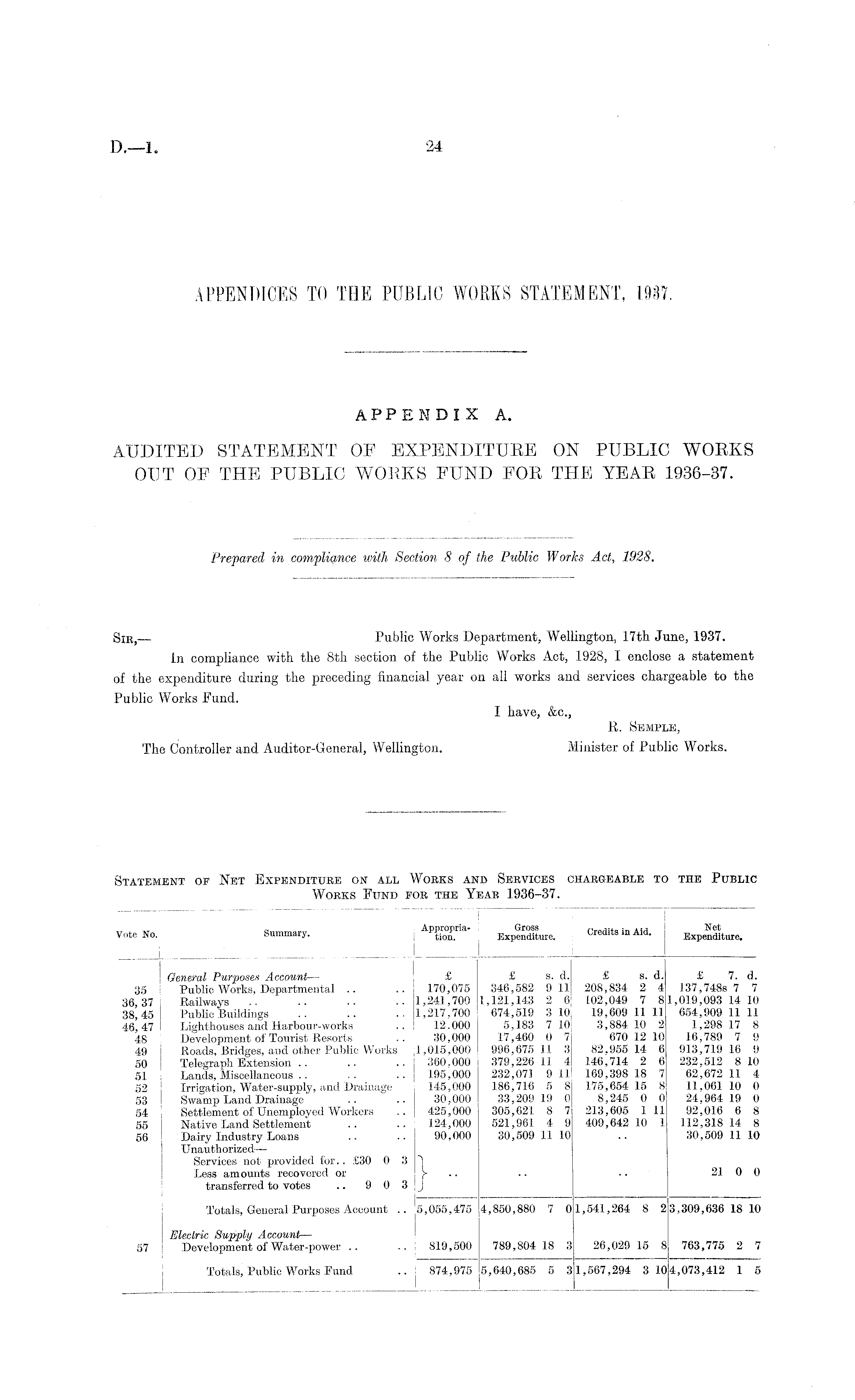 Sir, — Public Works Department, Wellington, 17th June, 1937. In compliance with the Bth section of the Public Works Act, 1928, I enclose a statement of the expenditure during the preceding financial year on all works and services chargeable to the Public Works Fund. I have, &c., R. Semple, The Controller and Auditor-General, Wellington. Minister of Public Works.