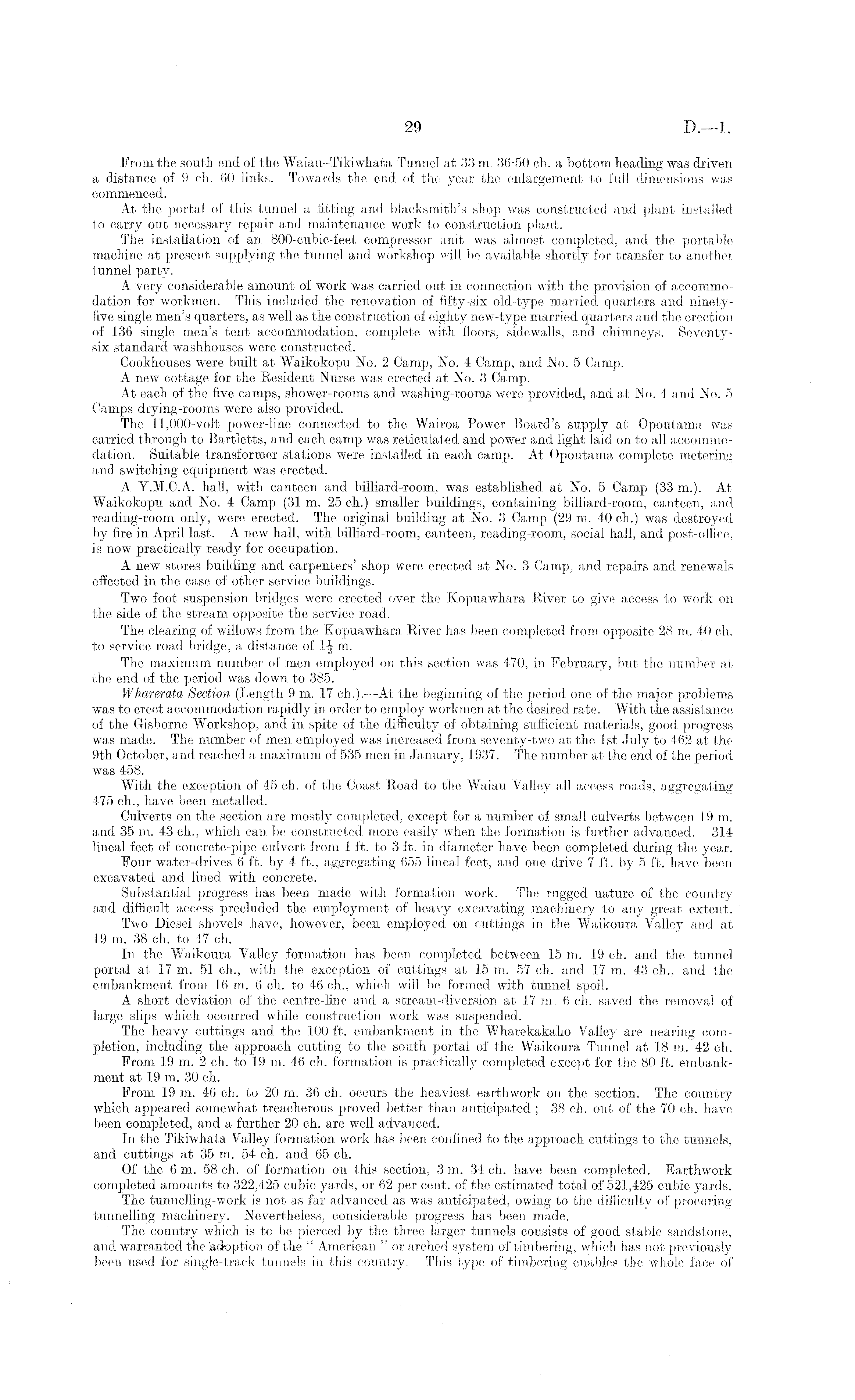 From the south end of the Waiau-Tikiwhata Tunnel at 33 m. 36-50 ch. a bottom heading was driven a distance of 9 oh. 60 links. Towards the end. of the year the enlargement to full dimensions was commenced. At the portal of this tunnel a fitting and blacksmith's shop was constructed and plant installed to carry out necessary repair and maintenance work to construction plant. The installation of an 800-cubic-feet compressor unit was almost completed, and the portable machine at present supplying the tunnel and workshop will be available shortly for transfer to another tunnel party. A very considerable amount of work was carried out in connection with the provision of accommodation for workmen. This included the renovation of fifty-six old-type married quarters and ninetyfive single men's quarters, as well as the construction of eighty new-type married quarters and the erection of 136 single men's tent accommodation, complete with floors, sidewalls, and chimneys. Seventysix standard washhouses were constructed. Cookhouses were built at Waikokopu No. 2 Gamp, No. 4 Camp, and No. 5 Camp. A new cottage for the Resident Nurse was erected at No. 3 Camp. At each of the five camps, shower-rooms and washing-rooms were provided, and at No. 4 and No. 5 Camps drying-rooms were also provided. The 11,000-volt power-line connected to the Wairoa Power Board's supply at Opoutama was carried through to Bartletts, and each camp was reticulated and power and light laid on to all accommodation. Suitable transformer stations were installed in each camp. At Opoutama complete metering and switching equipment was erected. A Y.M.C.A. hall, with canteen and billiard-room, was established at No. 5 Camp (33 m.). At Waikokopu and No. 4 Camp (31 m. 25 ch.) smaller buildings, containing billiard-room, canteen, and reading-room only, were erected. The original building at No. 3 Camp (29 m. 40 ch.) was destroyed by fire in April last. A new hall, with billiard-room, canteen, reading-room, social hall, and post-office, is now practically ready for occupation. A new stores building and carpenters' shop were erected at No. 3 Camp, and repairs and renewals effected in the case of other service buildings. Two foot suspension bridges were erected over the Kopuawhara Biver to give access to work on the side of the stream opposite the service road. The clearing of willows from the Kopuawhara River has been completed from opposite 28 m. 40 ch. to service road bridge, a distance of 1§ m. The maximum number of men employed on this section was 470, in February, but the number at the end of the period was down to 385. Wharerata Section (Length 9 m. 17 ch.). —At the beginning of the period one of the major problems was to erect accommodation rapidly in order to employ workmen at the desired rate. With the assistance of the Gisborne Workshop, and in spite of the difficulty of obtaining sufficient materials, good progress was made. The number of men employed was increased from seventy-two at the Ist July to 462 at the 9th October, and reached a maximum of 535 men in January, 1937. The number at the end of the period was 458. With the exception of 45 ch. of the Coast Road to the Waiau Valley all access roads, aggregating 475 ch., have been metalled. Culverts on the section are mostly completed, except for a number of small culverts between 19 m. and 35 m. 43 cli., which can be constructed more easily when the formation is further advanced. 314 lineal feet of concrete-pipe culvert from 1 ft. to 3 ft. in diameter have been completed during the year. Four water-drives 6 ft. by 4 ft., aggregating 655 lineal feet, and one drive 7 ft. by 5 ft. have been excavated and lined with concrete. Substantial progress has been made with formation work. The rugged nature of the country and difficult access precluded the employment of heavy excavating machinery to any great extent. Two Diesel shovels have, however, been employed on cuttings in the Waikoura Valley and at 19 m. 38 ch. to 47 ch. In the Waikoura Valley formation has been completed between 15 m. 19 ch. and the tunnel portal at 17 m. 51 ch., with the exception of cuttings at 15 m. 57 ch. and 17 m. 43 ch., and the embankment from 16 m. 6 ch. to 46 ch., which will be formed with tunnel spoil. A short deviation of the centre-line and a stream-diversion at 17 m. 6 ch. saved the removal of large slips which occurred while construction work was suspended. The heavy cuttings and the 100 ft. embankment in the Wharekakaho Valley are nearing completion, including the approach cutting to the south portal of the Waikoura Tunnel at 18 m. 42 ch. From 19 m. 2 ch. to 19 m. 46 ch. formation is practically completed except for the 80 ft. embankment at 19 m. 30 ch. From 19 m. 46 ch. to 20 m. 36 ch. occurs the heaviest earthwork on the section. The country which appeared somewhat treacherous proved better than anticipated ; 38 ch. out of the 70 ch. have been completed, and a further 20 ch. are well advanced. In the Tikiwhata Valley formation work has been confined to the approach cuttings to the tunnels, and cuttings at 35 m. 54 ch. and 65 ch. Of the 6m. 58 ch. of formation on this section, 3m. 34 ch. have been completed. Earthwork completed amounts to 322,425 cubic yards, or 62 per cent, of the estimated total of 521,425 cubic yards. The tunnelling-work is not as far advanced as was anticipated, owing to the difficulty of procuring tunnelling machinery. Nevertheless, considerable progress has been made. The country which is to be pierced by the three larger tunnels consists of good stable sandstone, and warranted the adoption of the " American " or arched system of timbering, which has not previously been used for single-track tunnels in this country. This type of timbering enables the whole face of