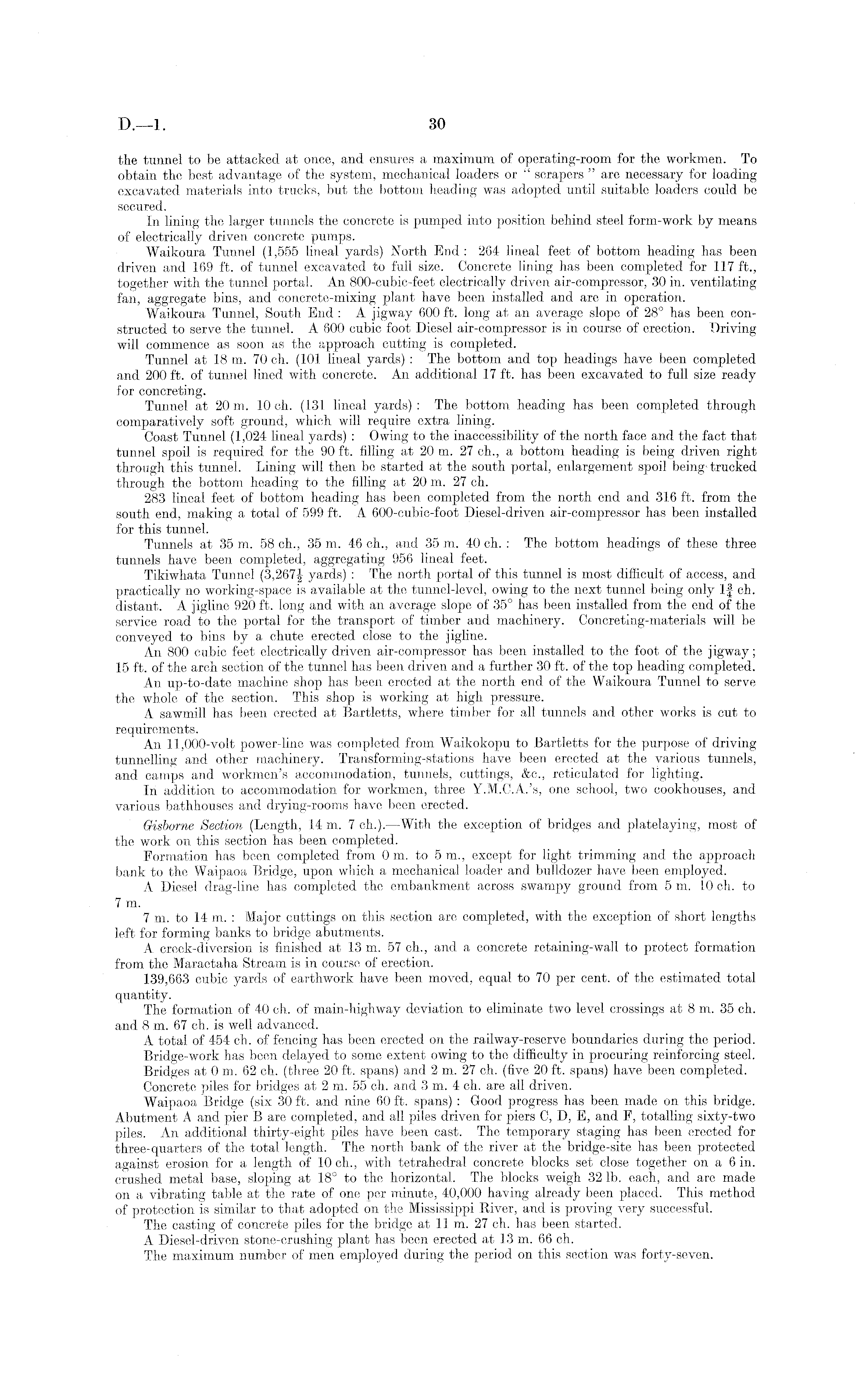 the tunnel to be attacked at once, and ensures a maximum of operating-room for the workmen. To obtain the best advantage of the system, mechanical loaders or " scrapers " are necessary for loading excavated materials into trucks, but the bottom heading was adopted until suitable loaders could be secured. In lining the larger tunnels the concrete is pumped into position behind steel form-work by means of electrically driven concrete pumps. Waikoura Tunnel (1,555 lineal yards) North End : 264 lineal feet of bottom heading has been driven and 169 ft. of tunnel excavated to full size. Concrete lining has been completed for 117 ft., together with the tunnel portal. An 800-cubic-feet electrically driven air-compressor, 30 in. ventilating fan, aggregate bins, and concrete-mixing plant have been installed and are in operation. Waikoura Tunnel, South End : A jigway 600 ft. long at an average slope of 28° has been constructed to serve the tunnel. A 600 cubic foot Diesel air-compressor is in course of erection. Driving will commence as soon as the approach cutting is completed. Tunnel at 18 m. 70 ch. (101 lineal yards) : The bottom and top headings have been completed and 200 ft. of tunnel lined with concrete. An additional 17 ft. has been excavated to full size ready for concreting. Tunnel at 20 m. 10 ch. (131 lineal yards) : The bottom heading has been completed through comparatively soft ground, which will require extra lining. Coast Tunnel (1,024 lineal yards) : Owing to the inaccessibility of the north face and the fact that tunnel spoil is required for the 90 ft. filling at 20 m. 27 ch., a bottom heading is being driven right through this tunnel. Lining will then be started at the south portal, enlargement spoil being-trucked through the bottom heading to the filling at 20 m. 27 ch. 283 lineal feet of bottom heading has been completed from the north end and 316 ft. from the south end, making a total of 599 ft. A 600-cubic-foot Diesel-driven air-compressor has been installed for this tunnel. Tunnels at 35 m. 58 ch., 35 m. 46 ch., and 35 m. 40 ch. : The bottom headings of these three tunnels have been completed, aggregating 956 lineal feet. Tikiwhata Tunnel (3,267 yards) : The north portal of this tunnel is most difficult of access, and practically no working-space is available at the tunnel-level, owing to the next tunnel being only If ch. distant. A jigline 920 ft. long and with an average slope of .35° has been installed from the end of the service road to the portal for the transport of timber and machinery. Concreting-materials will be conveyed to bins by a chute erected close to the jigline. An 800 cubic feet electrically driven air-compressor has been installed to the foot of the jigway; 15 ft. of the arch section of the tunnel has been driven and a further 30 ft. of the top heading completed. An up-to-date machine shop has been erected at the north end of the Waikoura Tunnel to serve the whole of the section. This shop is working at high pressure. A sawmill has been erected at Bartletts, where timber for all tunnels and other works is cut to requirements. An 11,000-volt power-line was completed from Waikokopu to Bartletts for the purpose of driving tunnelling and other machinery. Transforming-stations have been erected at the various tunnels, and camps and workmen's accommodation, tunnels, cuttings, &c., reticulated for lighting. In addition to accommodation for workmen, three Y.M.CA.'s, one school, two cookhouses, and various bathhouses and drying-rooms have been erected. Gisbome Section (Length, L 4 m. 7 ch.). —With the exception of bridges and platelaying, most of the work on this section has been completed. Formation has been completed from 0 m. to 5 m., except for light trimming and the approach bank to the Waipaoa Bridge, upon which a mechanical loader and bulldozer have been employed. A Diesel drag-line has completed the embankment across swampy ground from 5 m. 10 ch. to 7 m. 7m. to 14 m. : Major cuttings on this section are completed, with the exception of short lengths left for forming banks to bridge abutments. A creek-diversion is finished at 13 m. 57 ch., and a concrete retaining-wall to protect formation from the Maraetaha Stream is in course of erection. 139,663 cubic yards of earthwork have been moved, equal to 70 per cent, of the estimated total quantity. The formation of 40 ch. of main-highway deviation to eliminate two level crossings at 8 m. 35 ch. and 8 m. 67 ch. is well advanced. A total of 454 ch. of fencing has been erected on the railway-reserve boundaries during the period. Bridge-work has been delayed to some extent owing to the difficulty in procuring reinforcing steel. Bridges at 0 m. 62 ch. (three 20 ft. spans) and 2 m. 27 ch. (five 20 ft. spans) have been completed. Concrete piles for bridges at 2 m. 55 ch. and 3 m. 4 ch. are all driven. Waipaoa Bridge (six 30 ft. and nine 60 ft. spans) : Good progress has been made on this bridge. Abutment A and pier B are completed, and all piles driven for piers C, D, E, and F, totalling sixty-two piles. An additional thirty-eight piles have been cast. The temporary staging has been erected for three-quarters of the total length. The north bank of the river at the bridge-site has been protected against erosion for a length of 10 ch., with tetrahedral concrete blocks set close together on a 6 in. crushed metal base, sloping at 18° to the horizontal. The blocks weigh 32 lb. each, and are made on a vibrating table at the rate of one per minute, 40,000 having already been placed. This method of protection is similar to that adopted on the Mississippi River, and is proving very successful. The casting of concrete piles for the bridge at 11 m. 27 ch. has been started. A Diesel-driven stone-crushing plant has been erected at 13 m. 66 ch. The maximum number of men employed during the period on this section was forty-seven.