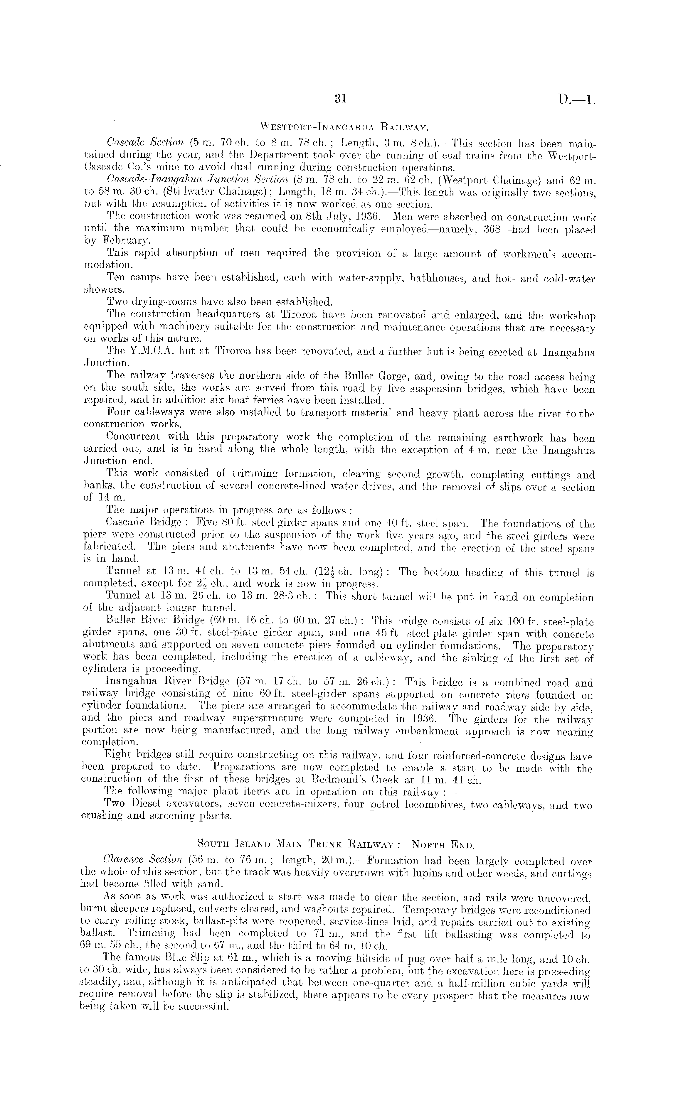 Westport-Inangahua Railway. Cascade Section (5 m. 70 ch. to 8 m. 78 oh. ; Length, 3m. Bch.). —This section has been maintained during the year, and the Department took over the running of coal trains from the WestportCascade Co.'s mine to avoid dual running during construction operations. Cascade-Inangah.ua, Junction Section (8 m. 78 ch. to 22 m. 62 ch. (Westport Chainage) and 62 m. to 58 m. 30 ch. (Stillwater Chainage); Length, 18 m. 34 ch.). —This length was originally two sections, but with the resumption of activities it is now worked as one section. The construction work was resumed on Bth July, 1936. Men were absorbed on construction work until the maximum number that could be economically employed—namely, 368 —had been placed by February. This rapid absorption of men required the provision of a large amount of workmen's accommodation. Ten camps have been established, each with water-supply, bathhouses, and hot- and cold-water showers. Two drying-rooms have also been established. The construction headquarters at Tiroroa have been renovated and enlarged, and the workshop equipped with machinery suitable for the construction and maintenance operations that are necessary on works of this nature. The Y.M.C.A. hut at Tiroroa has been renovated, and a further hut is being erected at Inangahua Junction. The railway traverses the northern side of the Buller Gorge, and, owing to the road access being on the south side, the works are served from this road by five suspension bridges, which have been repaired, and in addition six boat ferries have been installed. Four cableways were also installed to transport material and heavy plant across the river to the construction works. Concurrent with this preparatory work the completion of the remaining earthwork has been carried out, and is in hand along the whole length, with the exception of 4 m. near the Inangahua Junction end. This work consisted of trimming formation, clearing second growth, completing cuttings and banks, the construction of several concrete-lined water-drives, and the removal of slips over a section of 14 m. The major operations in progress are as follows : — Cascade Bridge : Five 80 ft. steel-girder spans and one 40 ft. steel span. The foundations of the piers were constructed prior to the suspension of the work five years ago, and the steel girders were fabricated. The piers and abutments have now been completed, and the erection of the steel spans is in hand. Tunnel at 13 m. 41 ch. to 13 m. 54 ch. (12J ch. long) : The bottom heading of this tunnel is completed, except for 2-J ch., and work is now in progress. Tunnel at 13 m. 26 ch. to 13 m. 28-3 ch. : This short tunnel will be put in hand on completion of the adjacent longer tunnel. Buller River Bridge (60 m. 16 ch. to 60 m. 27 ch.) : This bridge consists of six 100 ft. steel-plate girder spans, one 30 ft. steel-plate girder span, and one 45 ft. steel-plate girder span with concrete abutments and supported on seven concrete piers founded on cylinder foundations. The preparatory work has been completed, including the erection of a cableway, and the sinking of the first set of cylinders is proceeding. Inangahua River Bridge (57 m. 17 ch. to 57 m. 26 ch.) : This bridge is a combined road and railway bridge consisting of nine 60 ft. steel-girder spans supported on concrete piers founded on cylinder foundations. The piers are arranged to accommodate the railway and roadway side by side, and the piers and roadway superstructure were completed in 1936. The girders for the railway portion are now being manufactured, and the long railway embankment approach is now nearing completion. Bight bridges still require constructing on this railway, and four reinforced-conerete designs have been prepared to date. Preparations are now completed to enable a start to be made with the construction of the first of these bridges at Redmond's Creek at II m. 41 ch. The following major plant items are in operation on this railway :— Two Diesel excavators, seven concrete-mixers, four petrol locomotives, two cableways, and two crushing and screening plants. South Island Main Trunk Railway : Nobth End. Clarence Section (56 m. to 76 in. ; length, 20 m.). —Formation had been largely completed over the whole of this section, but the track was heavily overgrown with lupins and other weeds, and cuttings had become filled with sand. As soon as work was authorized a start was made to clear the section, and rails were uncovered, burnt sleepers replaced, culverts cleared, and washouts repaired. Temporary bridges were reconditioned to carry rolling-stock, ballast-pits were reopened, service-lines laid, and repairs carried out to existing ballast. Trimming had been completed to 71 m., and the first lift ballasting was completed to 69 m. 55 ch., the second to 67 m., and the third to 64 m. 10 ch. The famous Blue Slip at 61 m., which is a moving hillside of pug over half a mile long, and 10 ch. to 30 ch. wide, has always been considered to be rather a problem, but the excavation here is proceeding steadily, and, although it is anticipated that between one-quarter and a half-million cubic yards will require removal before the slip is stabilized, there appears to be every prospect that the measures now being taken will be successful.
