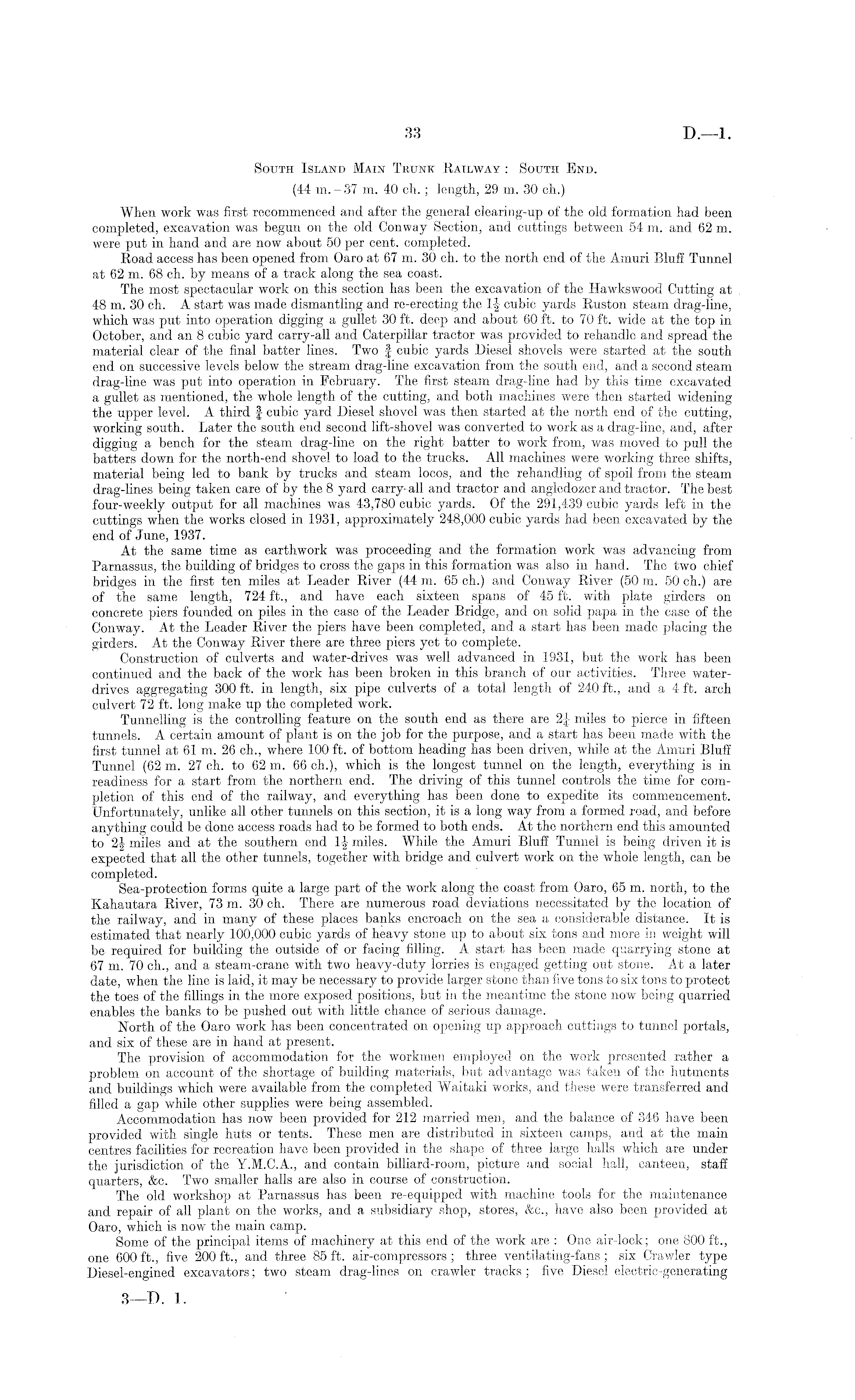 South Island Main Trunk Railway : South End. (44 m. -37 m. 40 oh. ; length, 29 m. 30 ch.) When work was first recommenced and after the general clearing-up of the old formation had been completed, excavation was begnn on the old Conway Section, and cuttings between 54 m. and 62 m. were put in hand and are now about 50 per cent, completed. Road access has been opened from Oaro at 67 m. 30 ch. to the north end of the Amuri Bluff Tunnel at 62 m. 68 ch. by means of a track along the sea coast. The most spectacular work on this section has been the excavation of the Hawkswood Cutting at 48 m. 30 ch. A start was made dismantling and re-erecting the If cubic yards Ruston steam drag-line, which was put into operation digging a gullet 30 ft. deep and about 60 ft. to 70 ft. wide at the top in October, and an 8 cubic yard carry-all and Caterpillar tractor was provided to rehandle and spread the material clear of the final batter lines. Two J cubic yards Diesel shovels were started at the south end on successive levels below the stream drag-line excavation from the south end, and a second steam drag-line was put into operation in February. The first steam drag-line had by this time excavated a gullet as mentioned, the whole length of the cutting, and both machines were then started widening the upper level. A third | cubic yard Diesel shovel was then started at the north end of the cutting, working south. Later the south end second lift-shovel was converted to work as a drag-line, and, after digging a bench for the steam drag-line on the right batter to work from, was moved to pull the batters down for the north-end shovel to load to the trucks. All machines were working three shifts, material being led to bank by trucks and steam locos, and the rehandling of spoil from the steam drag-lines being taken care of by the 8 yard carry-all and tractor and angledozer and tractor. The best four-weekly output for all machines was 43,780 cubic yards. Of the 291,439 cubic yards left in the cuttings when the works closed in 1931, approximately 248,000 cubic yards had been excavated by the end of June, 1937. At the same time as earthwork was proceeding and the formation work was advancing from Parnassus, the building of bridges to cross the gaps in this formation was also in hand. The two chief bridges in the first ten miles at. Leader River (44 m. 65 ch.) and Conway River (50 m. 50 ch.) are of the same length, 724 ft., and have each sixteen spans of 45 ft. with plate girders on concrete piers founded on piles in the case of the Leader Bridge, and on solid papa in the case of the Conway. At the Leader River the piers have been completed, and a start has been made placing the girders. At the Conway River there are three piers yet to complete. Construction of culverts and water-drives was well advanced in 1931, but the work has been continued and the back of the work has been broken in this branch of our activities. Three waterdrives aggregating 300 ft. in length, six pipe culverts of a total length of 240 ft., and a 4 ft. arch culvert 72 ft. long make up the completed work. Tunnelling is the controlling feature on the south end as there are 2| : miles to pierce in fifteen tunnels. A certain amount of plant is on the job for the purpose, and a start has been made with the first tunnel at 61 m. 26 ch., where 100 ft. of bottom heading has been driven, while at the Amuri Bluff Tunnel (62 m. 27 ch. to 62 m. 66 ch.), which is the longest tunnel on the length, everything is in readiness for a start from the northern end. The driving of this tunnel controls the time for completion of this end of the railway, and everything has been done to expedite its commencement. Unfortunately, unlike all other tunnels on this section, it is a long way from a formed road, and before anything could be done access roads had to be formed to both ends. At the northern end this amounted to 2| miles and at the southern end li miles. While the Amuri Bluff Tunnel is being driven it is expected that all the other tunnels, together with bridge and culvert work on the whole length, can be completed. Sea-protection forms quite a large part of the work along the coast from Oaro, 65 m. north, to the Kahautara River, 73 m. 30 ch. There are numerous road deviations necessitated by the location of the railway, and in many of these places banks encroach on the sea a considerable distance. It is estimated that nearly 100,000 cubic yards of heavy stone up to about six tons and more in weight will be required for building the outside of or facing filling. A start has been made quarrying stone at 67 m. 70 ch., and a steam-crane with two heavy-duty lorries is engaged getting out stone. At a later date, when the line is laid, it may be necessary to provide larger stone than five tons to six tons to protect the toes of the fillings in the more exposed positions, but in the meantime the stone now being quarried enables the banks to be pushed out with little chance of serious damage. North of the Oaro work has been concentrated on opening up approach cuttings to tunnel portals, and six of these are in hand at present. The provision of accommodation for the workmen employed on the work presented rather a problem on account of the shortage of building materials, but advantage was taken of the hutments and buildings which were available from the completed Waitaki works, and these were transferred and filled a gap while other supplies were being assembled. Accommodation has now been provided for 212 married men, and the balance of 34-6 have been provided with single huts or tents. These men are distributed in sixteen camps, and at the main centres facilities for recreation have been provided in the shape of three large halls which are under the jurisdiction of the Y.M.C.A., and contain billiard-room, picture and social hall, canteen, staff quarters, &c. Two smaller halls are also in course of construction. The old workshop at Parnassus has been re-equipped with mac