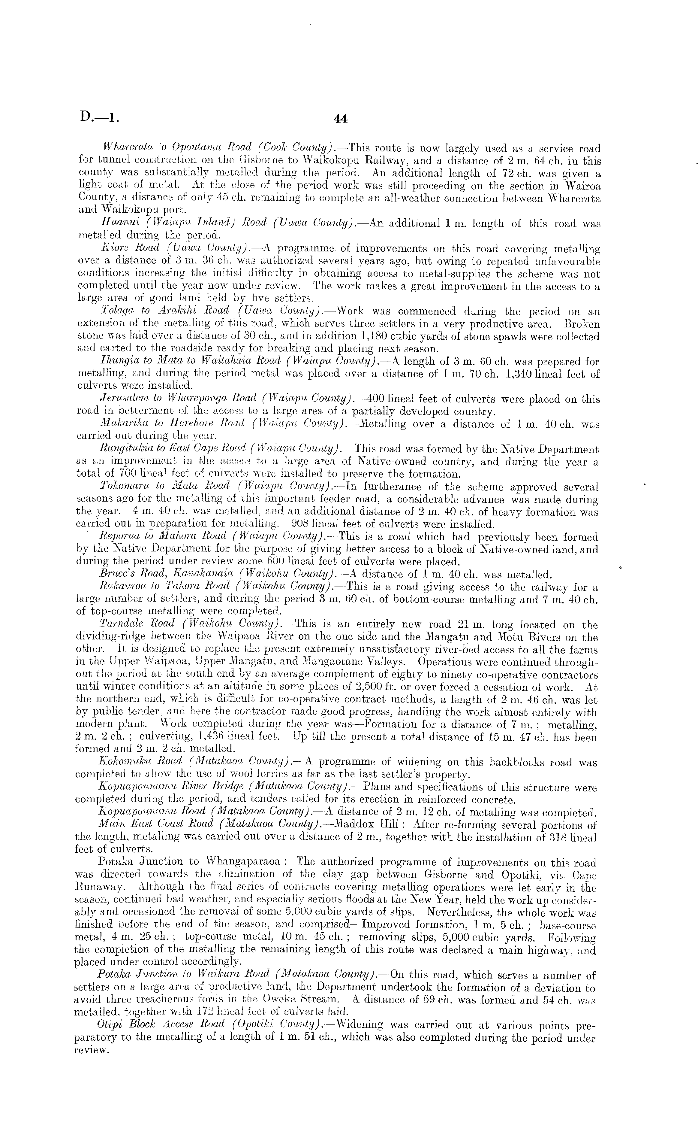 Wharerata to Opoutama Road (Cook County).—This route is now largely used as a service road for tunnel construction on the Gisborne to Waikokopu Railway, and a distance of 2 m. 64 ch. in this county was substantially metalled during the period. An additional length of 72 ch. was given a light coat of metal. At the close of the period work was still proceeding on the section in Wairoa County, a distance of only 45 ch. remaining to complete an all-weather connection between Wharerata and Waikokopu port. Huanui (Waiapu Inland) Road (Uawa County).—An additional 1 m. length of this road was metalled during the period. Kiore Road (Uawa County).—A programme of improvements on this road covering metalling over a distance of .3 m. 36 ch. was authorized several years ago, but owing to repeated unfavourable conditions increasing the initial difficulty in obtaining access to metal-supplies the scheme was not completed until the year now under review. The work makes a great improvement in the access to a large area of good land held by five settlers. Tolaga to Arakihi Road (Uawa County).—Work was commenced during the period on an extension of the metalling of this road, which serves three settlers in a very productive area. Broken stone was laid over a distance of 30 ch., and in addition 1,180 cubic yards of stone spa wis were collected and carted to the roadside ready for breaking and placing next season. Ihungia to Mata to Waitahaia Road (Waiapu County). —A length of 3m. 60 ch. was prepared for metalling, and during the period metal was placed over a distance of 1 m. 70 ch. 1,340 lineal feet of culverts were installed. Jerusalem to Whareponga Road (Waiapu County).—4oo lineal feet of culverts were placed on this road in betterment of the access to a large area of a partially developed country. Makarika to Horehore Road (Waiapu County).—Metalling over a distance of 1 m. 40 ch. was carried out during the year. Rangitukia to East Cape Road (Waiapu County). —This road was formed by the Native Department as an improvement in the access to a large area of Native-owned country, and during the year a total of 700 lineal feet of culverts were installed to preserve the formation. Tokomaru to Mata Road (Waiapu County).—ln furtherance of the scheme approved several seasons ago for the metalling of this important feeder road, a considerable advance was made during the year. 4m. 40 ch. was metalled, and an additional distance of 2m. 40 ch. of heavy formation was carried out in preparation for metalling. 908 lineal feet of culverts were installed. Reporua to Mahora Road (Waiapu County). —This is a road which had previously been formed by the Native Department for the purpose of giving better access to a block of Native-owned land, and during the period under review some 600 lineal feet of culverts were placed. Bruce's Road, Kanakanaia (Waikohu County). —A distance of 1 m. 40 ch. was metalled. Rakauroa to Tahora Road (Waikohu County).—This is a road giving access to the railway for a large number of settlers, and during the period 3 m. 60 ch. of bottom-course metalling and 7 m. 40 ch. of top-course metalling were completed. Tarndale Road (Waikohu County).—This is an entirely new road 21 m. long located on the dividing-ridge between the Waipaoa River on the one side and the Mangatu and Motu Rivers on the other. It is designed to replace the present extremely unsatisfactory river-bed access to all the farms in the Upper Waipaoa, Upper Mangatu, and Mangaotane Valleys. Operations were continued throughout the period at the south end by an average complement of eighty to ninety co-operative contractors until winter conditions at an altitude in some places of 2,500 ft. or over forced a cessation of work. At the northern end, which is difficult for co-operative contract methods, a length of 2 m. 46 ch. was let by public tender, and here the contractor made good progress, handling the work almost entirely with modern plant. Work completed during the year was —Formation for a distance of 7m. ; metalling, 2m. 2 ch. ; culverting, 1,436 lineal feet. Up till the present a total distance of 15 m. 47 ch. has been formed and 2 m. 2 ch. metalled. Kokomuku Road (Matalcaoa County).—A programme of widening on this backblocks road was completed to allow the use of wool lorries as far as the last settler's property. Kopuapounamu River Bridge (Matakaoa County) .—Plans and specifications of this structure were completed during the period, and tenders called for its erection in reinforced concrete. Kopuapounamu Road (Matakaoa County). —A distance of 2m. 12 eh. of metalling was completed. Main East Coast Road (Matakaoa County).—Maddox Hill: After re-forming several portions of the length, metalling was carried out over a distance of 2 in., together with the installation of 318 lineal feet of culverts. Potaka Junction to Whangaparaoa : The authorized programme of improvements on this road was directed towards the elimination of the clay gap between Gisborne and Opotiki, via Cape Runaway. Although the final series of contracts covering metalling operations were let early in the season, continued bad weather, and especially serious floods at the New Year, held the work up considerably and occasioned the removal of some 5,000 cubic yards of slips. Nevertheless, the whole work was finished before the end of the season, and comprised—lmproved formation, 1 m. 5 ch. ; base-course metal, 4m. 25 ch. ; top-course metal, 10 m. 45 ch. ; removing slips, 5,000 cubic yards. Following the completion of the metalling the remaining length of this route was declared a main highway, and placed under control accordingly. Potaka Junction to Waikura Road (Matakaoa County).—On this road, which serves a number of settlers on a large area of productive land, the Department undertook the formation of a deviation to avoid three treacherous fords in the Oweka Stream. A distance of 59 ch. was formed and 54 ch. was metalled, together
