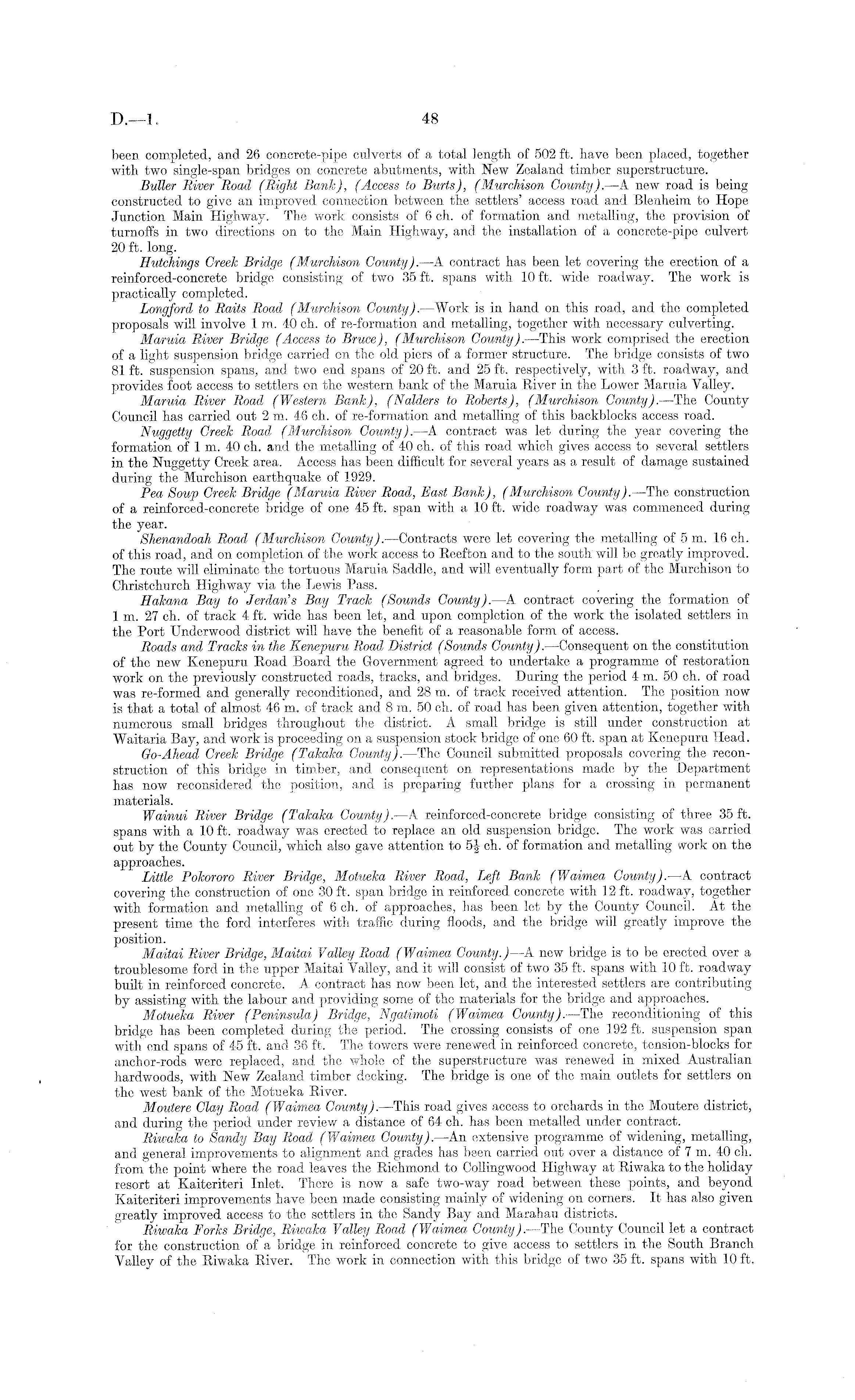 been, completed, and 26 concrete-pipe culverts of a total length of 502 ft. have been placed, together with two single-span bridges on concrete abutments, with New Zealand timber superstructure. Butter River Road (Right Bank), (Access to Burts), (Murchison County). —A new road is being constructed to give an improved connection between the settlers' access road and Blenheim to Hope Junction Main Highway. The work consists of 6 ch. of formation and metalling, the provision of turnoffs in two directions on to the Main Highway, and the installation of a concrete-pipe culvert 20 ft. long. Hutchings Greek Bridge (Murchison County). —A contract has been let covering the erection of a reinforced-concrete bridge consisting of two 35 ft. spans with 10 ft. wide roadway. The work is practically completed. Longford to Raits Road (Murchison County). —Work is in hand on this road, and the completed proposals will involve I m. 40 ch. of re-formation and metalling, together with necessary culverting. Maruia River Bridge (Access to Bruce), (Murchison County). —This work comprised the erection of a light suspension bridge carried on the old piers of a former structure. The bridge consists of two 81 ft. suspension spans, and two end spans of 20 ft. and 25 ft. respectively, with 3 ft. roadway, and provides foot access to settlers on the western bank of the Maruia River in the Lower Maruia Valley. Maruia River Road (Western Bank), (Nalders to Roberts), (Murchison County). —The County Council has carried out 2 m. 46 ch. of re-formation and metalling of this backblocks access road. Nuggetty Creek Road (Murchison County).—A contract was let during the year covering the formation of 1 m. 40 ch. and the metalling of 40 ch. of this road which gives access to several settlers in the Nuggetty Creek area. Access has been difficult for several years as a result of damage sustained during the Murchison earthquake of 1929. Pea Soup Creek Bridge (Maruia River Road, East Bank), (Murchison County). —The construction of a reinforced-concrete bridge of one 45 ft. span with a 10 ft. wide roadway was commenced during the year. Shenandoah, Road (Murchison County). —Contracts were let covering the metalling of 5 m. 16 ch. of this road, and on completion of the work access to Reefton and to the south will be greatly improved. The route will eliminate the tortuous Maruia Saddle, and will eventually form part of the Murchison to Christchurch Highway via the Lewis Pass. Hakana Bay to Jerdan's Bay Track (Sounds County). —A contract covering the formation of 1 m. 27 ch. of track 4 ft. wide has been let, and upon completion of the work the isolated settlers in the Port Underwood district will have the benefit of a reasonable form of access. Roads and Tracks in the Kenepuru Road District (Sounds County). —Consequent on the constitution of the new Kenepuru Road Board the Government agreed to undertake a programme of restoration work on the previously constructed roads, tracks, and bridges. During the period 4m. 50 ch. of road was re-formed and generally reconditioned, and 28 m. of track received attention. The position now is that a total of almost 46 m. of track and 8 m. 50 ch. of road has been given attention, together with numerous small bridges throughout the district. A small bridge is still under construction at Waitaria Bay, and work is proceeding on a suspension stock bridge of one 60 ft. span at Kenepuru Head. Go-Ahead Creek Bridge (Takaka County). —The Council submitted proposals covering the reconstruction of this bridge in timber, and consequent on representations made by the Department has now reconsidered the position, and is preparing further plans for a crossing in permanent materials. Wainui River Bridge (Takaka County). —A reinforced-concrete bridge consisting of three 35 ft. spans with alO ft. roadway was erected to replace an old suspension bridge. The work was carried out by the County Council, which also gave attention to 5| ch. of formation and metalling work on the approaches. Little Pokororo River Bridge, Motueka River Road, Left Bank (Waimea County). —A contract covering the construction of one 30 ft. span bridge in reinforced concrete with 12 ft. roadway, together with formation and metalling of 6 ch. of approaches, has been let by the County Council. At the present time the ford interferes with traffic during floods, and the bridge will greatly improve the position. Maitai River Bridge, Maitai Valley Road (Waimea County.) —A new bridge is to be erected over a troublesome ford in the upper Maitai Valley, and it will consist of two 35 ft. spans with 10 ft. roadway built in reinforced concrete. A contract has now been let, and the interested settlers are contributing by assisting with the labour and providing some of the materials for the bridge and approaches. Motueka River (Peninsula) Bridge, Ngatimoti (Waimea County). —The reconditioning of this bridge has been completed during the period. The crossing consists of one 192 ft. suspension span with end spans of 45 ft. and 36 ft. The towers were renewed in reinforced concrete, tension-blocks for anchor-rods were replaced, and the whole of the superstructure was renewed in mixed Australian hardwoods, with New Zealand timber decking. The bridge is one of the main outlets for settlers on the west bank of the Motueka River. Moutere Clay Road (Waimea County). —This road gives access to orchards in the Moutere district, and during the period under review a distance of 64 ch. has been metalled under contract. Riwaka to Sandy Bay Road (Waimea County). —An extensive programme of widening, metalling, and general improvements to alignment and grades has been carried out over a distance of 7 m. 40 ch. from the point where the road leaves the Richmond to Collingwood Highway at Riwaka to the holiday resort at Kaiteriteri Inlet. There is now a safe two-way road between these points, and beyond Kaiteriteri improvements have been made consisting 