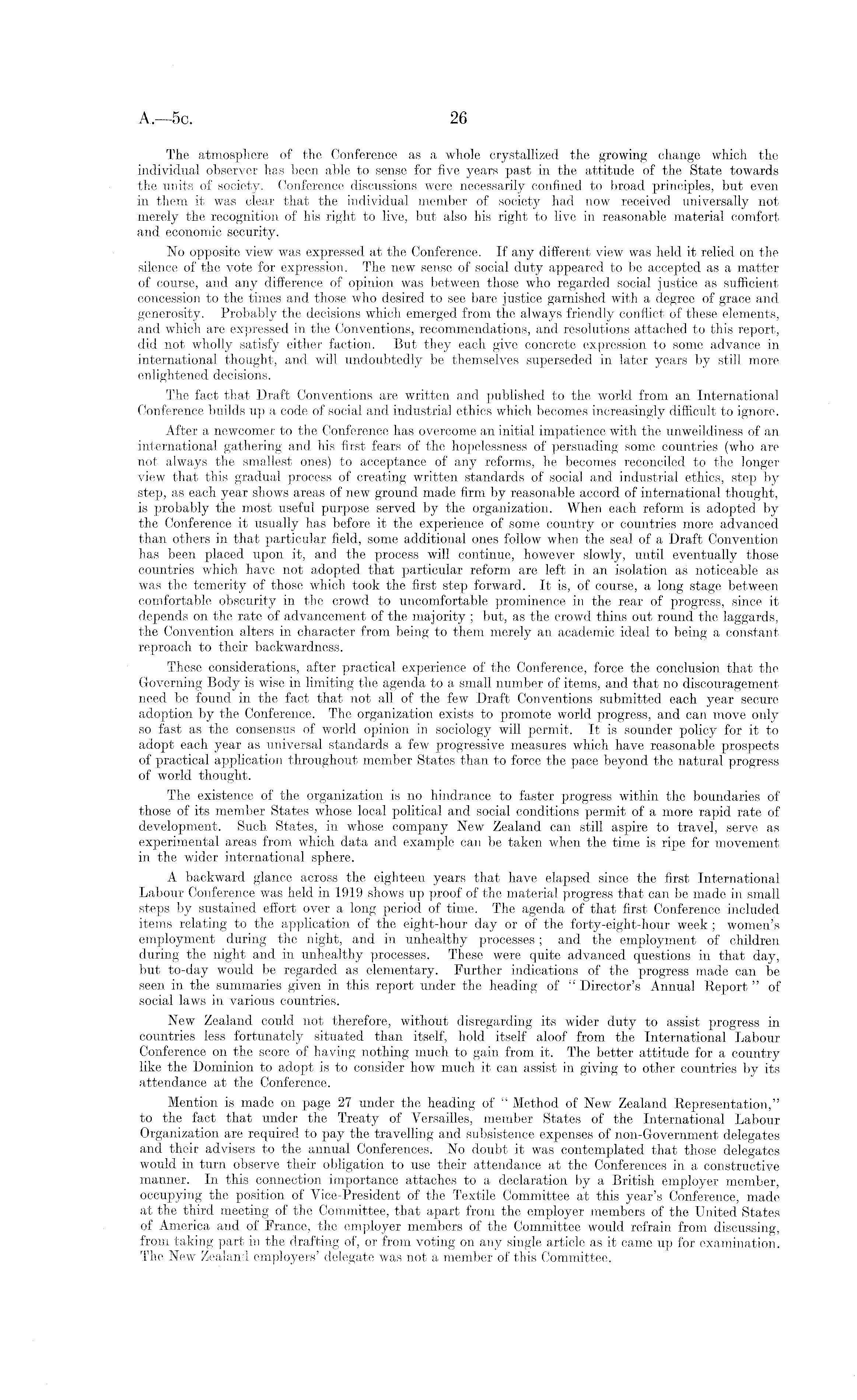 The atmosphere of the Conference as a whole crystallized the growing change which the individual observer has been able to sense for five years past in the attitude of the State towards the units of society. Conference discussions were necessarily confined to broad principles, but even in them it was clear that the individual member of society had now received universally not merely the recognition of his right to live, but also his right to live in reasonable material comfort and economic security. No opposite view was expressed at the Conference. If any different view was held it relied on the silence of the vote for expression. The new sense of social duty appeared to be accepted as a matter of course, and any difference of opinion was between those who regarded social justice as sufficient concession to the times and those who desired to see bare justice garnished with a degree of grace and generosity. Probably the decisions which emerged from the always friendly conflict of these elements, and which are expressed in the Conventions, recommendations, and resolutions attached to this report, did not wholly satisfy either faction. But they each give concrete expression to some advance in international thought, and will undoubtedly be themselves superseded in later years by still more enlightened decisions. The fact that Draft Conventions are written and published to the world from an International Conference builds up a code of social and industrial ethics which becomes increasingly difficult to ignore. After a newcomer to the Conference has overcome an initial impatience with the unweildiness of an international gathering and his first fears of the hopelessness of persuading some countries (who are not always the smallest ones) to acceptance of any reforms, he becomes reconciled to the longer view that this gradual process of creating written standards of social and industrial ethics, step by step, as each year shows areas of new ground made firm by reasonable accord of international thought, is probably the most useful purpose served by the organization. When each reform is adopted by the Conference it usually has before it the experience of some country or countries more advanced than others in that particular field, some additional ones follow when the seal of a Draft Convention has been placed upon it, and the process will continue, however slowly, until eventually those countries which have not adopted that particular reform are left in an isolation as noticeable as was the temerity of those which took the first step forward. It is, of course, a long stage between comfortable obscurity in the crowd to uncomfortable prominence in the rear of progress, since it depends on the rate of advancement of the majority ; but, as the crowd thins out round the laggards, the Convention alters in character from being to them merely an academic ideal to being a constant reproach to their backwardness. These considerations, after practical experience of the Conference, force the conclusion that the Governing Body is wise in limiting the agenda to a small number of items, and that no discouragement need be found in the fact that not all of the few Draft Conventions submitted each year secure adoption by the Conference. The organization exists to promote world progress, and can move only so fast as the consensus of world opinion in sociology will permit. It is sounder policy for it to adopt each year as universal standards a few progressive measures which have reasonable prospects of practical application throughout member States than to force the pace beyond the natural progress of world thought. The existence of the organization is no hindrance to faster progress within the boundaries of those of its member States whose local political and social conditions permit of a more rapid rate of development. Such States, in whose company New Zealand can still aspire to travel, serve as experimental areas from which data and example can be taken when the time is ripe for movement in the wider international sphere. A backward glance across the eighteen years that have elapsed since the first International Labour Conference was held in 1919 shows up proof of the material progress that can be made in small steps by sustained effort over a long period of time. The agenda of that first Conference included items relating to the application of the eight-hour day or of the forty-eight-hour week ; women's employment during the night, and in unhealthy processes ; and the employment of children during the night and in unhealthy processes. These were quite advanced questions in that day, but to-day would be regarded as elementary. Further indications of the progress made can be seen in the summaries given in this report under the heading of " Director's Annual Report " of social laws in various countries. New Zealand could not therefore, without disregarding its wider duty to assist progress in countries less fortunately situated than itself, hold itself aloof from the International Labour Conference on the score of having nothing much to gain from it. The better attitude for a country like the Dominion to adopt is to consider how much it can assist in giving to other countries by its attendance at the Conference. Mention is made on page 27 under the heading of " Method of New Zealand Representation," to the fact that under the Treaty of Versailles, member States of the International Labour Organization are required to pay the travelling and subsistence expenses of non-Government delegates and their advisers to the annual Conferences. No doubt it was contemplated that those delegates would in turn observe their obligation to use their attendance at the Conferences in a constructive manner. In this connection importance attaches to a declaration by a British employer member, occupying the position of Vice-President of the Textile Committee at this year's Conference, made at the third meeting of the Committee, that ap
