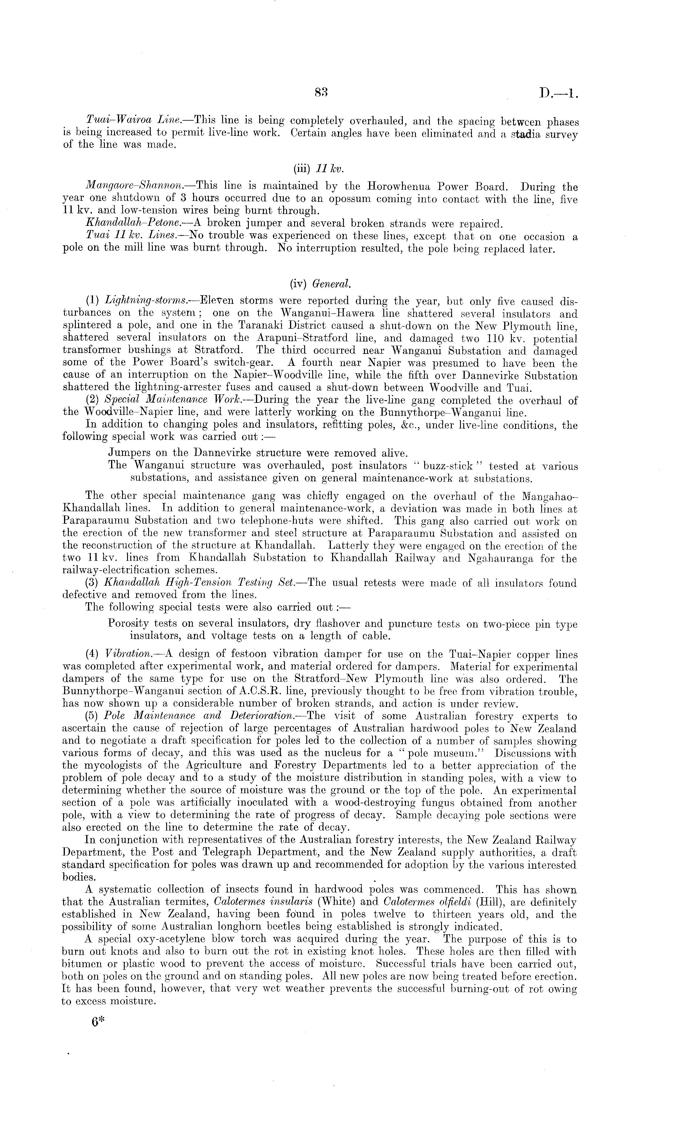 Tuai-Wairoa Line.- —This line is being completely overhauled, and the spacing between phases is being increased to permit live-line work. Certain angles have been eliminated and a stadia survey of the line was made. (iii) 11 kv. Mangaore-Shannon.—This line is maintained by the Horowhenua Power Board. During the year one shutdown of 3 hours occurred due to an opossum coming into contact with the line, five 11 kv. and low-tension wires being burnt through. Khandallah-Petone. —A broken jumper and several broken strands were repaired. Tuai 11 kv. Lines.—No trouble was experienced on these lines, except that on one occasion a pole on the mill line was burnt through. No interruption resulted, the pole being replaced later. (iv) General. (1) Lightning-storms.—Eleven storms were reported during the year, but only five caused disturbances on the system; one on the Wanganui-Hawera line shattered several insulators and splintered a pole, and one in the Taranaki District caused a shut-down on the New Plymouth line, shattered several insulators on the Arapuni-Stratford line, and damaged two 110 kv. potential transformer bushings at Stratford. The third occurred near Wanganui Substation and damaged some of the Power Board's switch-gear. A fourth near Napier was presumed to have been the cause of an interruption on the Napier-Woodville line, while the fifth over Dannevirke Substation shattered the lightning-arrester fuses and caused a shut-down between Woodville and Tuai. (2) Special Maintenance Work.—During the year the live-line gang completed the overhaul of the Woodville-Napier line, and were latterly working on the Bunnythorpe-Wanganui line. In addition to changing poles and insulators, refitting poles, &c., under live-line conditions, the following special work was carried out: — Jumpers on the Dannevirke structure were removed alive. The Wanganui structure was overhauled, post insulators " buzz-stick " tested at various substations, and assistance given on general maintenance-work at substations. The other special maintenance gang was chiefly engaged on the overhaul of the MangahaoKhandallah lines. In addition to general maintenance-work, a deviation was made in both lines at Paraparaumu Substation and two telephone-huts were shifted. This gang also carried out work on the erection of the new transformer and steel structure at Paraparaumu Substation and assisted on the reconstruction of the structure at Khandallah. Latterly they were engaged on the erection of the two 11 kv. lines from Khandallah Substation to Khandallah Railway and Ngahauranga for the railway-electrification schemes. (3) Khandallah High-Tension Testing Set. —The usual retests were made of all insulators found defective and removed from the lines. The following special tests were also carried out: — Porosity tests on several insulators, dry flashover and puncture tests on two-piece pin type insulators, and voltage tests on a length of cable. (4) Vibration. —A design of festoon vibration damper for use on the Tuai-Napier copper lines was completed after experimental work, and material ordered for dampers. Material for experimental dampers of the same type for use on the Stratford-New Plymouth line was also ordered. The Bunnythorpe-Wanganui section of A.C.S.R. line, previously thought to be free from vibration trouble, has now shown up a considerable number of broken strands, and action is under review. (5) Pole Maintenance and Deterioration.—The visit of some Australian forestry experts to ascertain the cause of rejection of large percentages of Australian hardwood poles to New Zealand and to negotiate a draft specification for poles led to the collection of a number of samples showing various forms of decay, and this was used as the nucleus for a " pole museum." Discussions with the mycologists of the Agriculture and Forestry Departments led to a better appreciation of the problem of pole decay and to a study of the moisture distribution in standing poles, with a view to determining whether the source of moisture was the ground or the top of the pole. An experimental section of a pole was artificially inoculated with a wood-destroying fungus obtained from another pole, with a view to determining the rate of progress of decay. Sample decaying pole sections were also erected on the line to determine the rate of decay. In conjunction with representatives of the Australian forestry interests, the New Zealand Railway Department, the Post and Telegraph Department, and the New Zealand supply authorities, a draft standard specification for poles was drawn up and recommended for adoption by the various interested bodies. A systematic collection of insects found in hardwood poles was commenced. This has shown that the Australian termites, Calotermes insularis (White) and Calotermes olfieldi (Hill), are definitely established in New Zealand, having been fdund in poles twelve to thirteen years old, and the possibility of some Australian longhorn beetles being established is strongly indicated. A special oxy-acetylene blow torch was acquired during the year. The purpose of this is to burn out knots and also to burn out the rot in existing knot holes. These holes are then filled with bitumen or plastic wood to prevent the access of moisture. Successful trials have been carried out, both on poles on the ground and on standing poles. All new poles are now being treated before erection. It has been found, however, that very wet weather prevents the successful burning-out of rot owing to excess moisture.